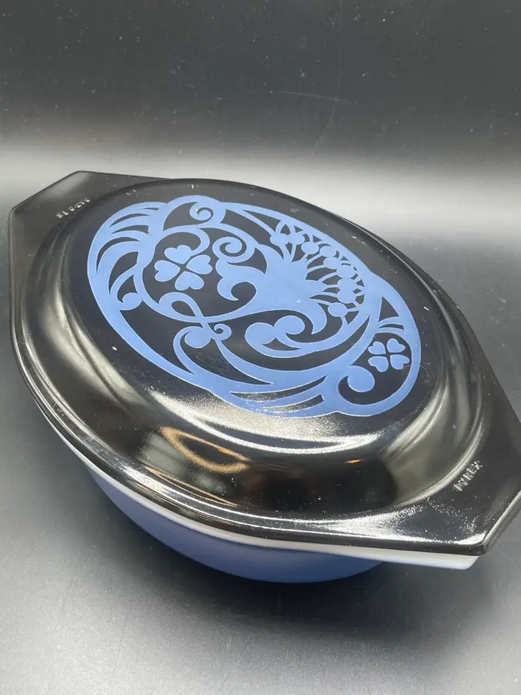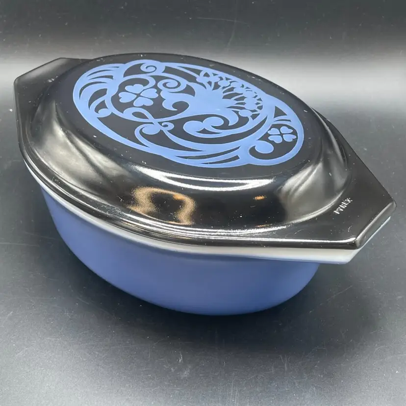 The item is a vintage Pyrex Midnight Bloom 1.5-quart oval casserole dish, a promotional item from 1970. Key details include: The casserole dish is solid blue with a black opalware lid. It features a deep blue stylized floral design on the lid. Vintage Pyrex, made from borosilicate glass, is known for its durability and resistance to temperature changes.