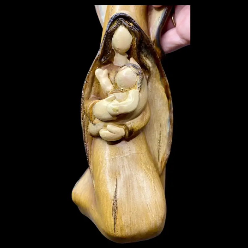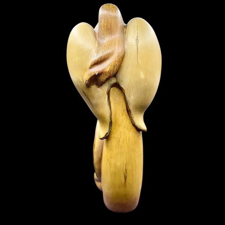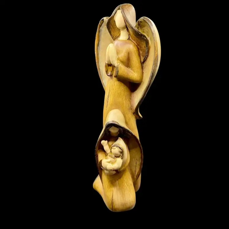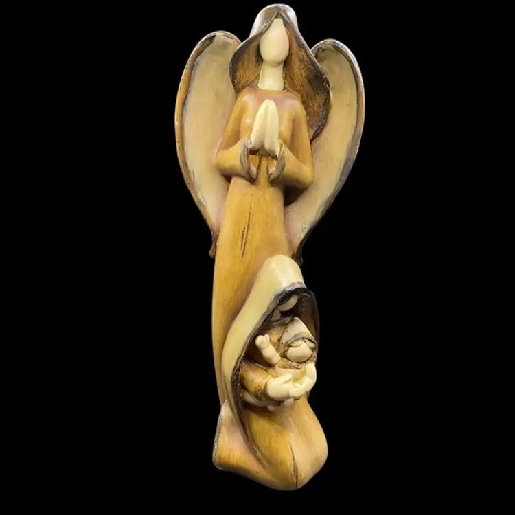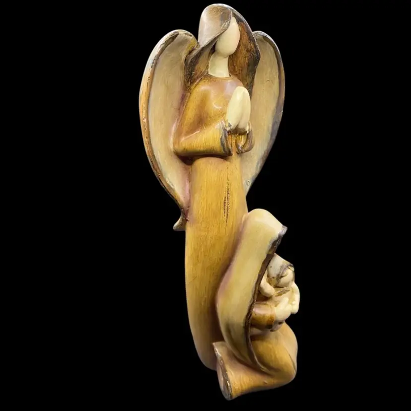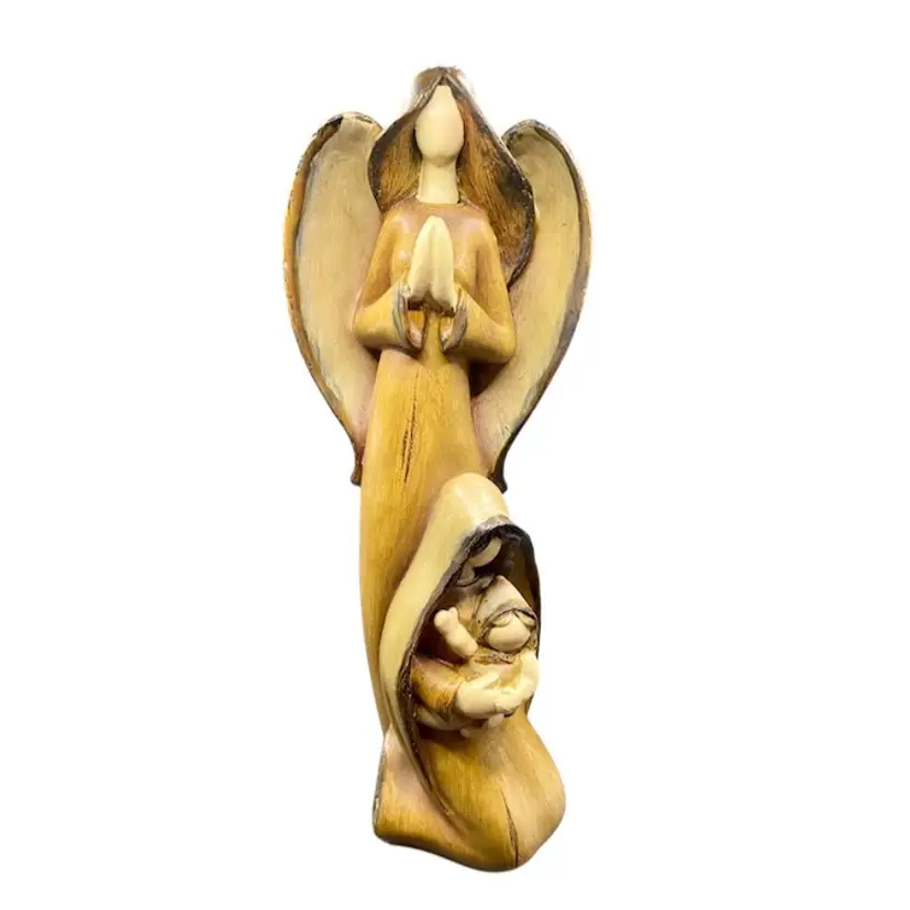 This beautiful statue depicts a guardian angel watching over a mother and child. I believe the figurine is made of resin, distressed to look like wood. The statue features an angel figure, which is a popular symbol in Christianity and is often associated with protection and guidance. The mother and child are universal symbols; however, this might also be the Mother Mary and Child Jesus.