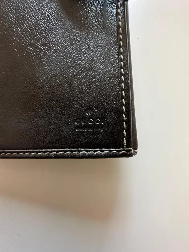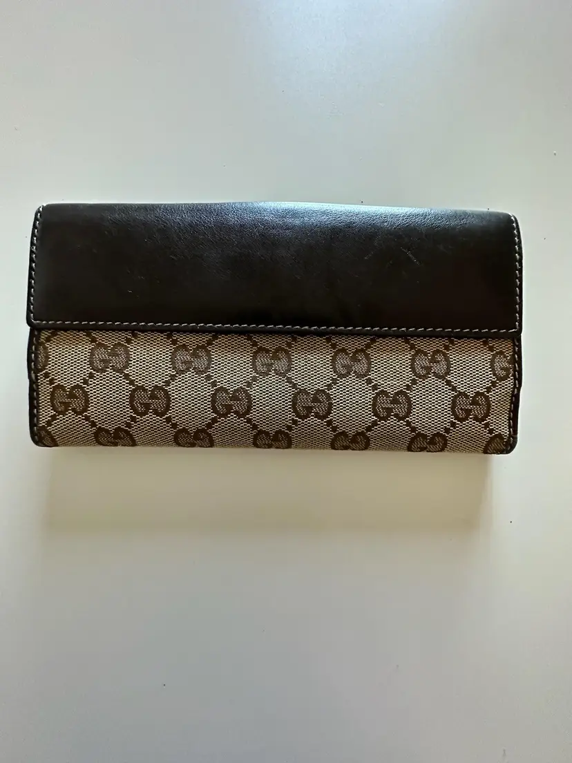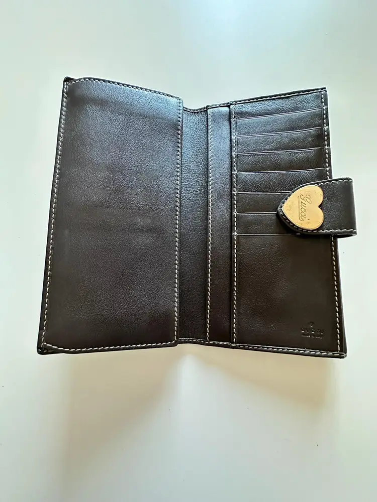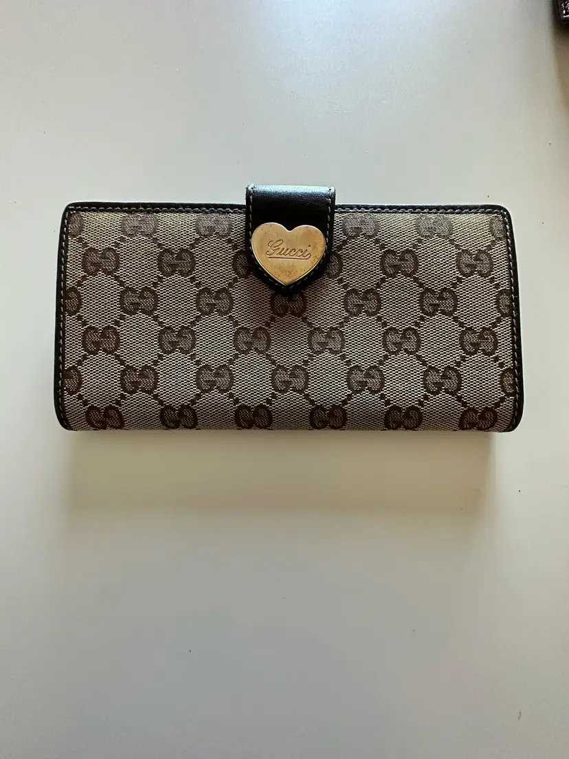 Gucci GG logo heart plate canvas leather long bifold wallet, Overall good condition. The exterior has minor rubbing and scratches, tarnishing at the heart. There are minor rub marks on the inside. Minor corner rubbing.