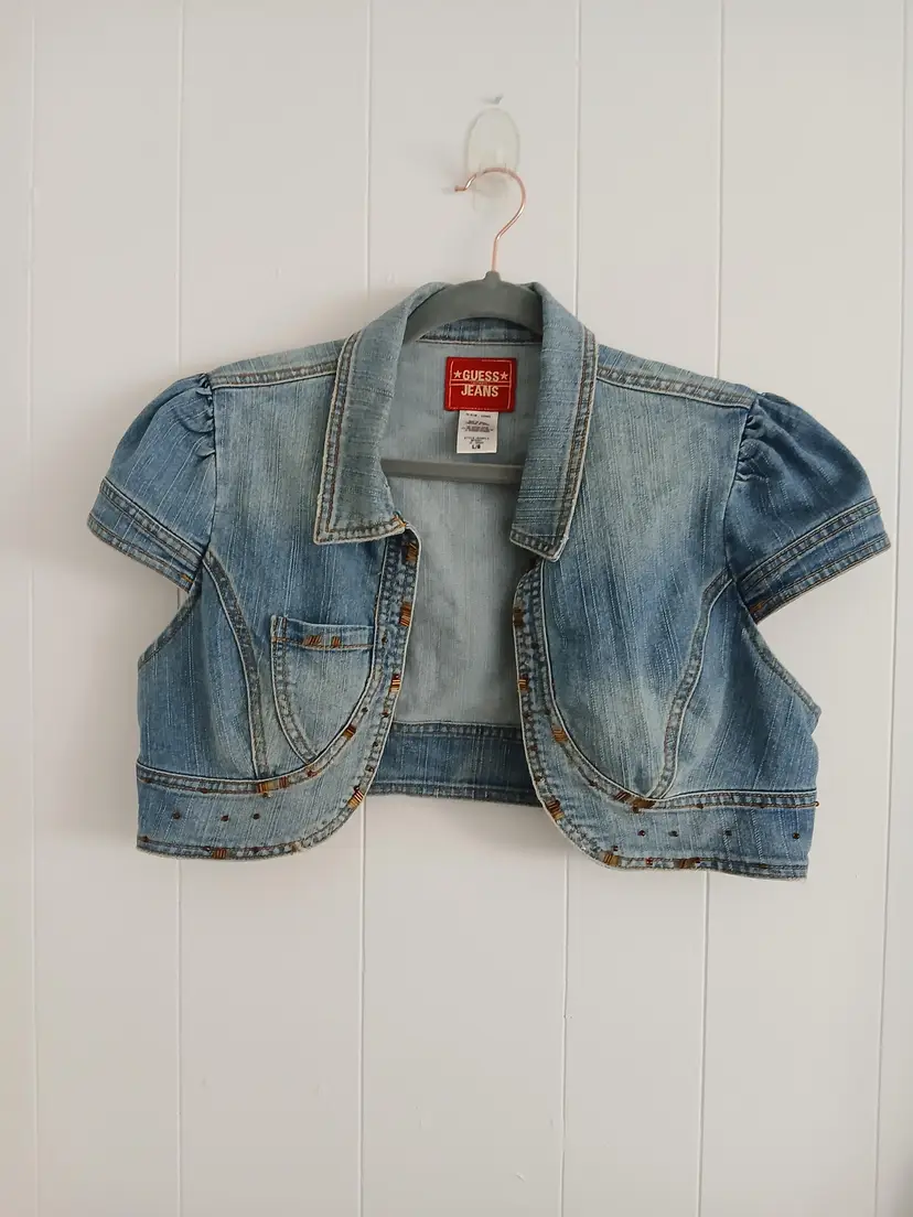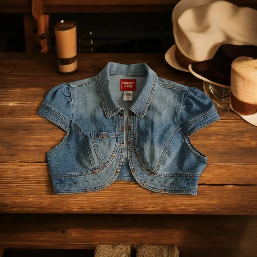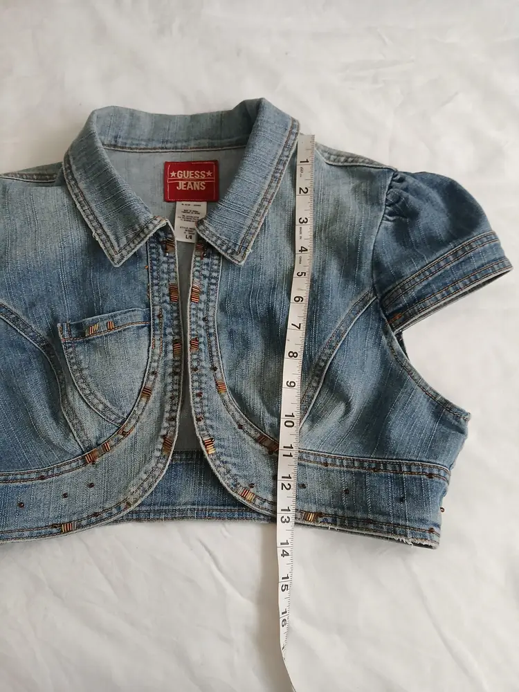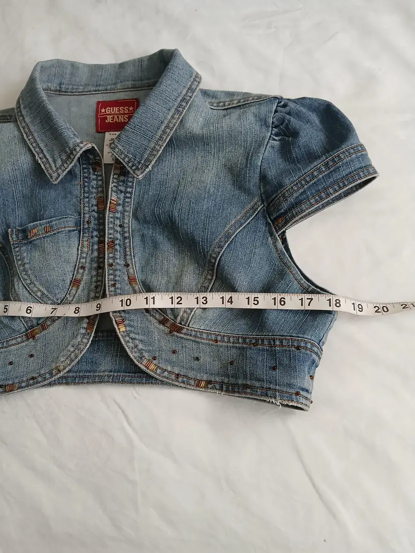 Stylish 1990'S RETRO cropped denim vest by GUESS. Features short sleeves and button & beading distressed details princess seaming. Perfect for layering,rare find junior size LG & misses size Small view measurements in fotos