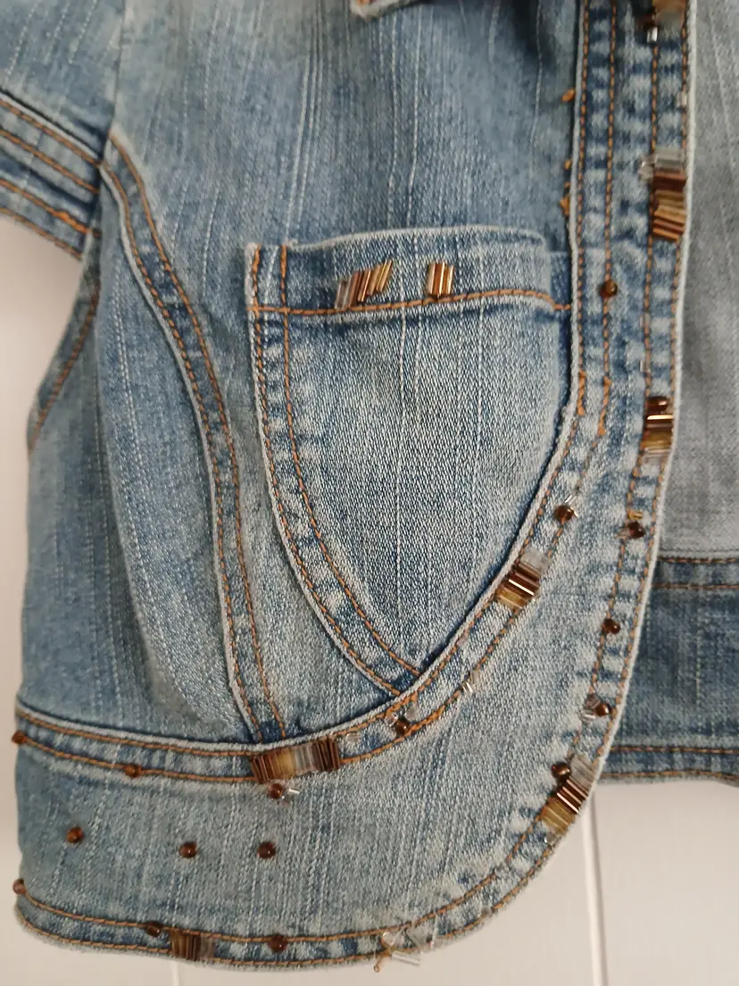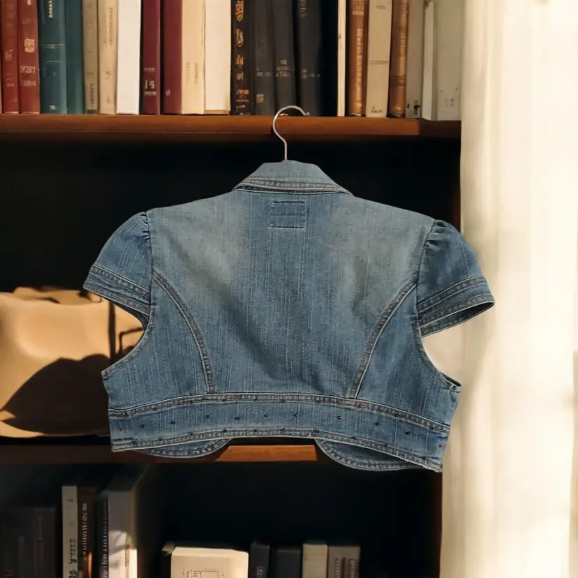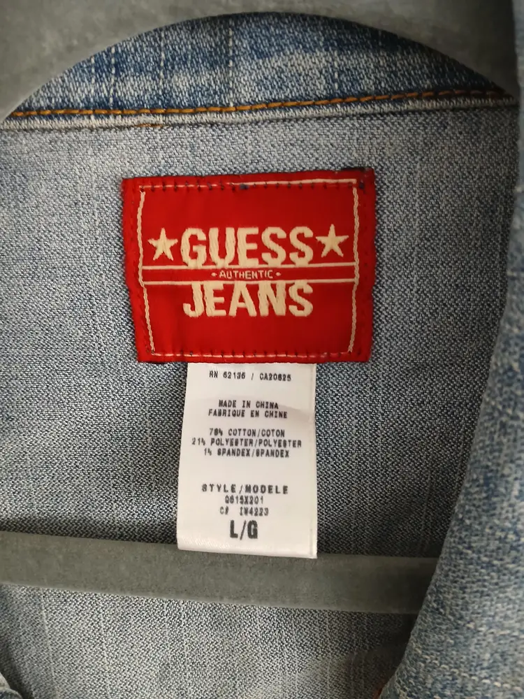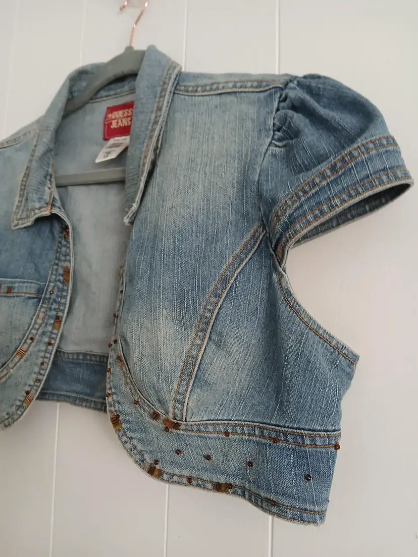 Stylish 1990'S RETRO cropped denim vest by GUESS. Features short sleeves and button & beading distressed details princess seaming. Perfect for layering,rare find junior size LG & misses size Small view measurements in fotos