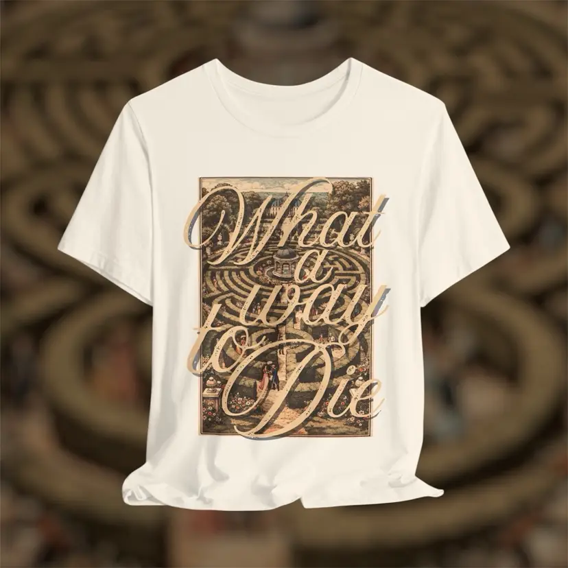 Hedge maze design with lyric from Guilty as Sin printed on a Bella + Canvas tee