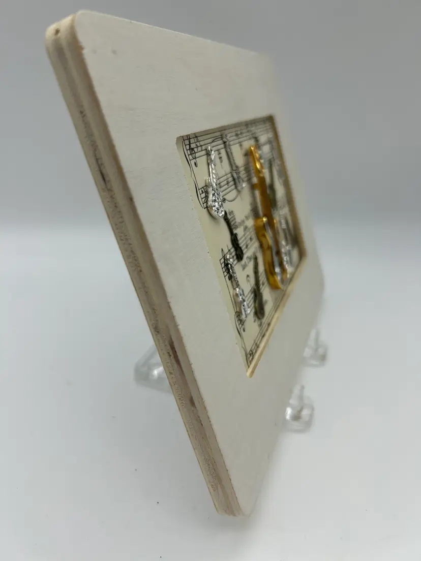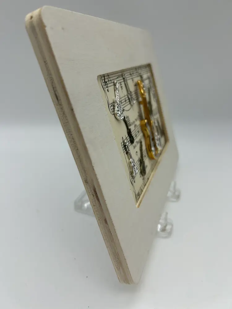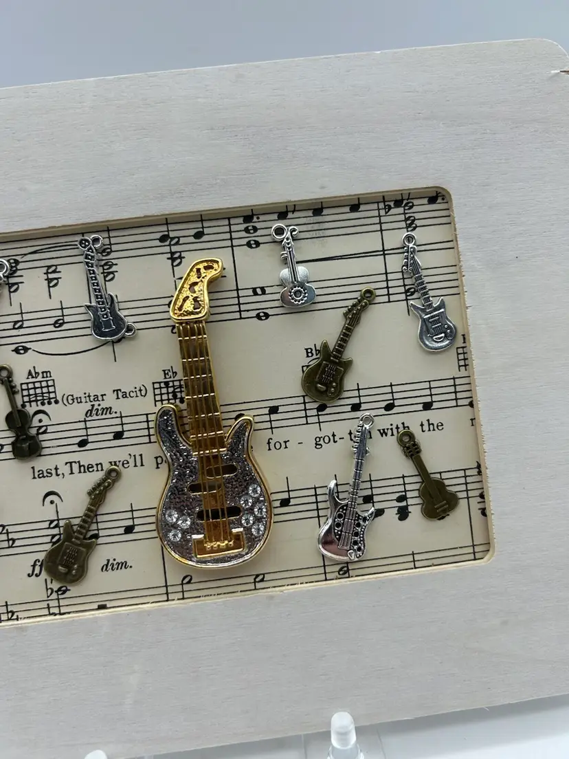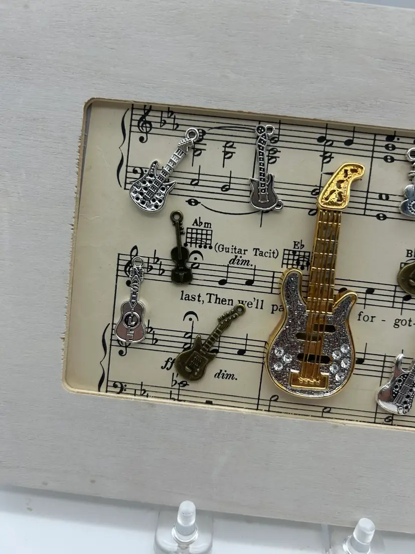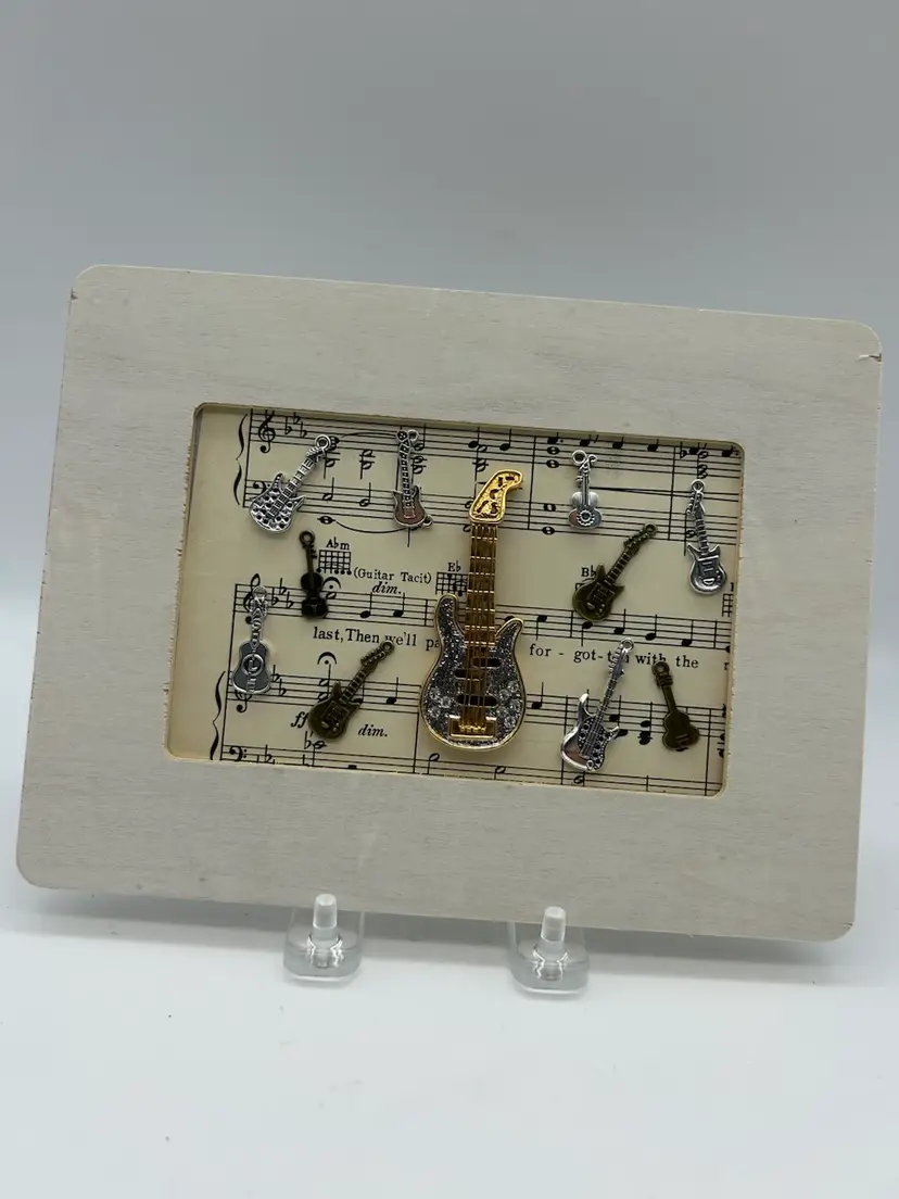 Repurposed frame from the thrift store that I added sheet music and guitar charms/brooches to. Perfect Christmas gift for music and guitar lovers. It measures approximately 8 1/2” wide by 6 1/2” tall.