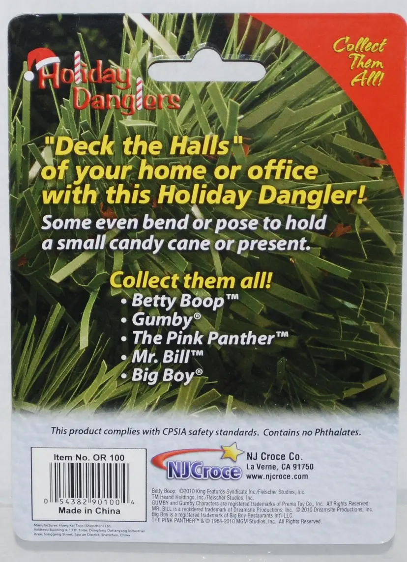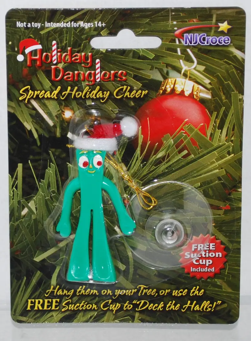 The perfect holiday gift for Gumby fans! These little tree danglers would be great stocking stuffers for gumby fans or for office gift exchange, package decorations. Hang them on your Tree, or use the free suction cup to hang them in your home or office. Ornament measures about 2.5" tall. This ornament is not a toy; it is intended for ages 14+. Comes packaged on hang card.