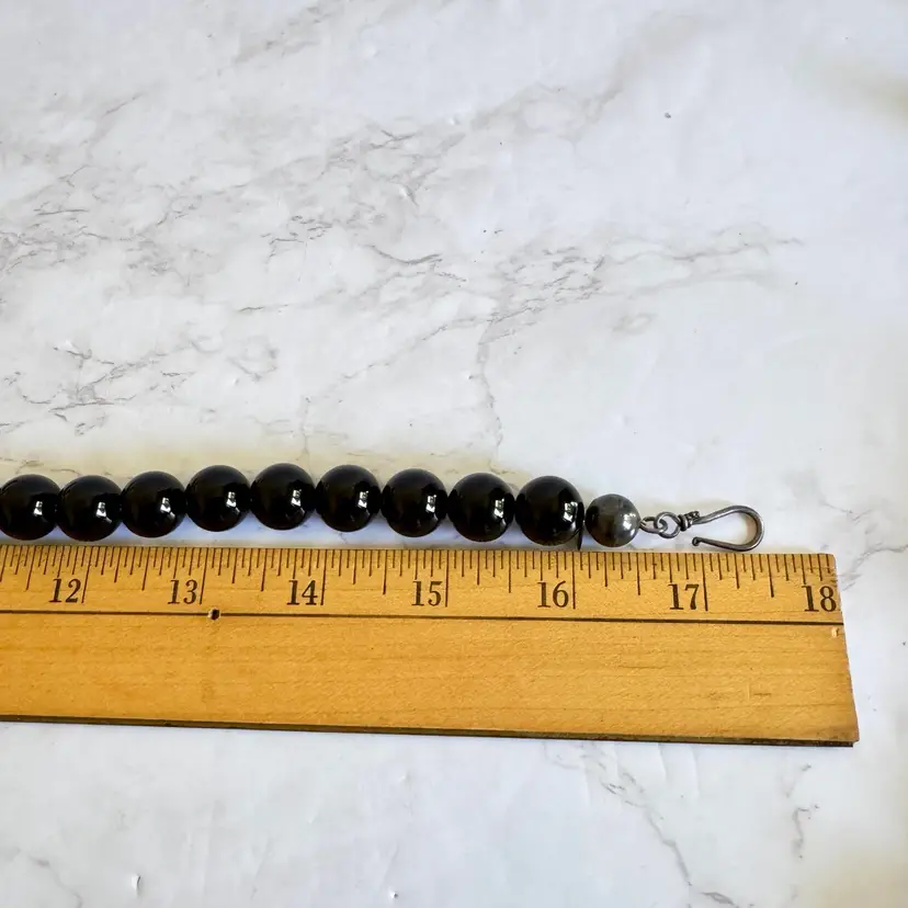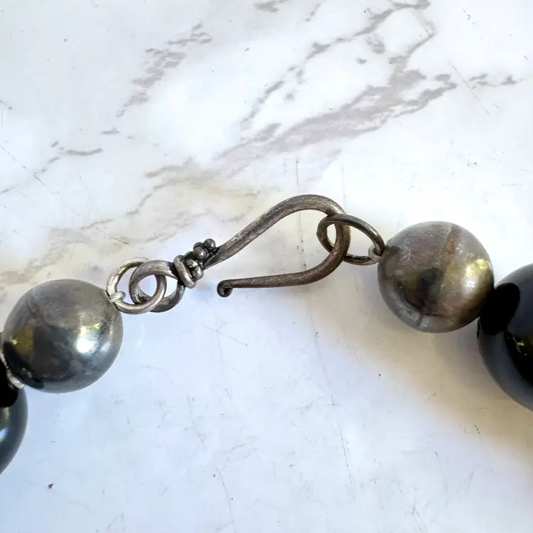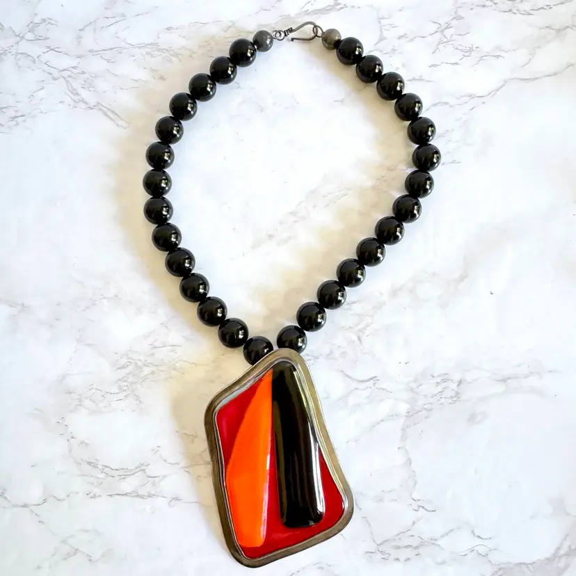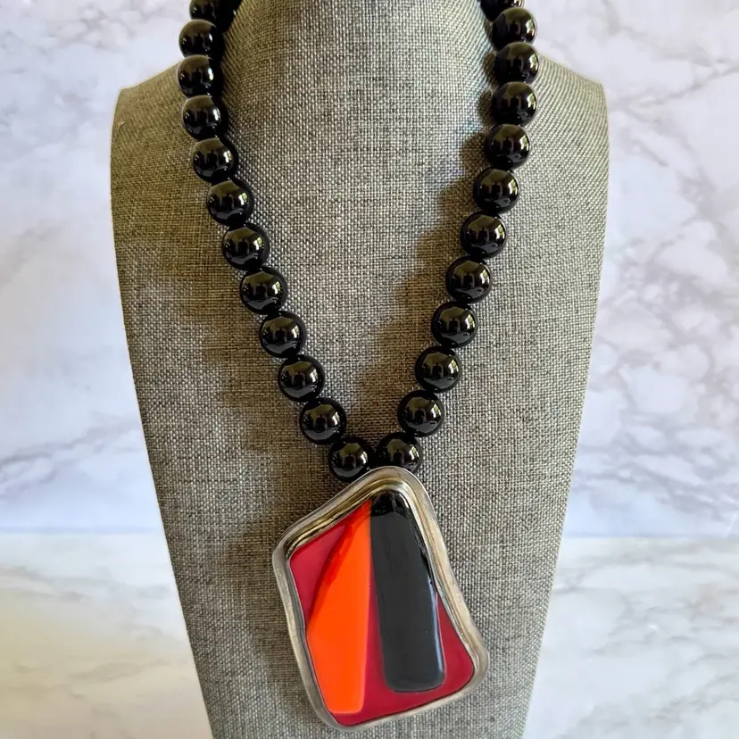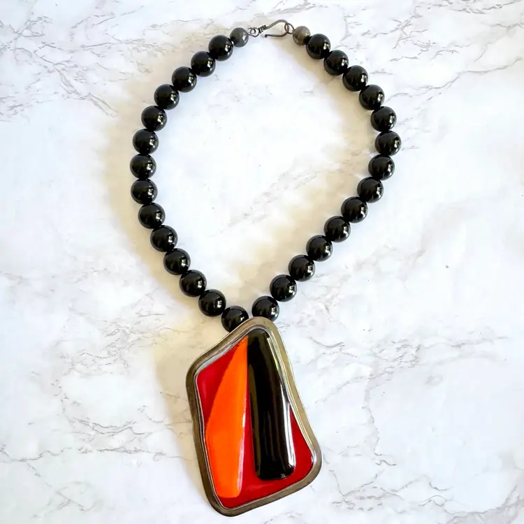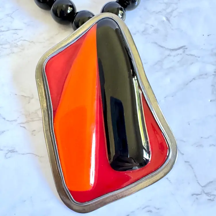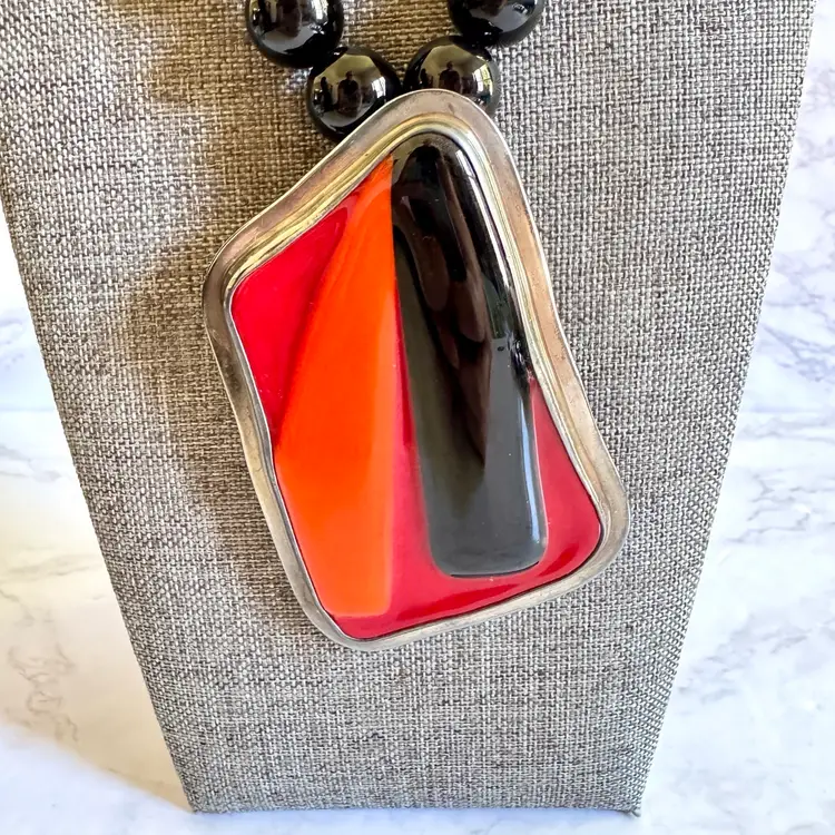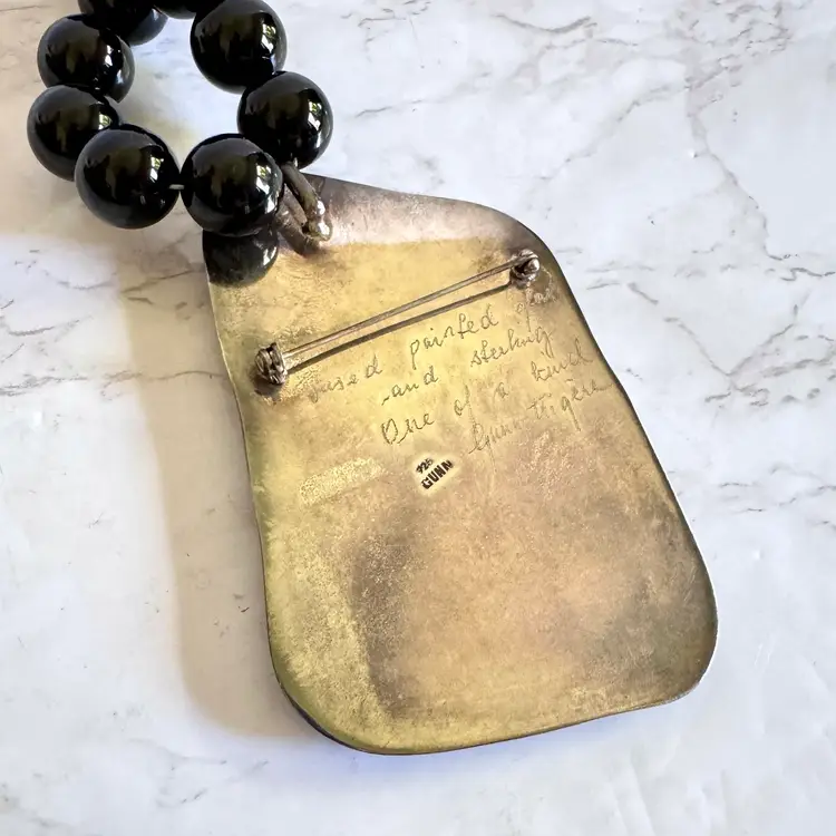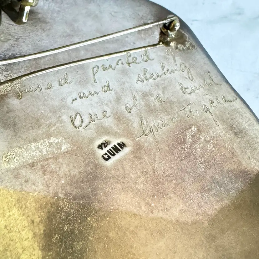 17.5” long, 206g, tested as sterling silver, signs of wear indicative of age. Stamped Gunn 925 and etched “Fused painted glass and sterling. One of a kind. Gunn Trigere”