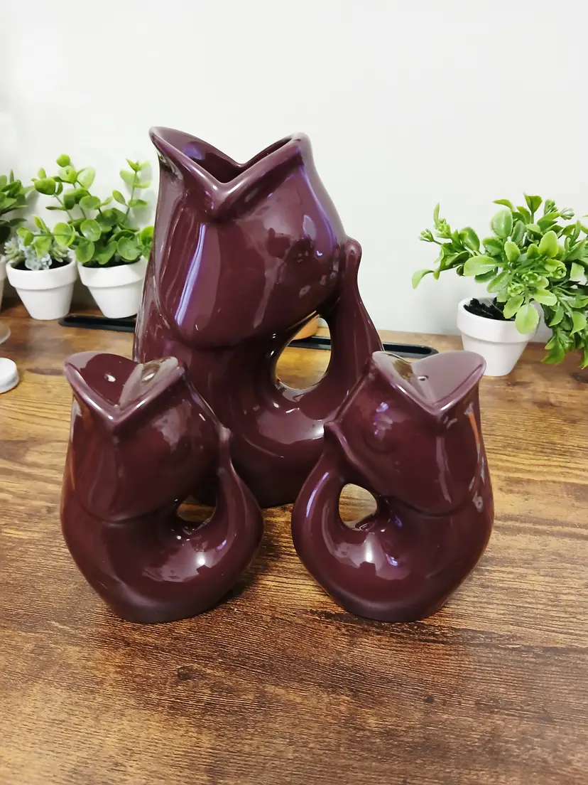 Elevate your decor with this unique ceramic pitcher with salt and pepper set in a rich purple hue. Featuring an artistic design with cut-out handles, these pieces add a touch of elegance and creativity to any space. Perfect for collectors or as a standout decor piece. Pitcher approximately 6 1/2 " shakers 4 inches