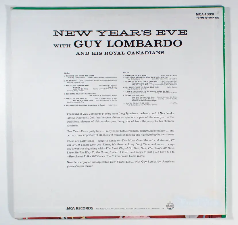 It’s not a New Year’s Eve without Auld Lang Syne and Guy Lombardo. It’s an international tradition and it's featured on this classic LP, New Year's Eve with Guy Lombardo and His Royal Canadians. The lyrics were written by Scottish poet Robert Burns in the 1700s. It literally means “old long ago” or simply, “the good old days.” The song was popularized by the Canadian-born band leader of Italian descent who broadcasted on radio and television. Lombardo hosted 48 consecutive New Year’s Eve programs from New York’s Roosevelt Hotel and later the Waldorf-Astoria with swells dancing cheek to jowl in tuxedos and funny hats.