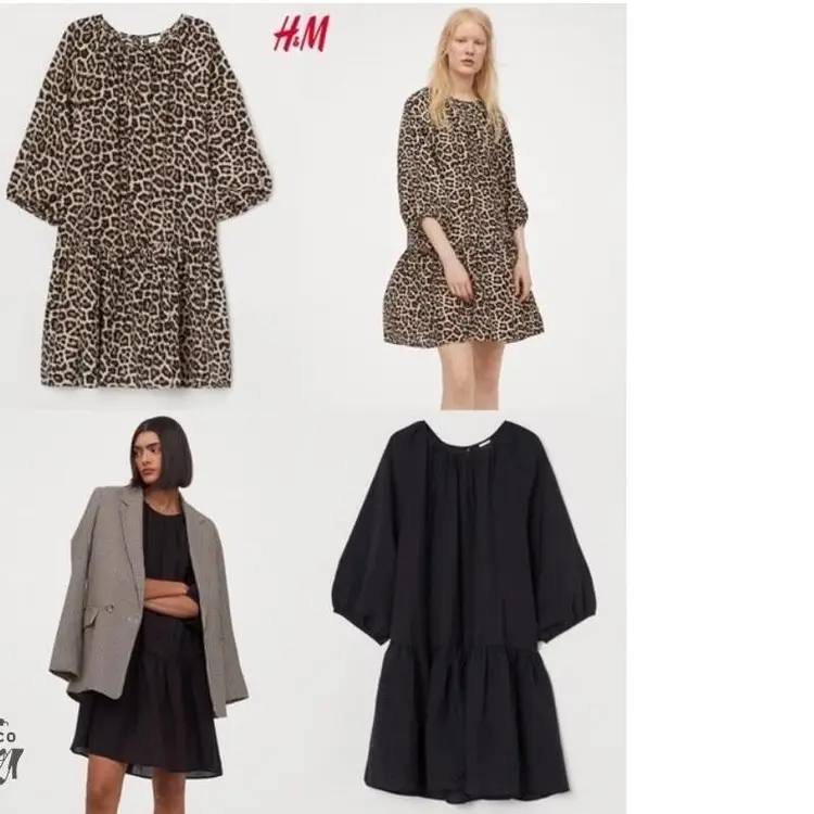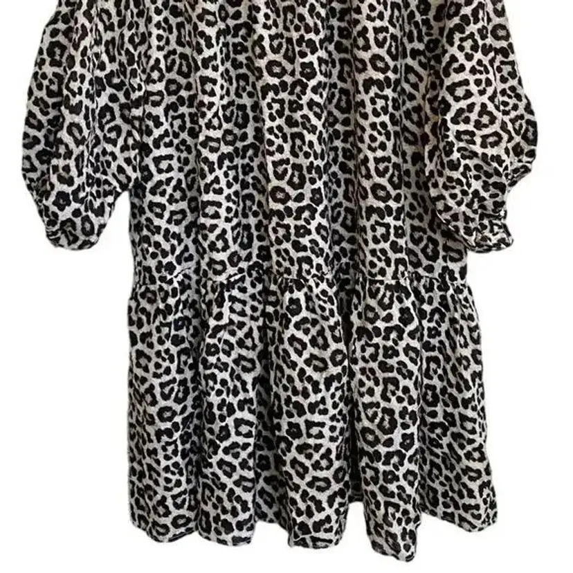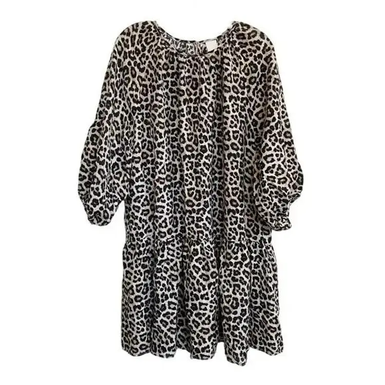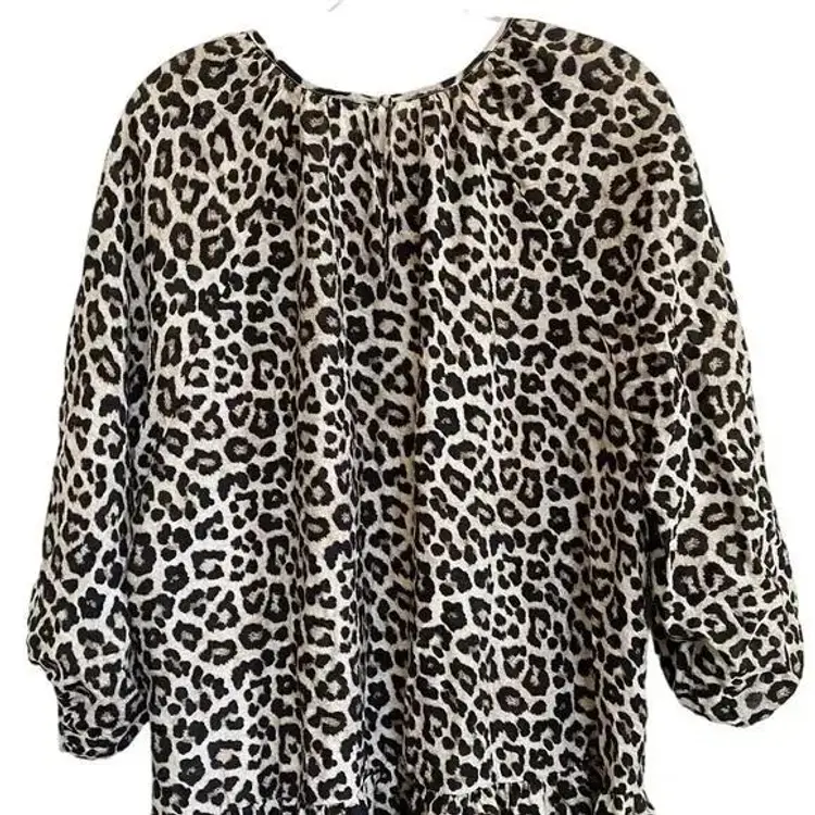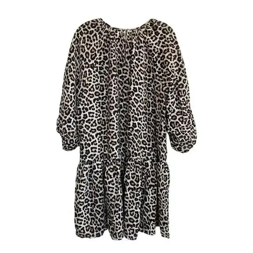 This leopard print balloon style dress features a relaxed silhouette with a crew neckline and 3/4 sleeves. The dress is crafted from rayon and polyester, offering a lightweight and comfortable fit. Ideal for casual day outings, this dress adds a touch of wild charm to your wardrobe. It is pre-owned and in good condition, with no visible flaws such as stains or tears. Pullover with back button closure at nape of neck. Loos fitting and flowy. Mini length (above knee).