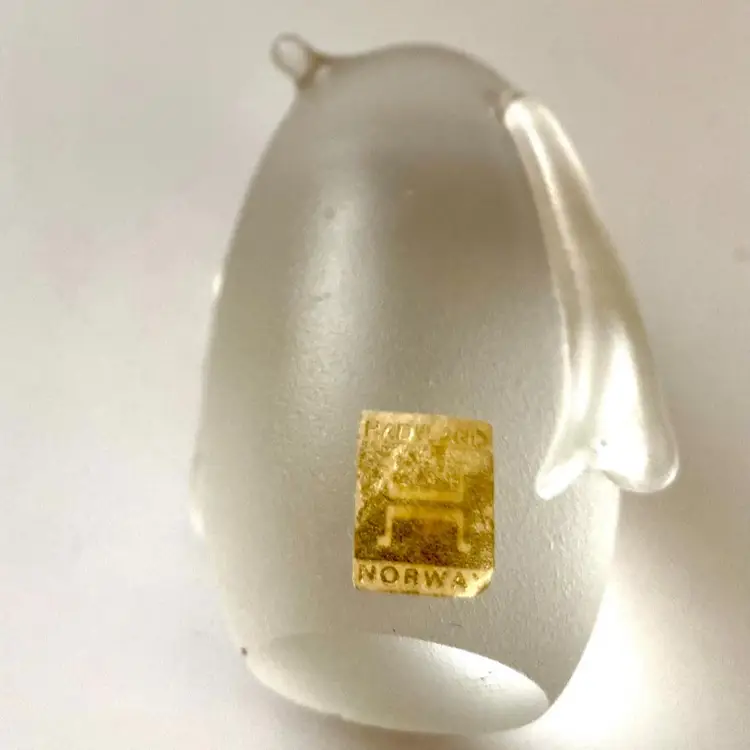 Vintage Hadeland Norway frosted glass penguin paperweight. Signed on bottom with manufacturer sticker. A few minor imperfections as seen in photo and a flea bite on the base.