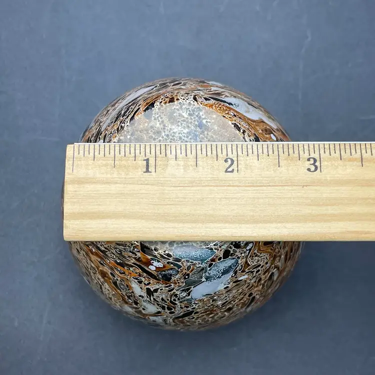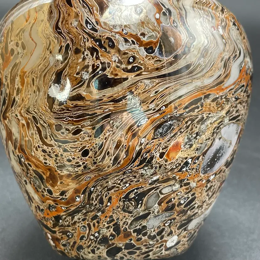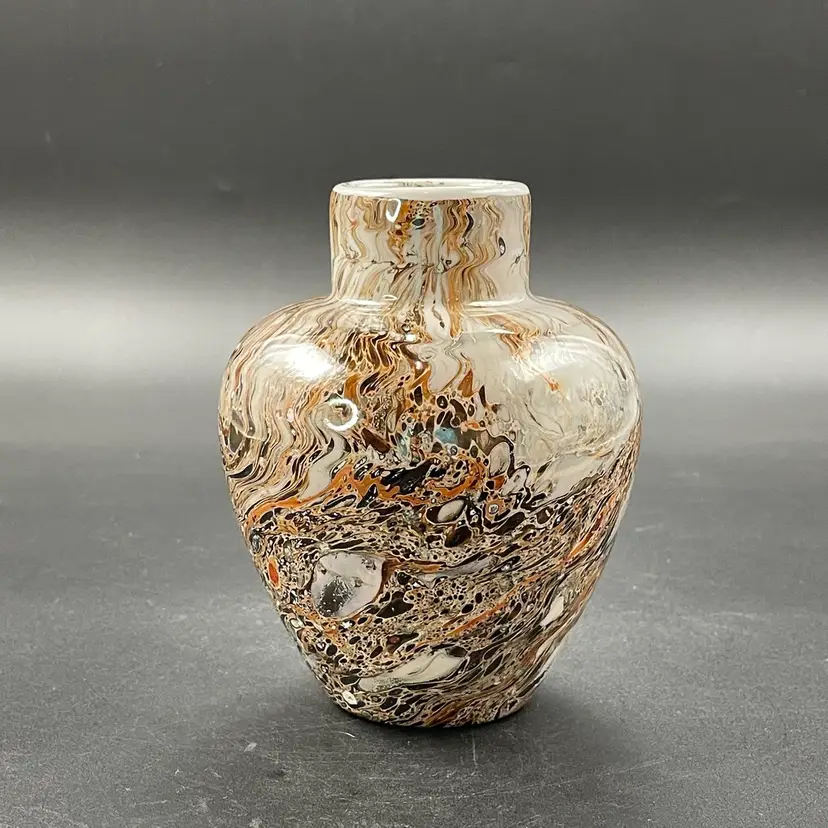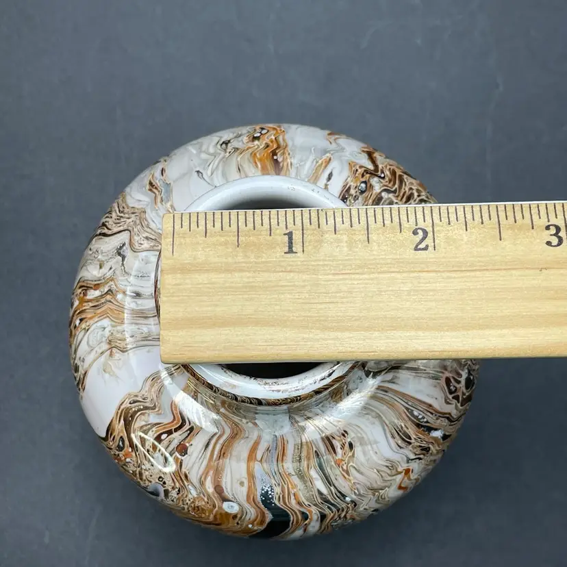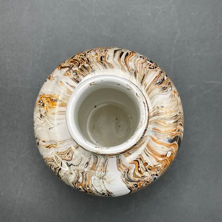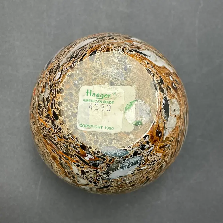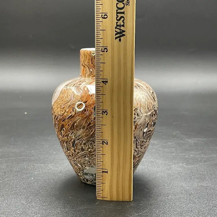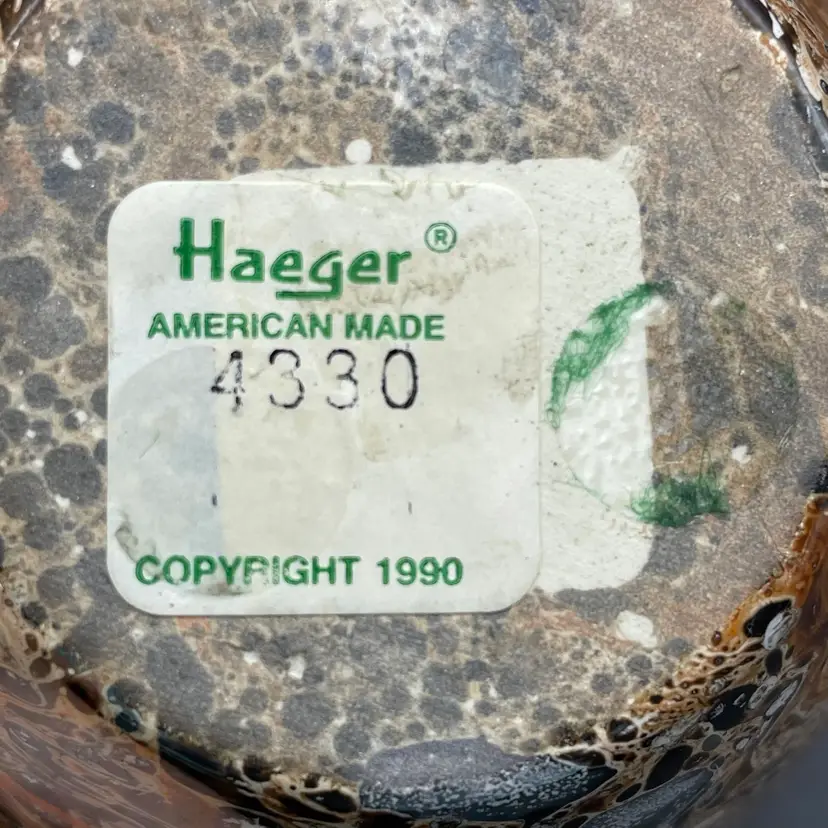 This is a vintage 1990 Haeger Art Pottery #4330 brown, white, and black iridescent luster vase with its original label attached. Measures approximately 5" tall x1.25" across the top x 2.75" across the bottom. No chip or cracks.
