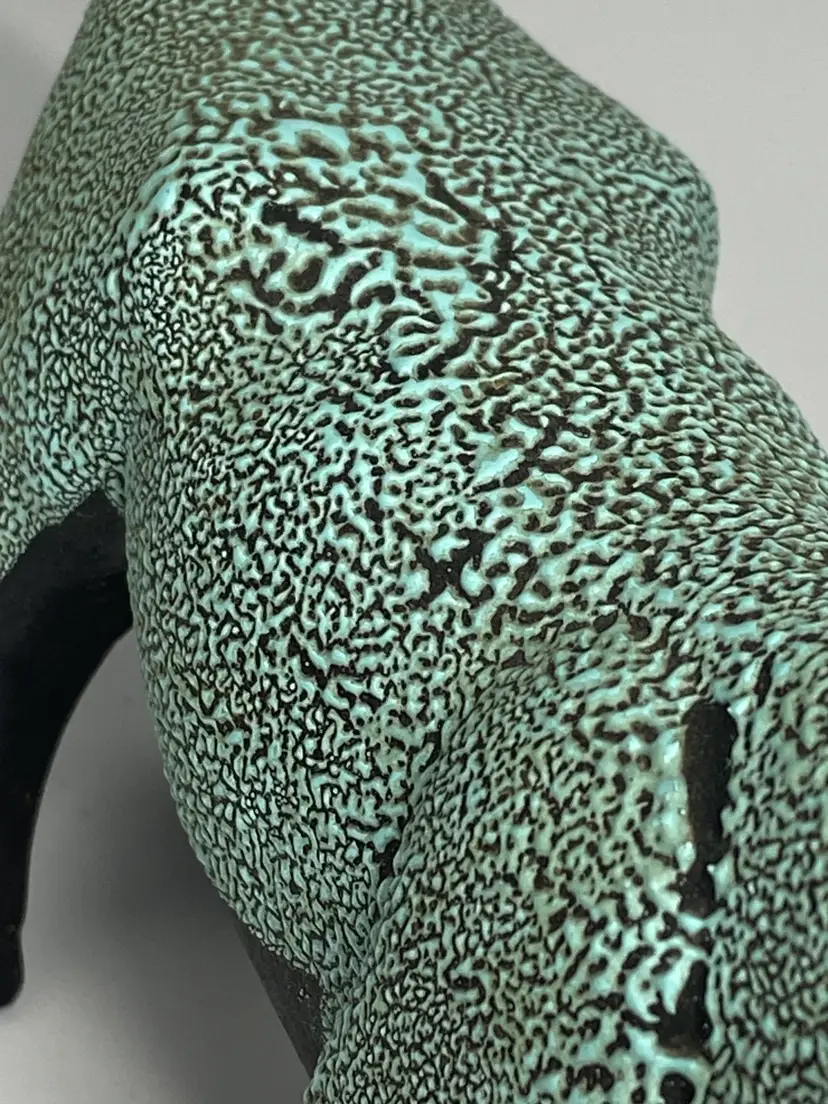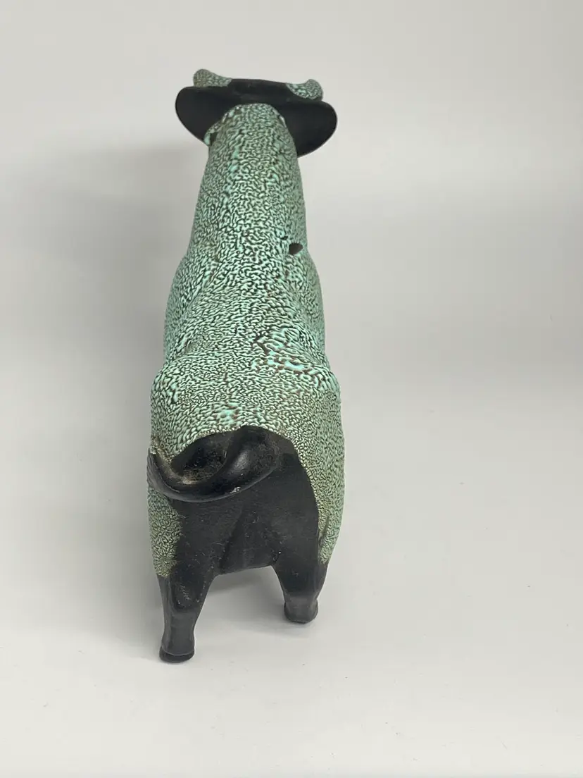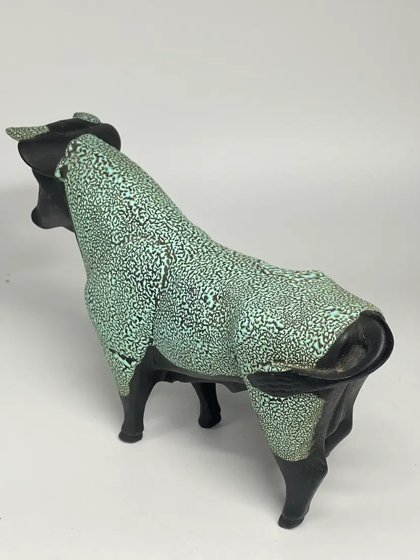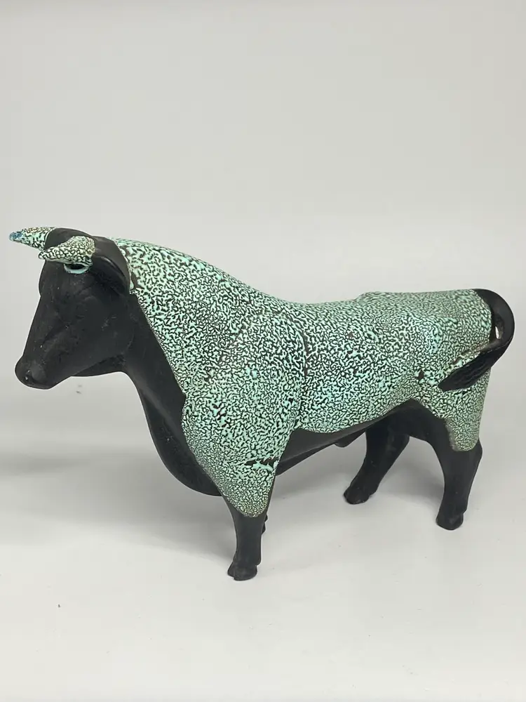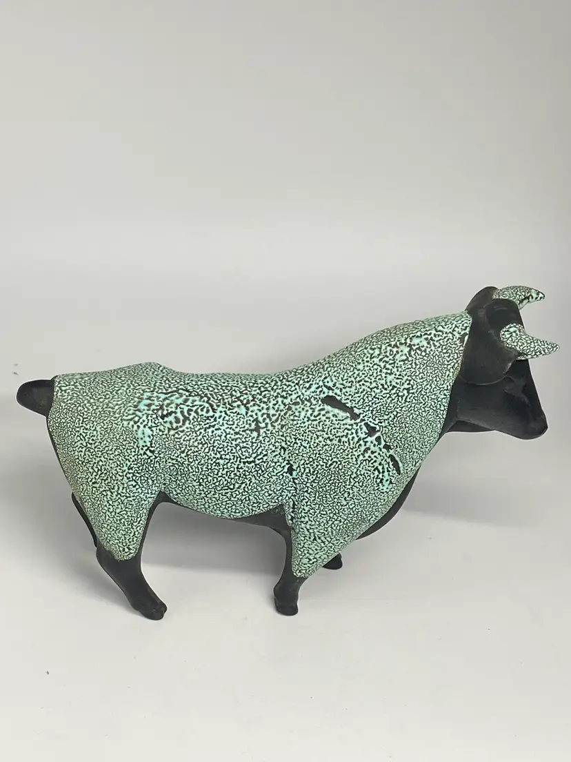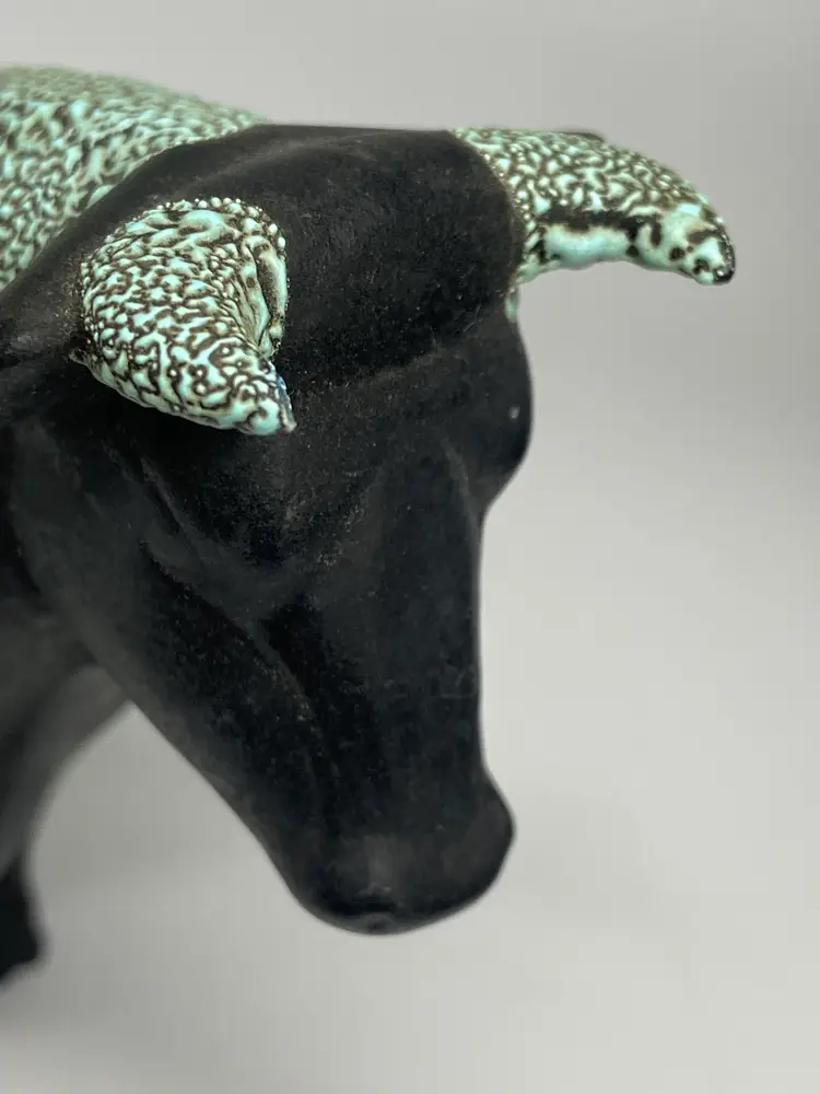 Crafted with precision, the Hagen Renaker Ceramic Black Bisque Bull Figurine embodies the essence of modern design. From the esteemed Designer's Workshop collection, this piece is a testament to the timeless appeal of minimalist sculpture. The figurine's sleek black ceramic composition and small stature, measuring 4.5 inches in height and 6.25 inches in width, make it a sophisticated addition to any decor. Renowned for their attention to detail, Hagen Renaker has created a bull figurine that is both stylized and recognizable. Weighing in at a mere 4 ounces, this elegant figurine is an understated yet impactful piece that is sure to captivate and add a touch of refinement to your space.
