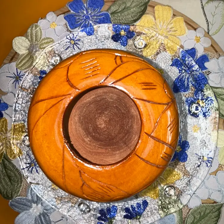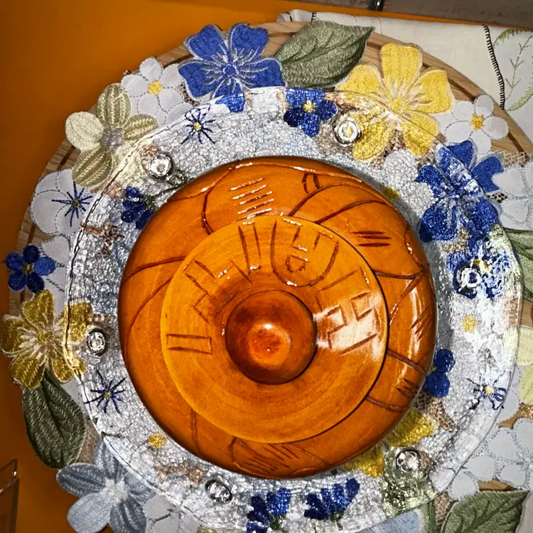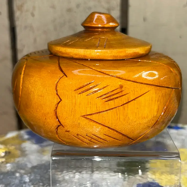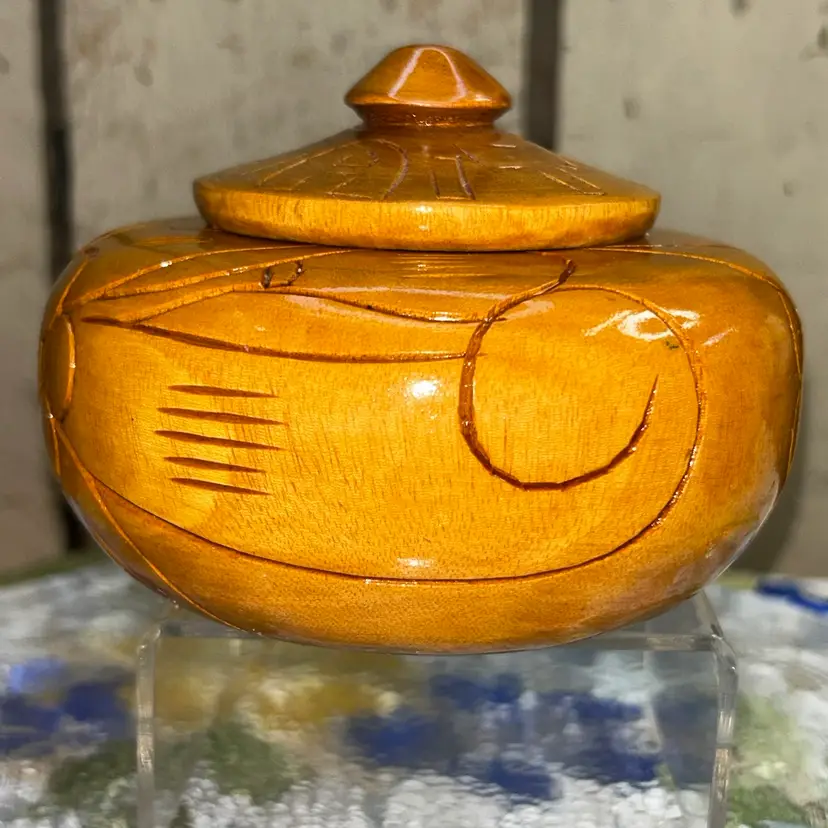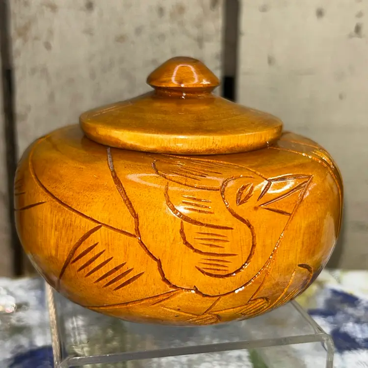 4.5” diameter x 1.75” deep trinket bowl with beautiful bird carve around the circumference of the bowl. Lid is carved with “Haiti”. High gloss finish. Excellent condition. No marks or scratches.
