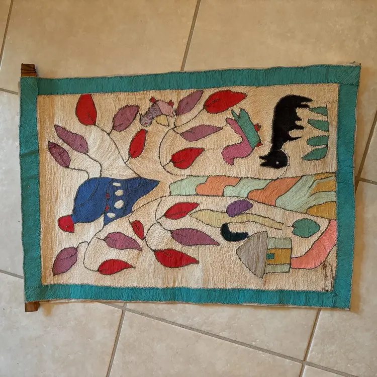String "painting" is a popular craft among the Haitian artisans. Sorry...this image is side-ways. It hang vertically. The backing is a simple muslim.