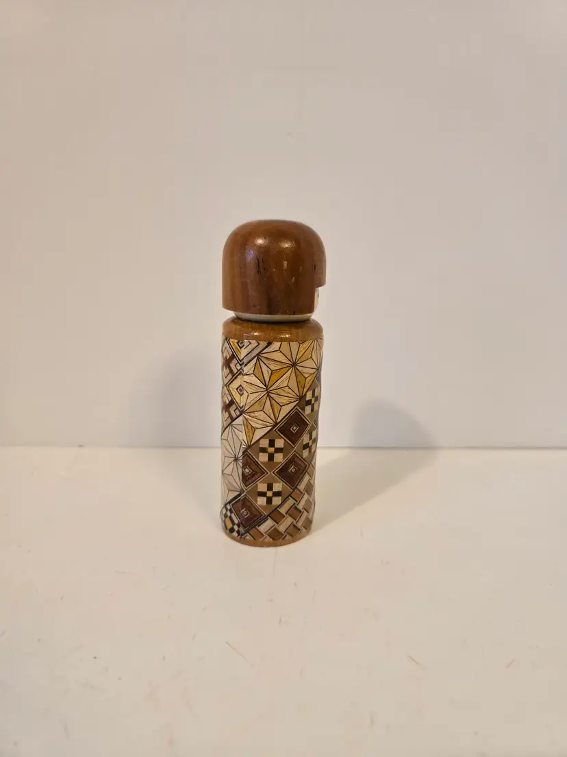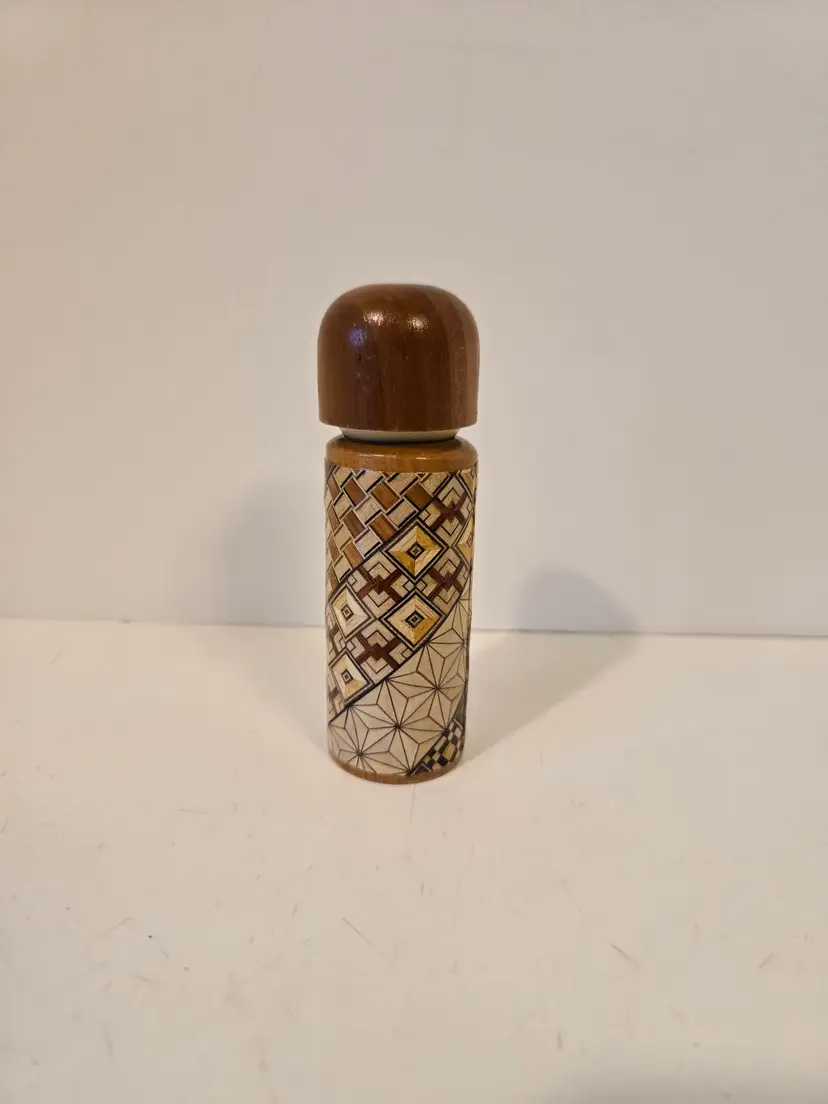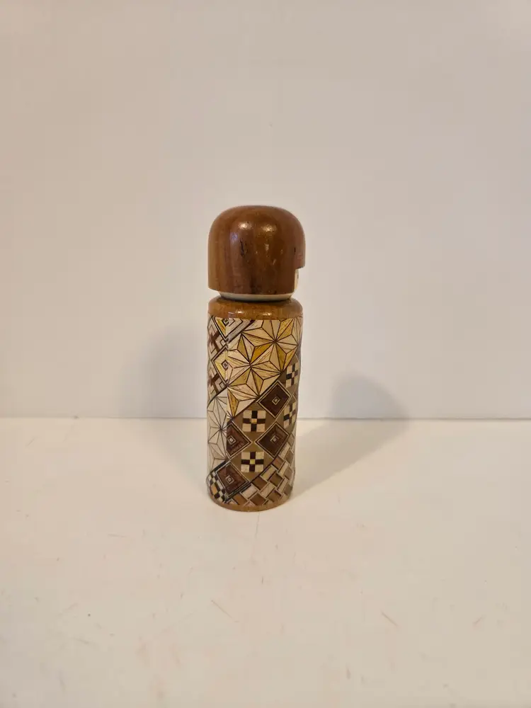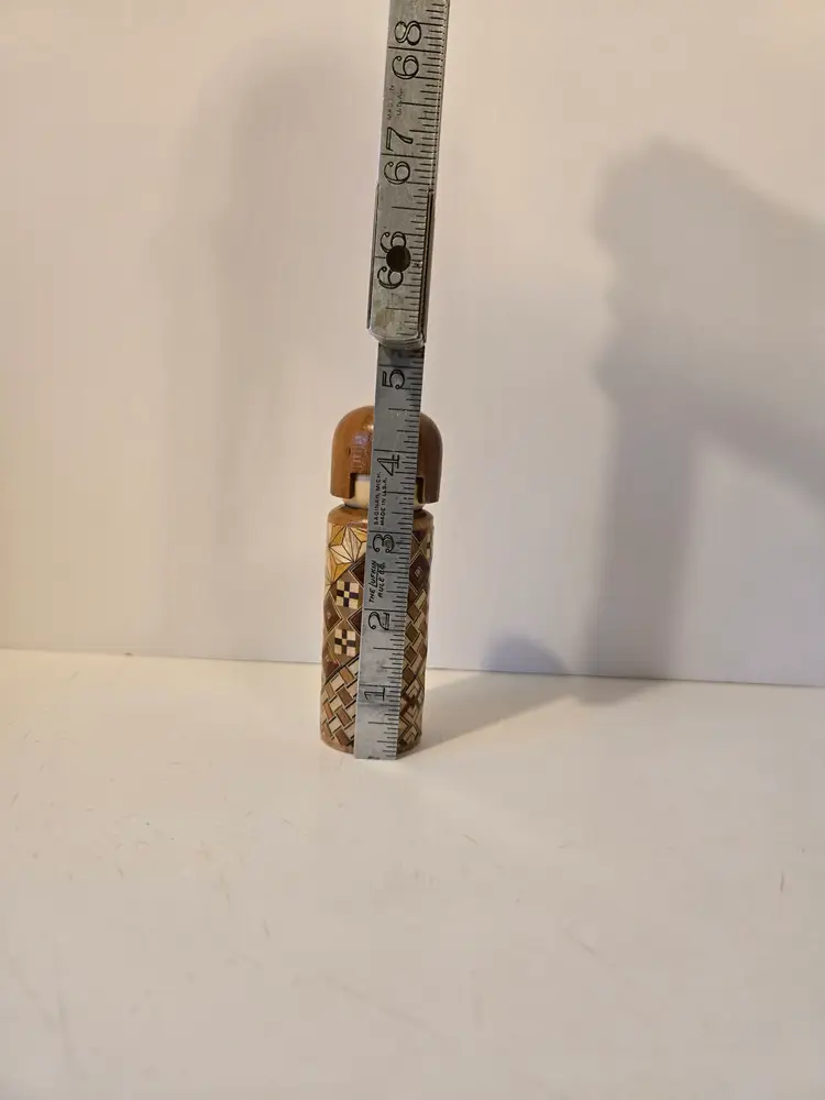 This piece is a beautiful example of Japanese marquetry. It measures approximately 4.5×1.5 inches and is in good used condition.