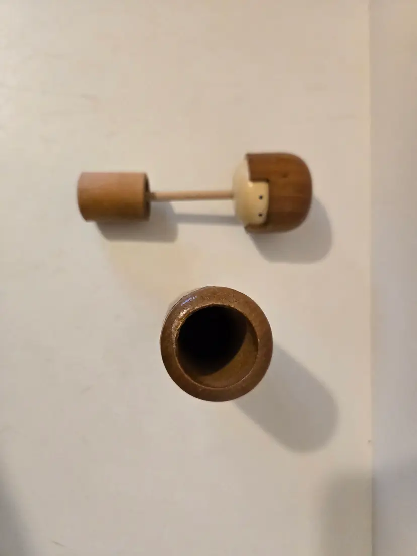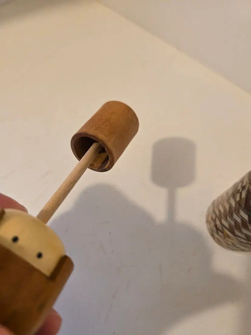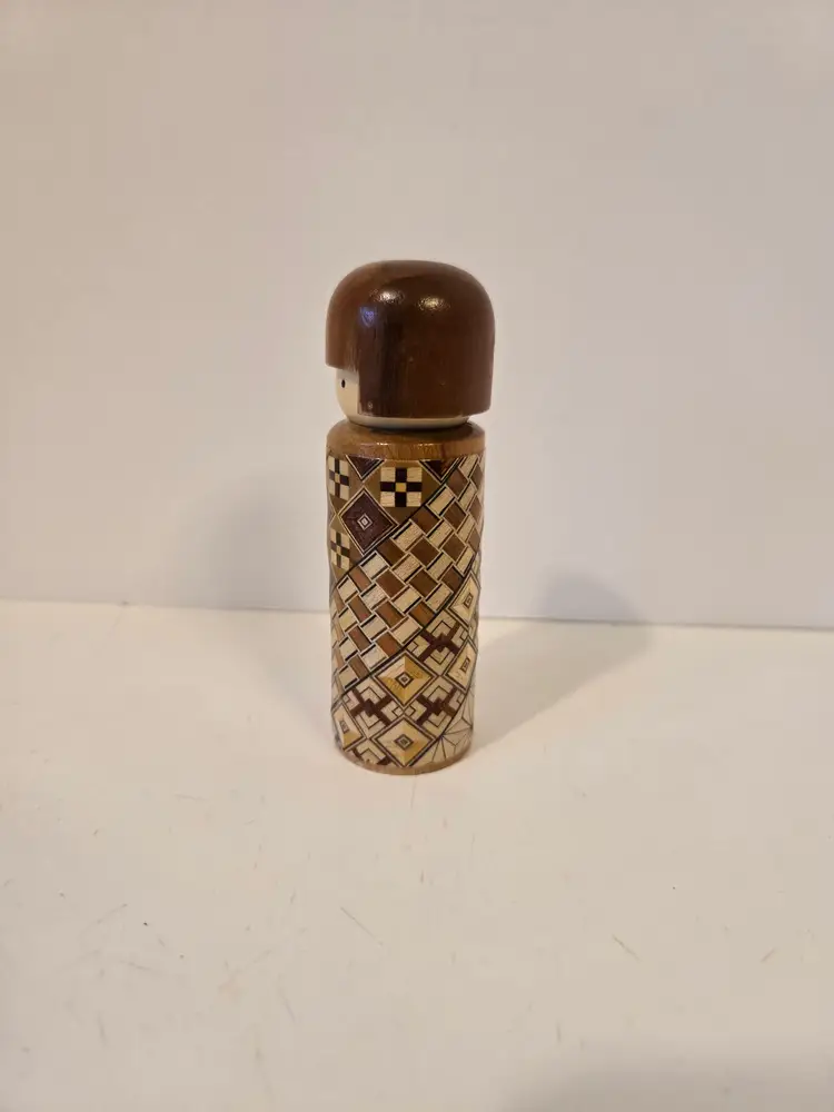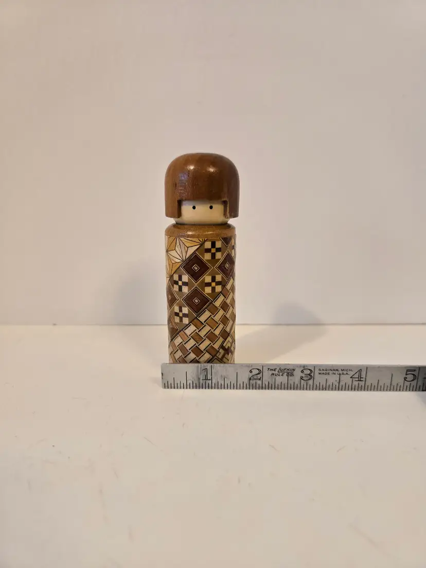 This piece is a beautiful example of Japanese marquetry. It measures approximately 4.5×1.5 inches and is in good used condition.