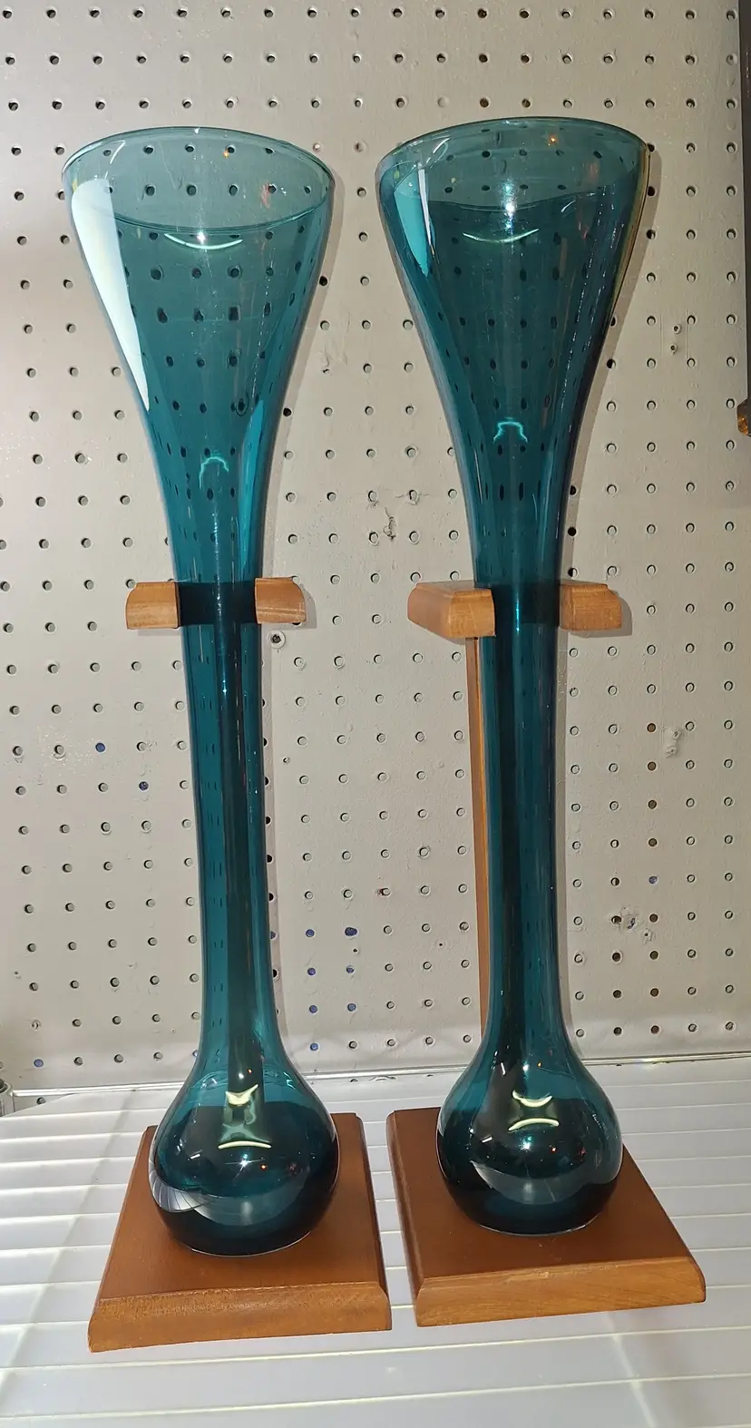 Pair of Vintage French blown glass Half Yard of Ale glasses with stands. The glass and the stands are in excellent condition, no chips, scratches, or dings
