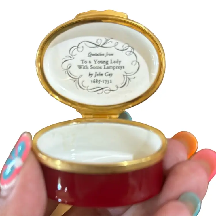Halicon Days Trinket Box “From 2 A Young Lady With Some Lampreys By John Gay 1685–1732 The top reads “With lovers t’was of old The Falhion by prefents to convey Paffion” Like new condition