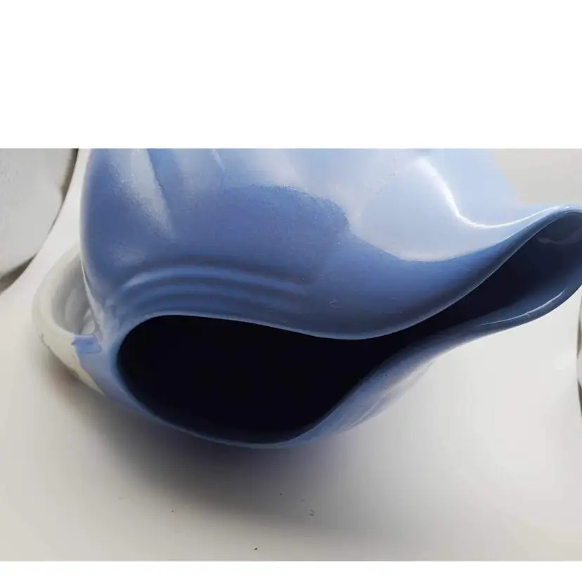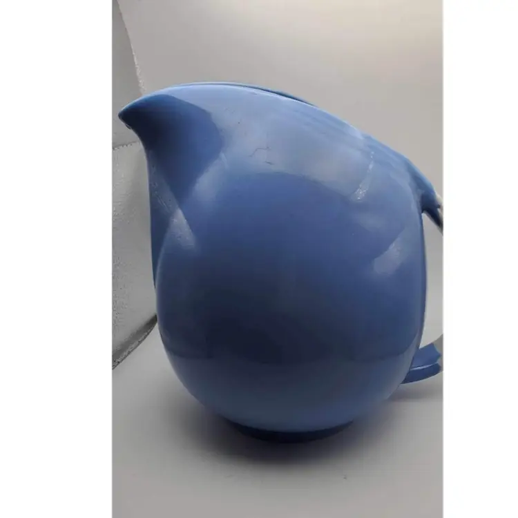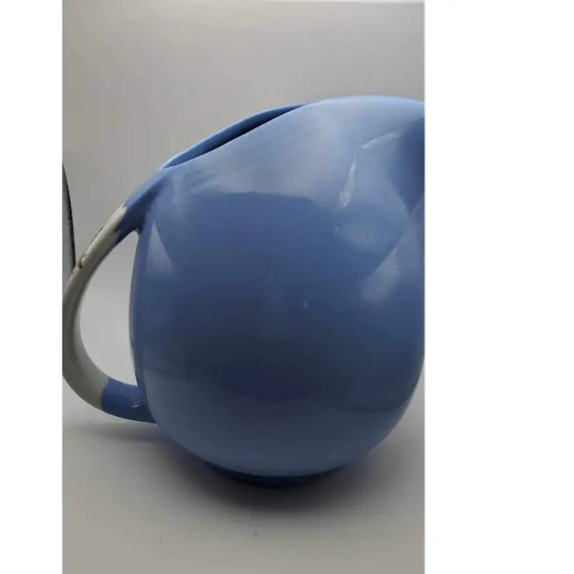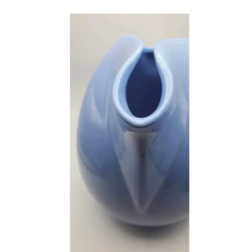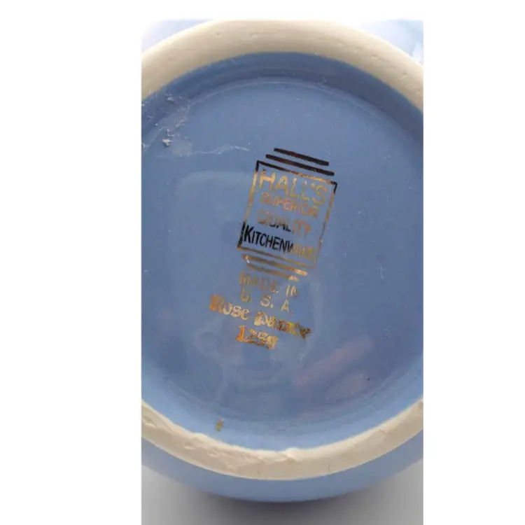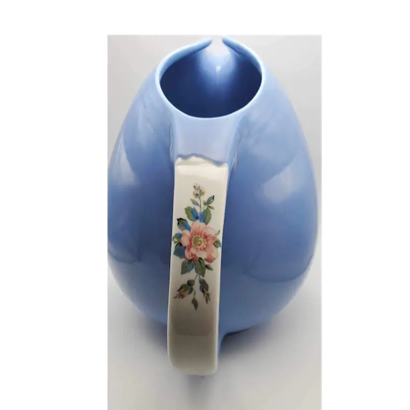 Vintage Hall Sani-grid jug in Cadet Blue color in the Rose Parade pattern from the 1940s still in good condition. The jug is 7 ½ inches tall, 6 inches wide, 8 ½ inches spout to handle, and weighs 2 pounds and 13 ounces. The jug has a pinched spout which acts as a ice lip. There are no chips, cracks, or repairs.