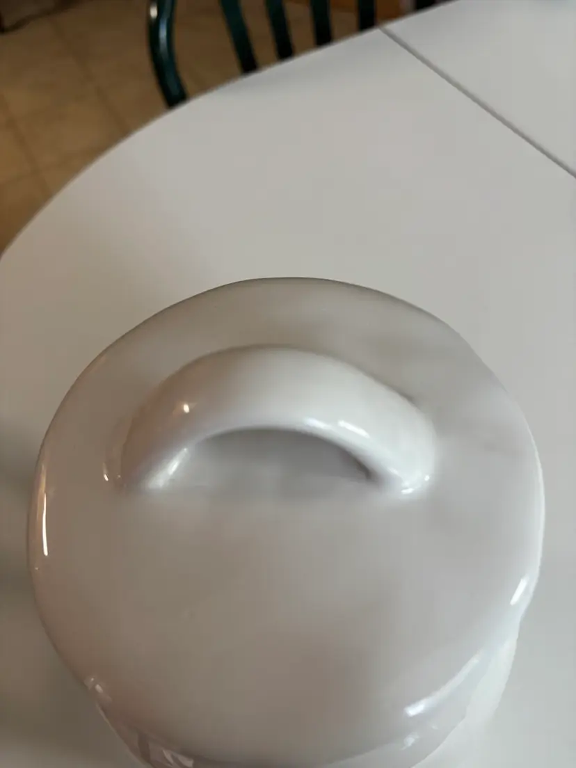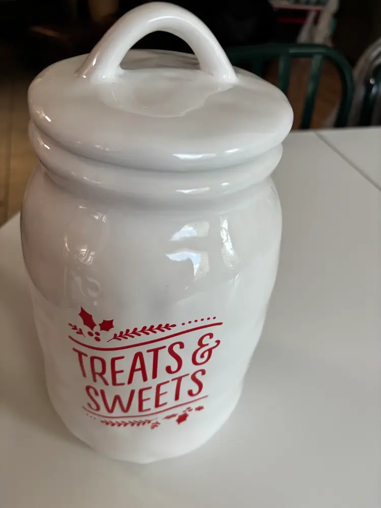 Charming white Hallmark cookie jar with 'Treats & Sweets' in red. Perfect for storing goodies.