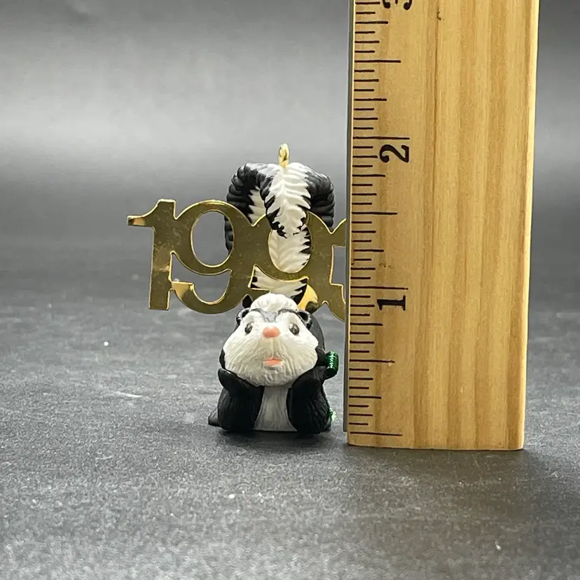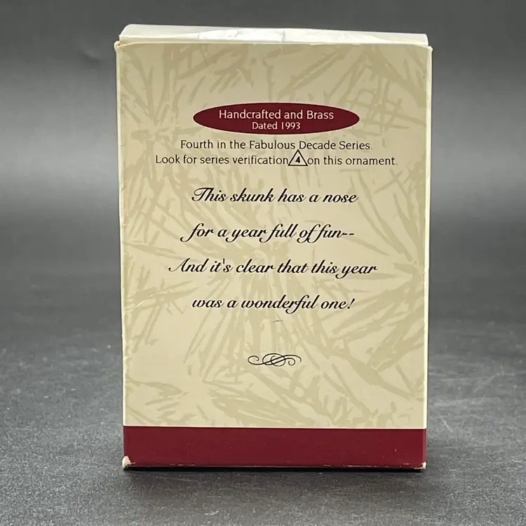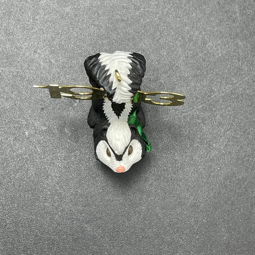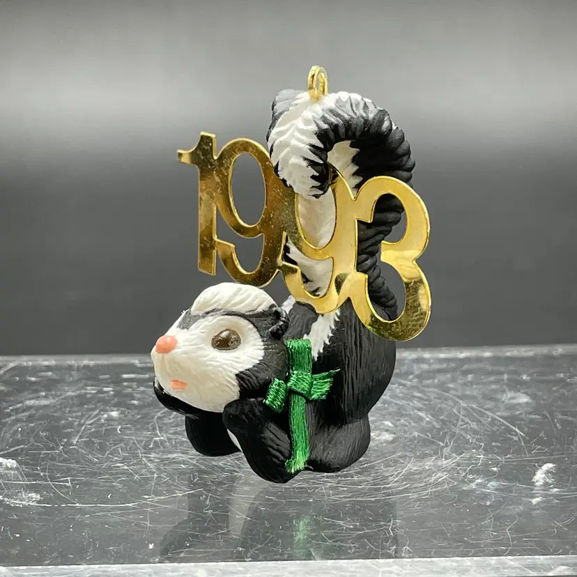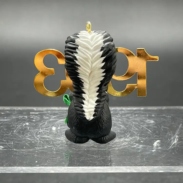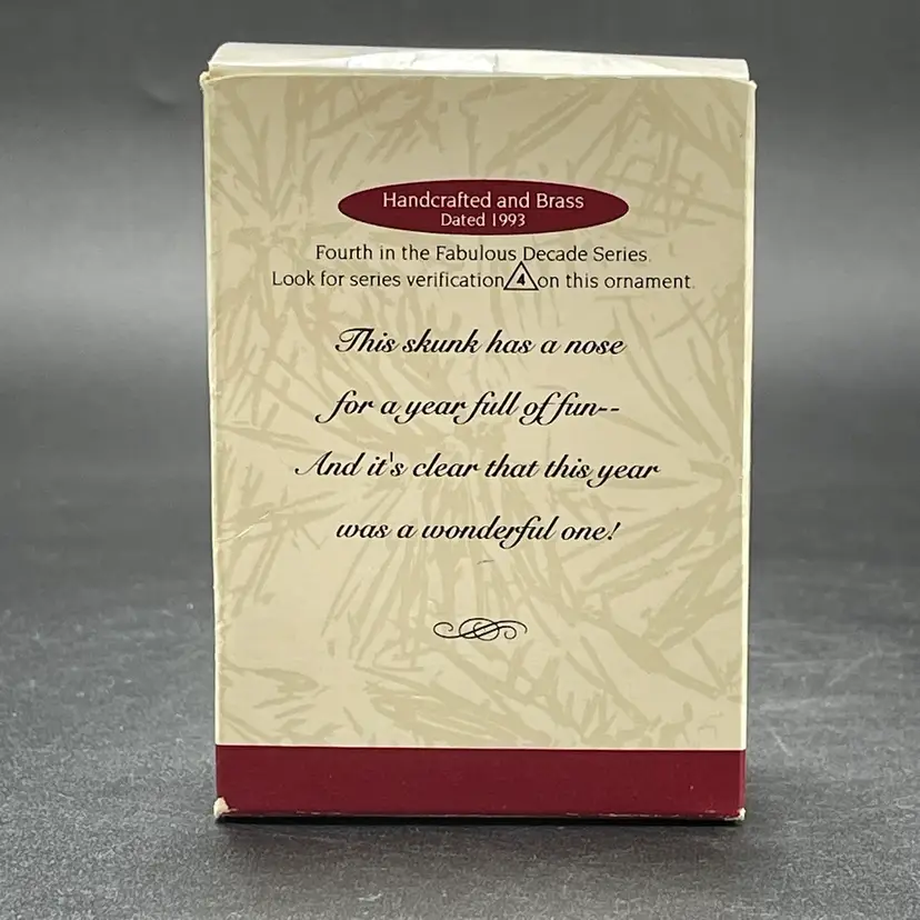 This is a vintage Hallmark Keepsake Fabulous Decade 1993 Skunk hanging ornament in its original box. Measures approximately 2" tall. No major flaws.
