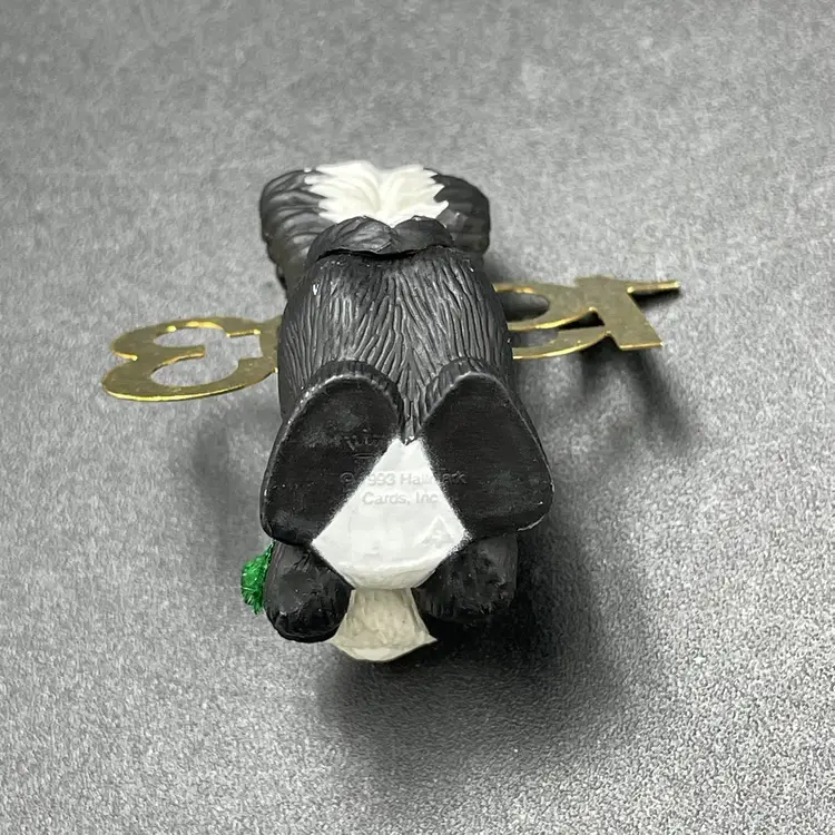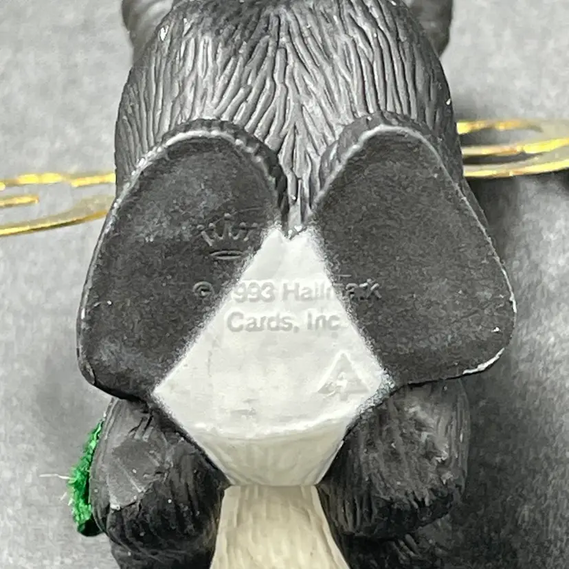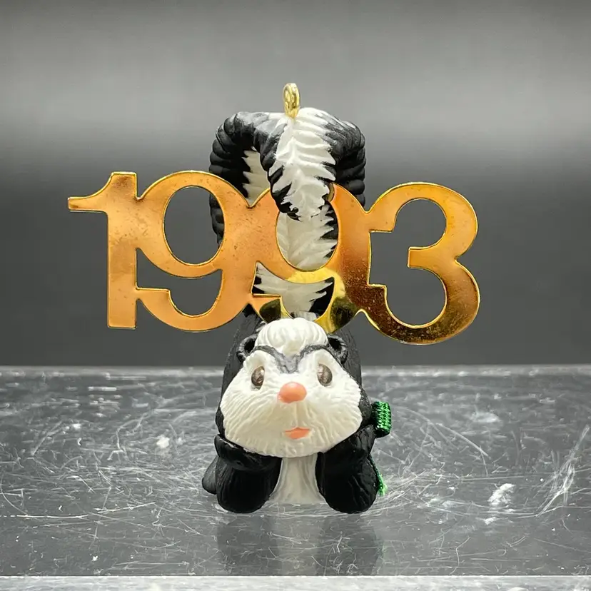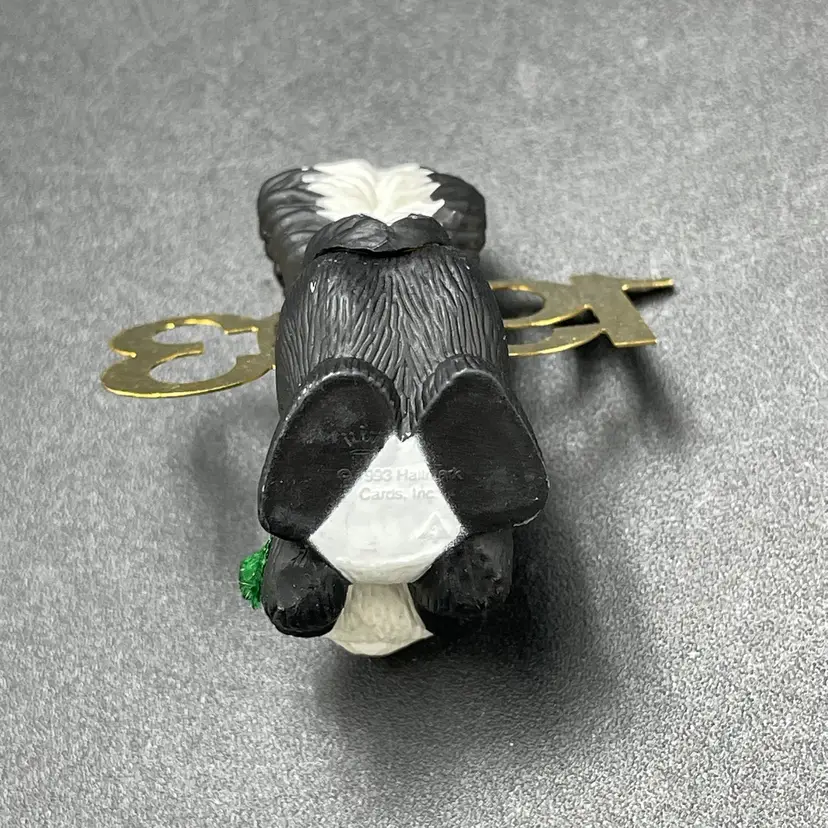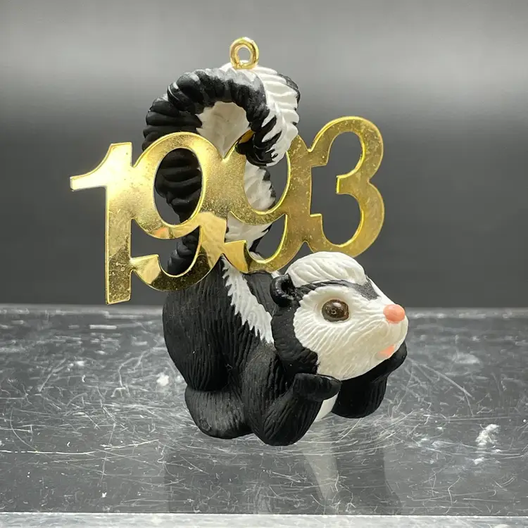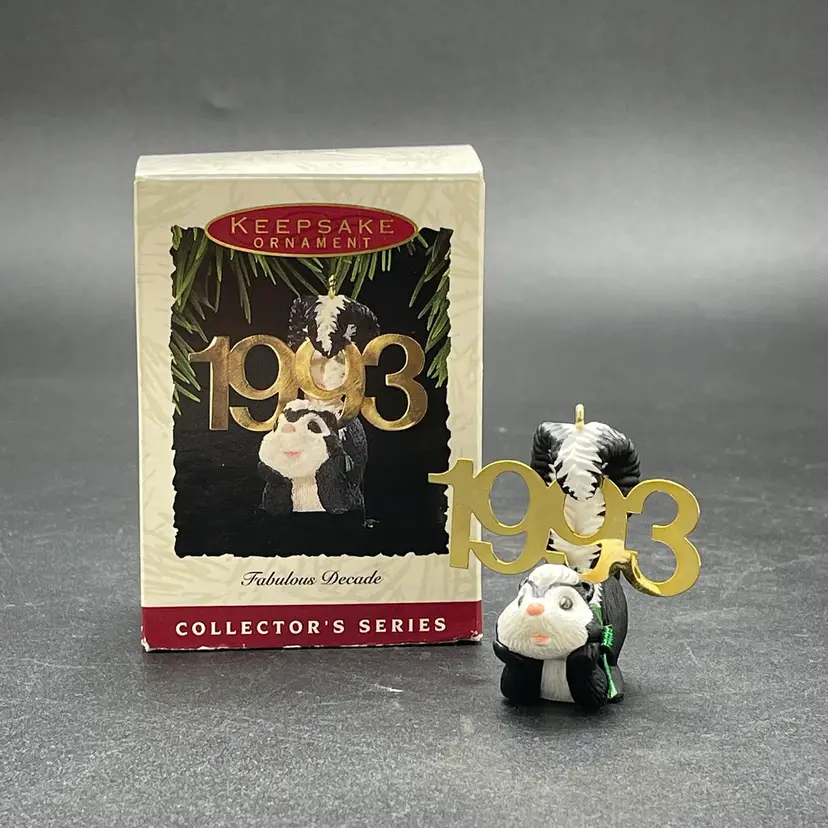 This is a vintage Hallmark Keepsake Fabulous Decade 1993 Skunk hanging ornament in its original box. Measures approximately 2" tall. No major flaws.