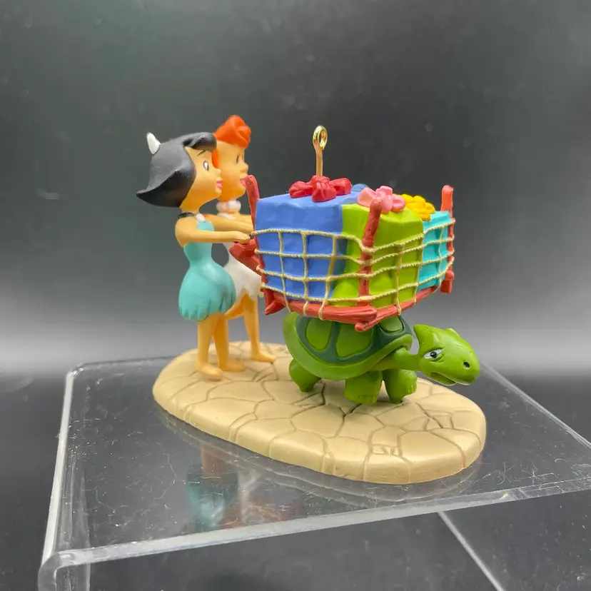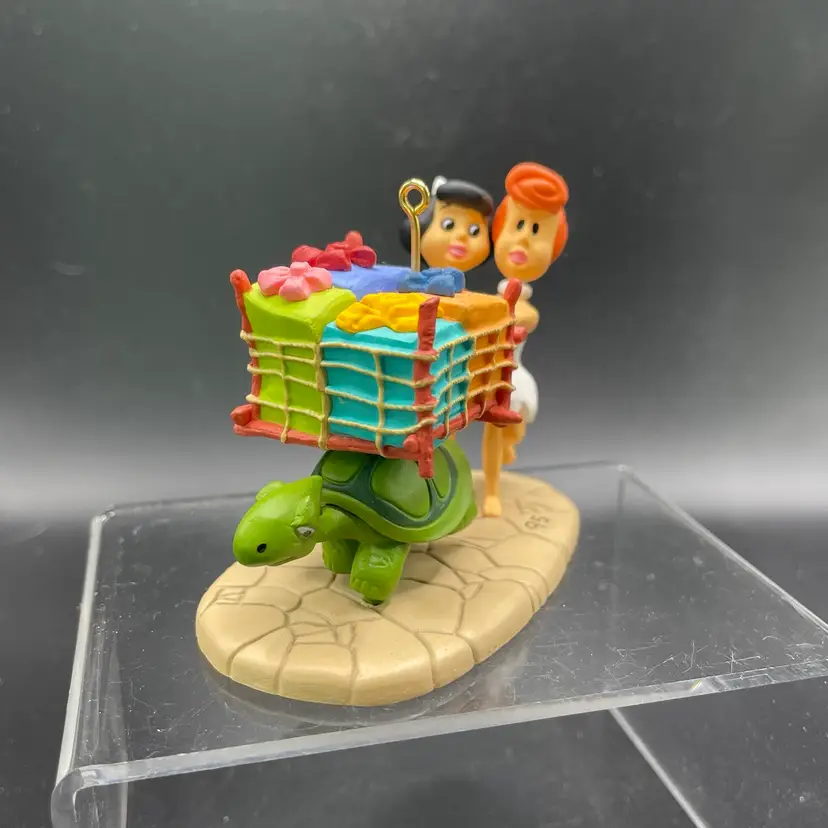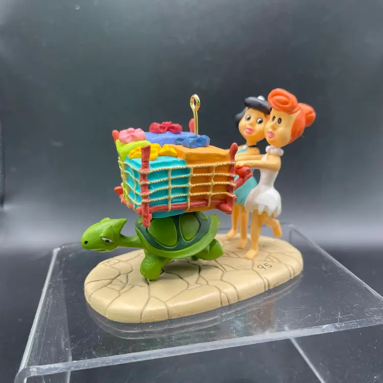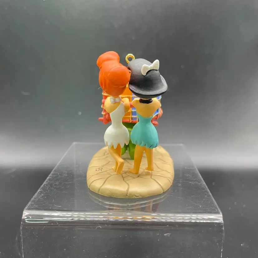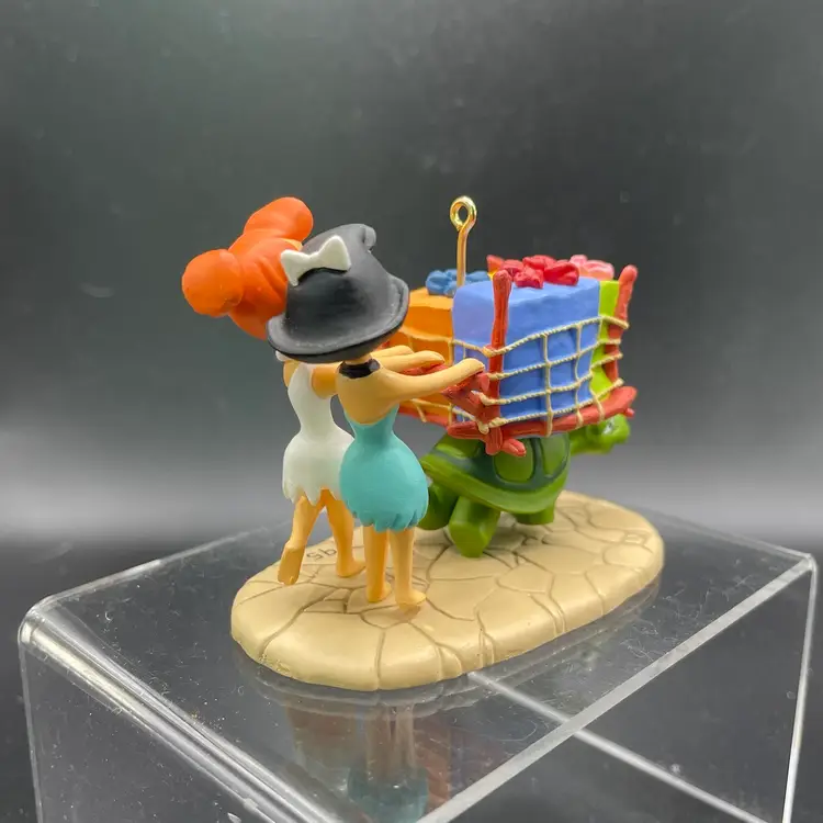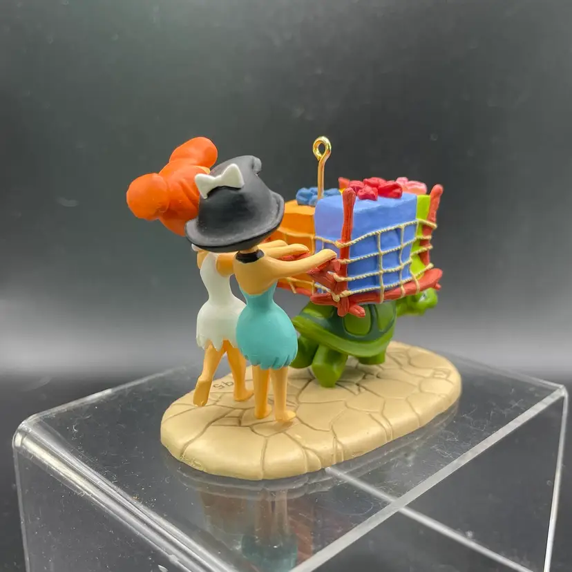 This is a vintage 1995 Hallmark Flintstones Betty and Wilma hanging ornament in its original packaging. Measures approximately 2.5" tall x 3" long. No major flaws.