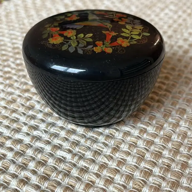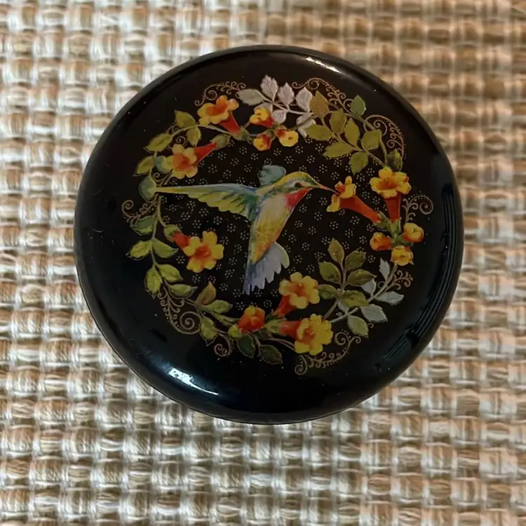 Hallmark Card Co round lacquer trinket box with hummingbird design on top. Measures 3” in diameter. Vintage condition with a small scratch inside the lid (see photos)