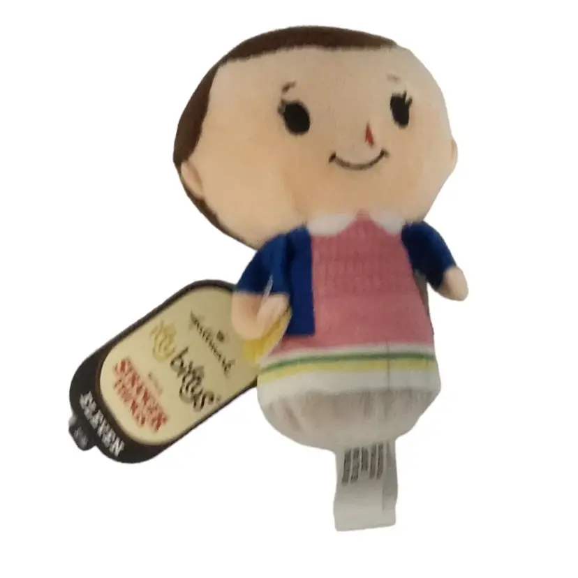 This Hallmark plush collectible showcases Eleven, the beloved character from the hit series "Stranger Things." Crafted with attention to detail, it features her iconic look, complete with a soft pink dress, blue jacket, and her signature nosebleed. Standing compact and cute, this plush is great for fans or collectors of the series. The vibrant colors and embroidered details ensure quality and charm.