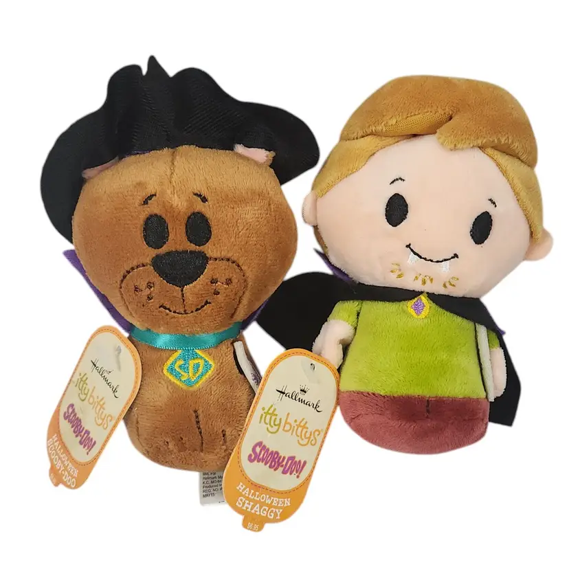 These delightful Hallmark Itty Bittys plush toys are a charming addition to any collection, featuring the beloved characters Scooby-Doo and Shaggy in their Halloween costumes. The soft, plush material ensures a cuddly and tactile experience, evoking nostalgia for fans of the classic animated series. Perfectly sized for display or play, this set captures the essence of the Halloween spirit with fun and whimsy. • Includes Scooby-Doo & Shaggy • Halloween-themed costumes • Made in China • Officially licensed by Warner Bros. • Soft plush material New with tags, Tags have some wear due to retail stickers.