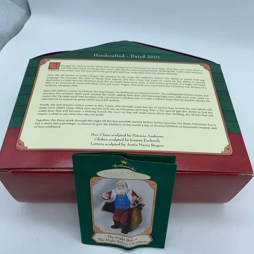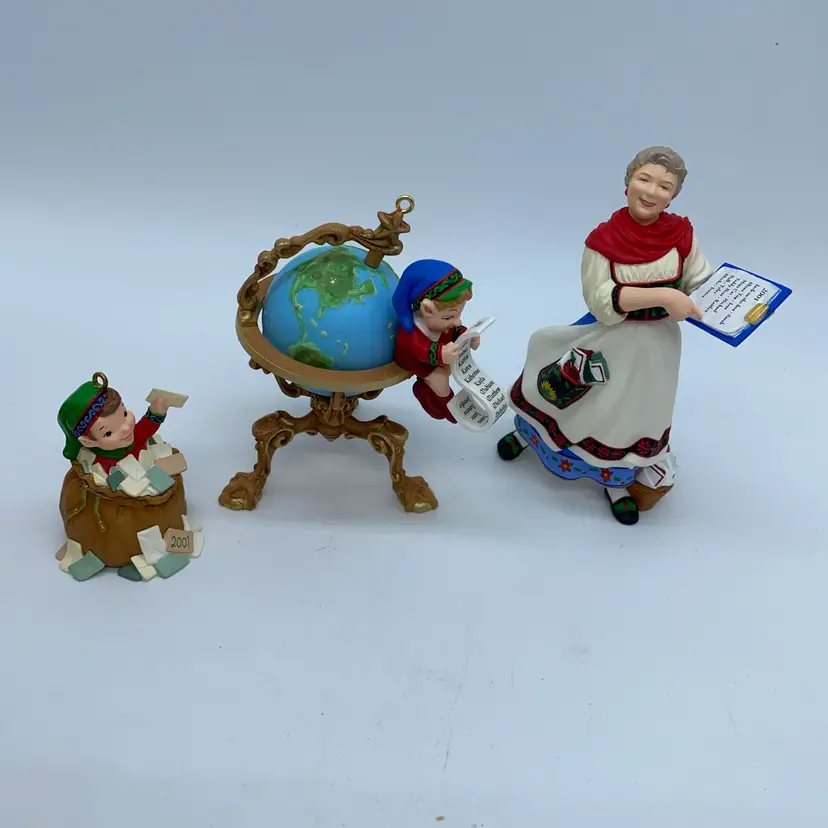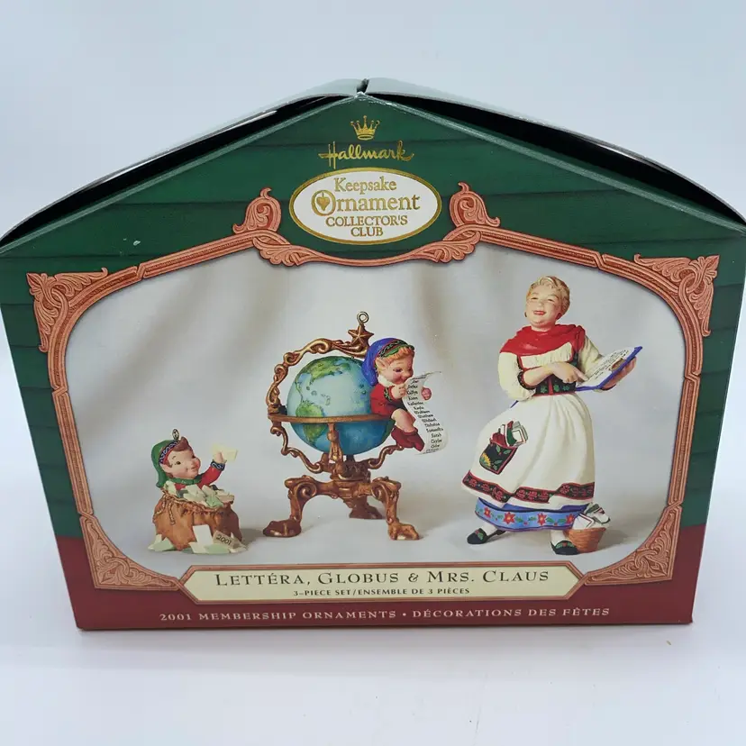 This particular set, "Lettera, Globus & Mrs. Claus," was released in 2001 as part of the Collector's Club offerings. The design likely plays on themes of correspondence, global reach, and holiday spirit, featuring classic Christmas characters in a charming tableau. Such sets are often sought after by collectors who focus on specific years or themes within the Hallmark Keepsake line.