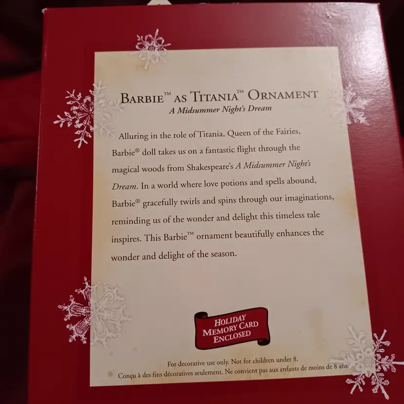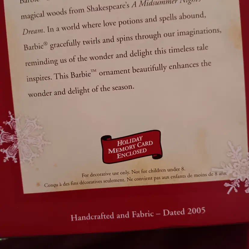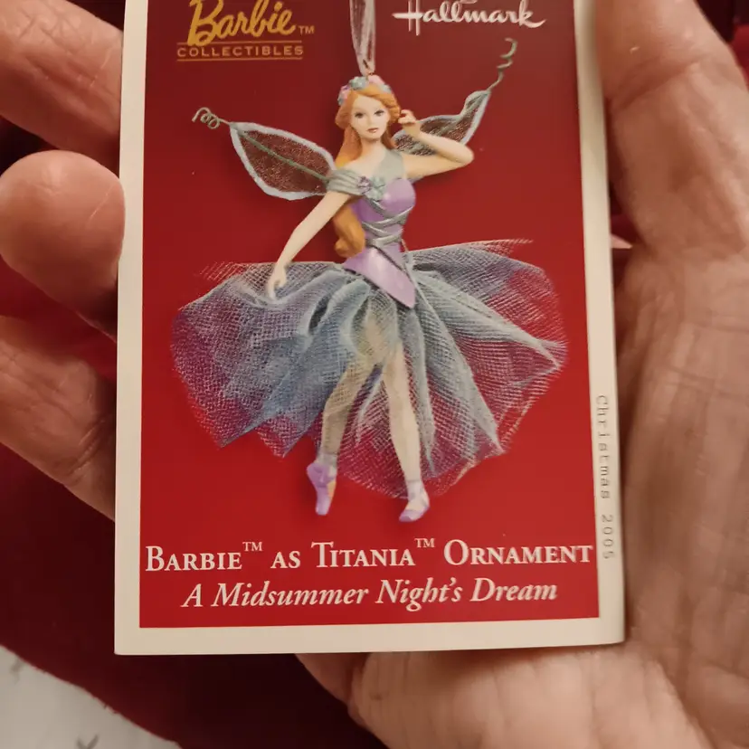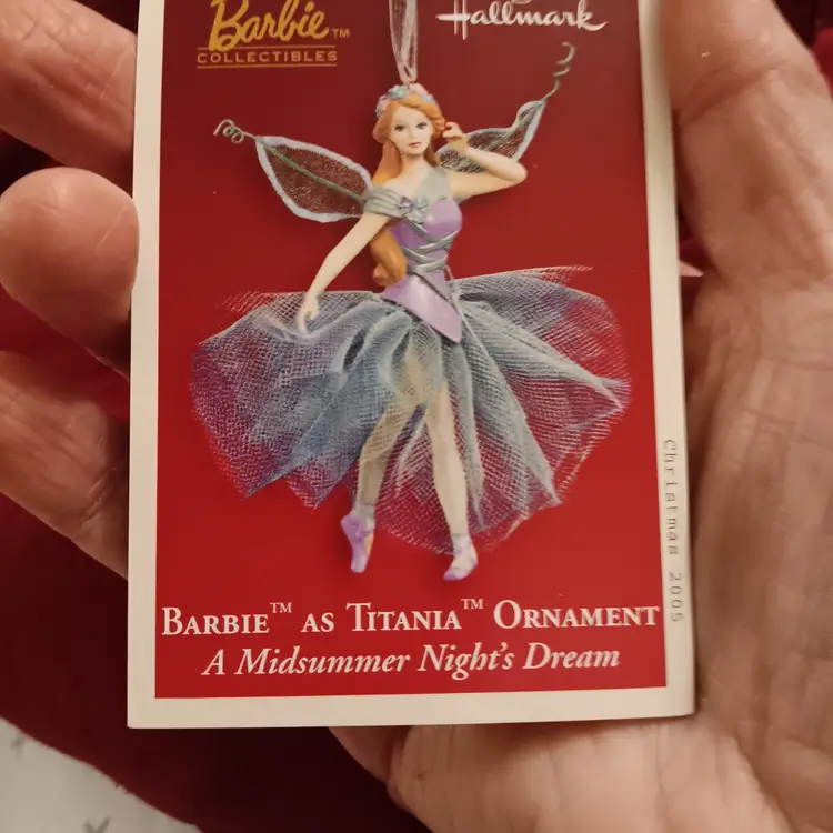 2005 Barbie dressed as fairy Titania from A Midsummer Nights Dream. Hand Crafted in original box never used. Purple and blue and includes original Memory Card see photos. 4.5 inches tall and 4.5 inches wide at widest point.