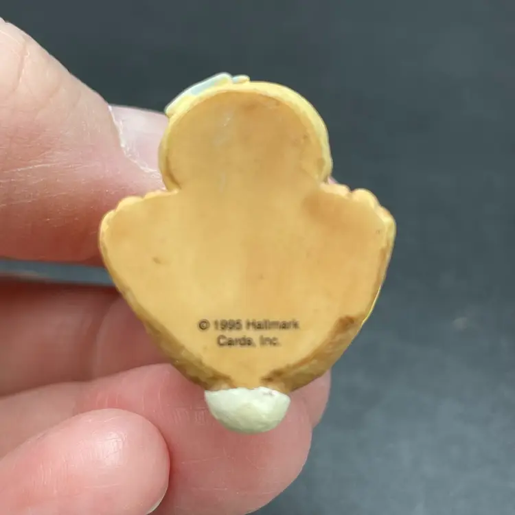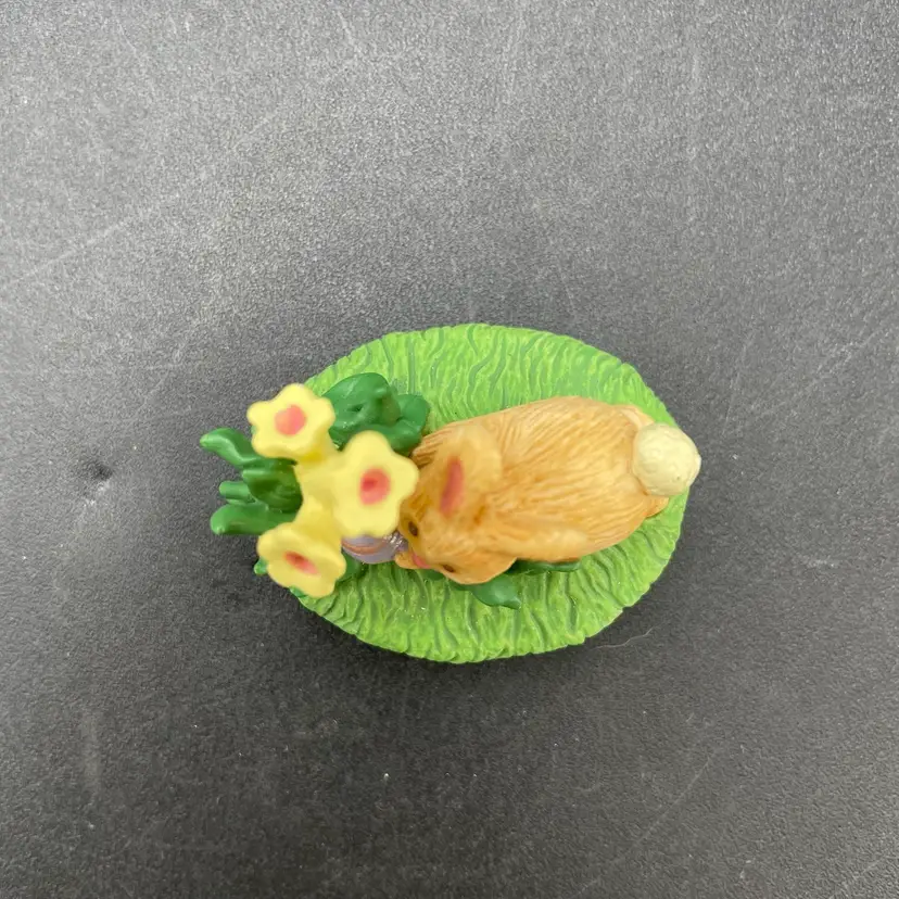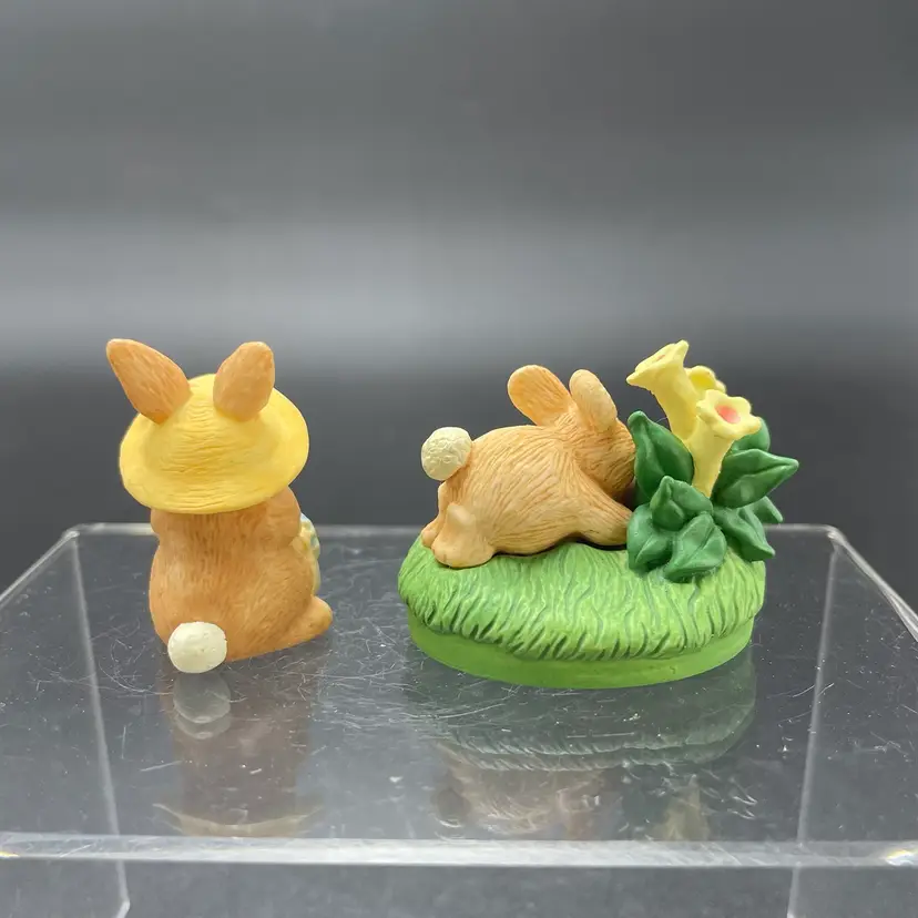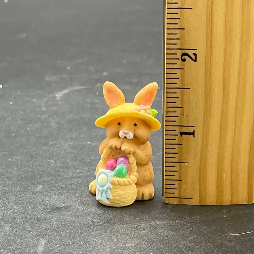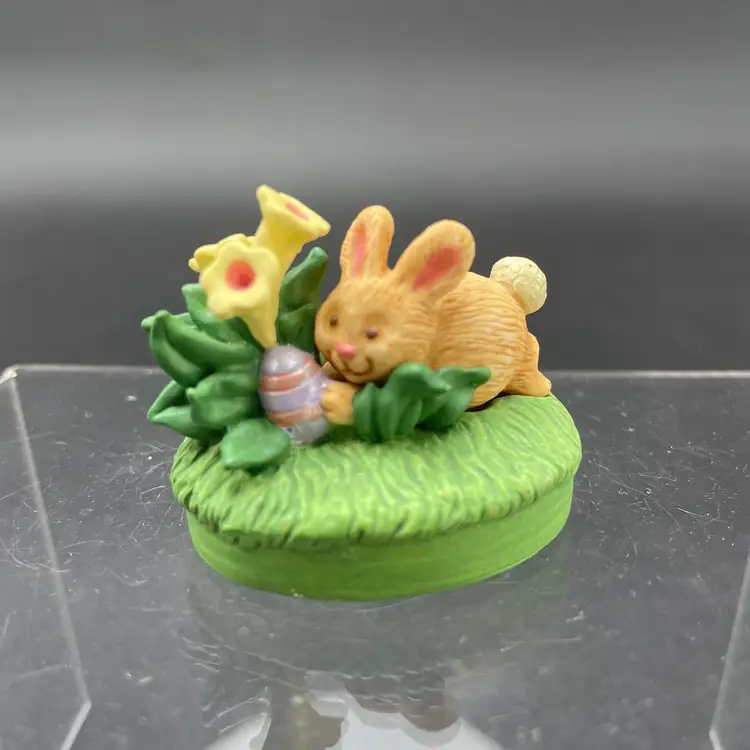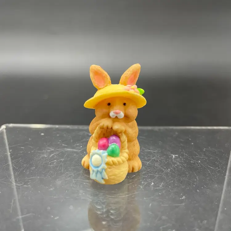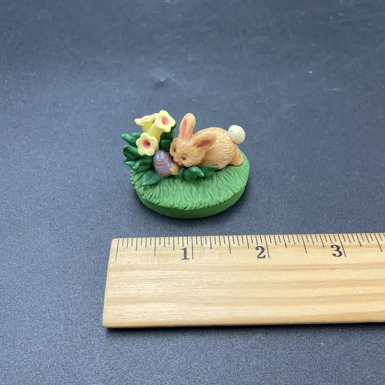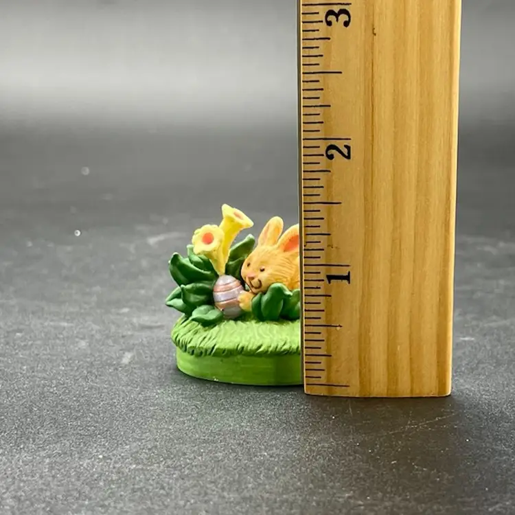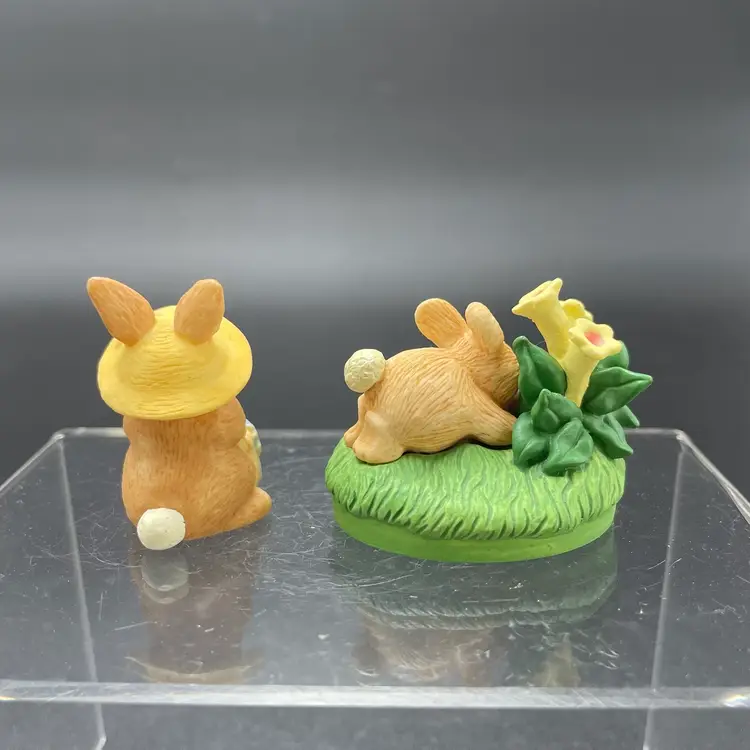 This is a lot of 2 vintage 1995 Hallmark Merry Miniatures Easter figurines including the Blue Ribbon Bunny and the Easter Egg Hunt Bunny. The Blue Ribbon Bunny measures approximately 1.5" tall. The Easter Egg Hunt Bunny measures approximately 1.25" tall. No boxes. No major flaws.