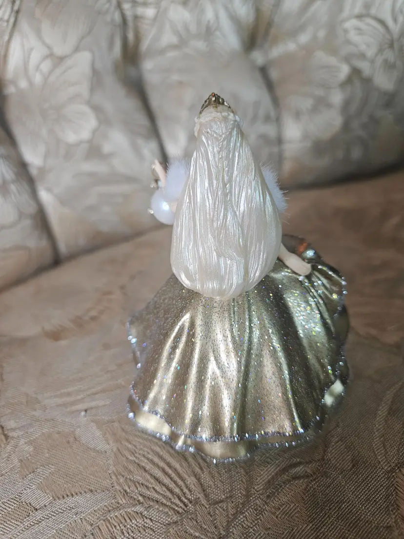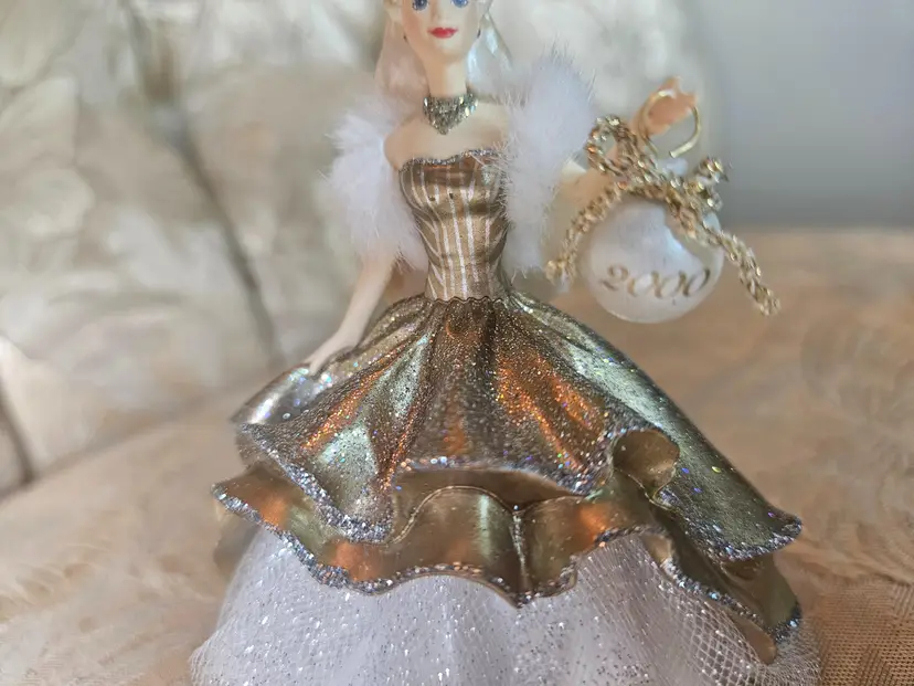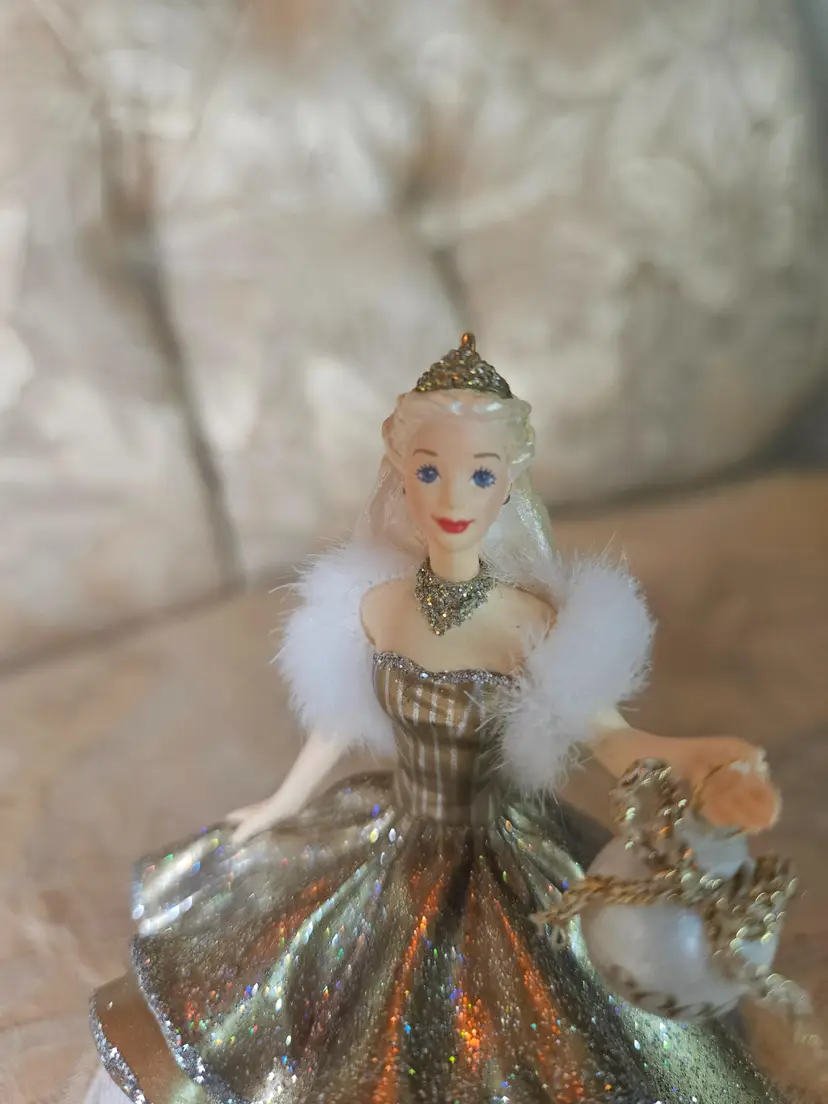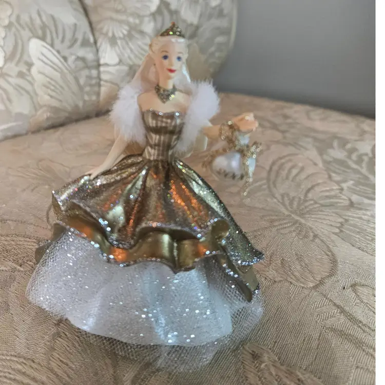 Elegant vintage princess Barbie Ornament dressed in a sparkling gold gown. Perfect for collectors or as a charming addition to your decor. In great condition with no visible flaws.