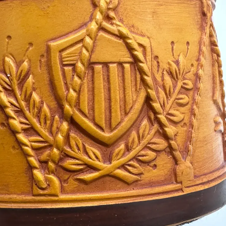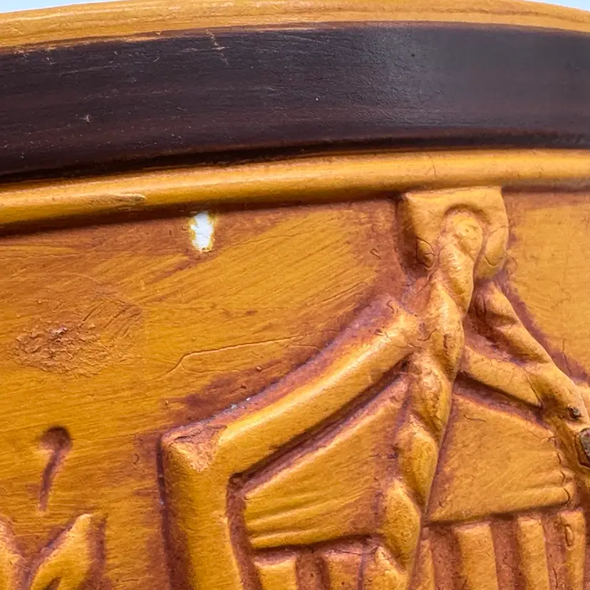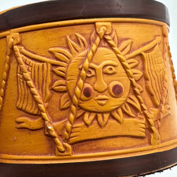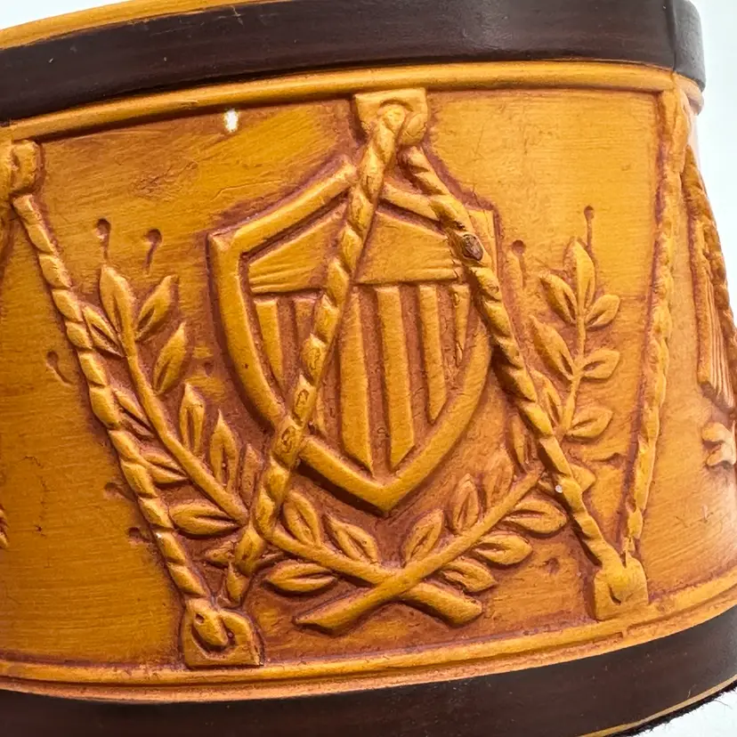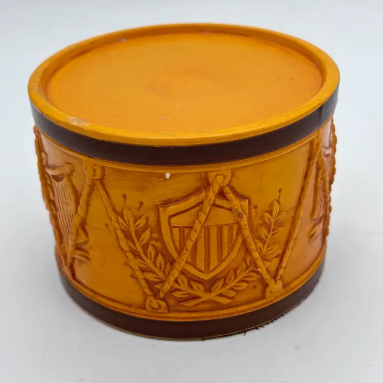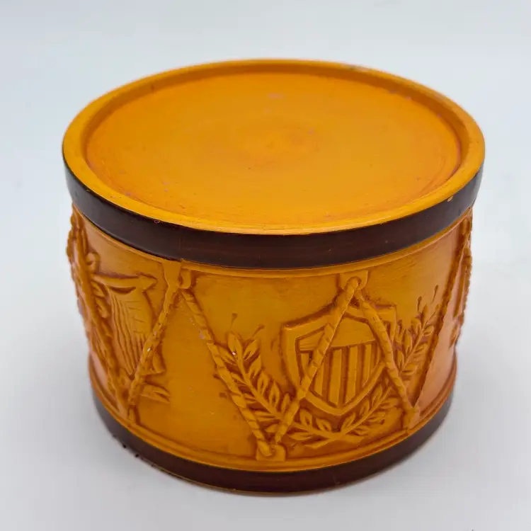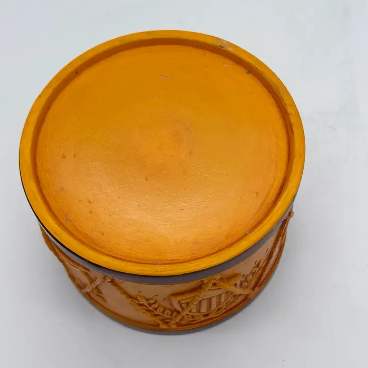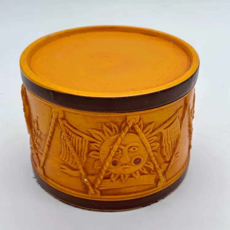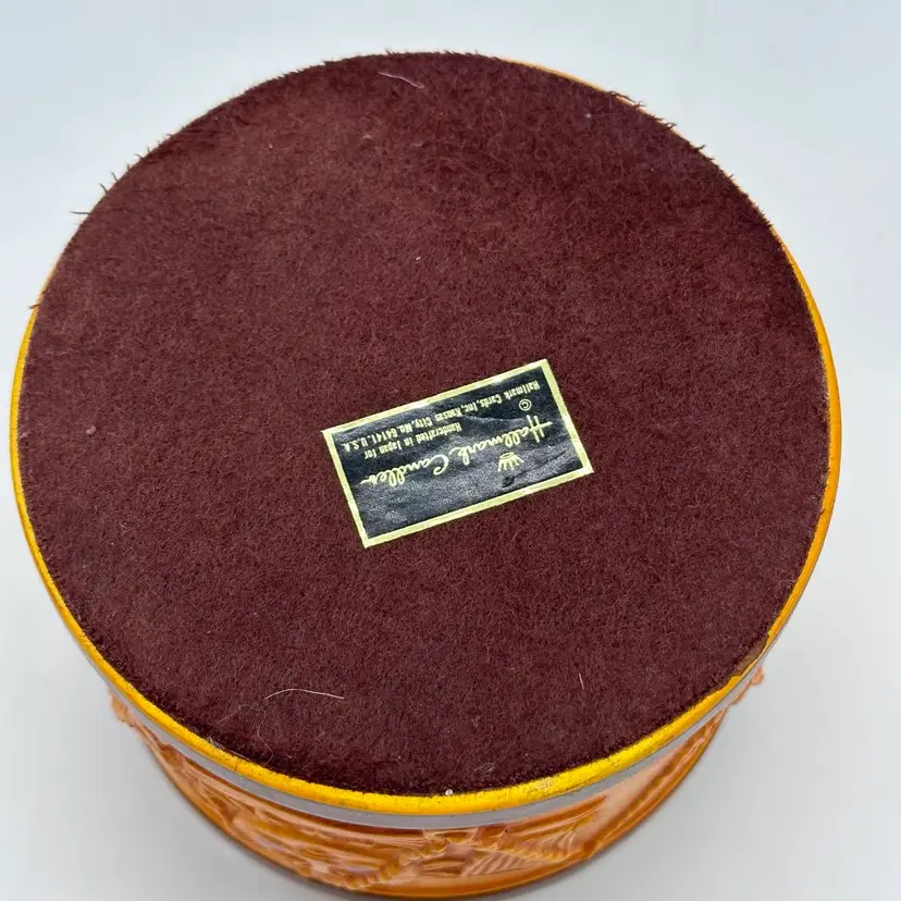 Add a touch of vintage Mid Century Modern charm to your home decor with this Hallmark Pillar Candle Holder. The round ceramic holder measures 3 3/8 inches in height and 4 5/8 inches in width, making it a medium-sized piece that can be used in any room. The candle holder features a unique drum shape with orange sun flag patterns that adds a unique touch to your decor. In good condition. Does not have any cracks. There is minor surface chips in a few places.