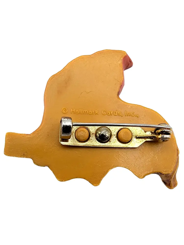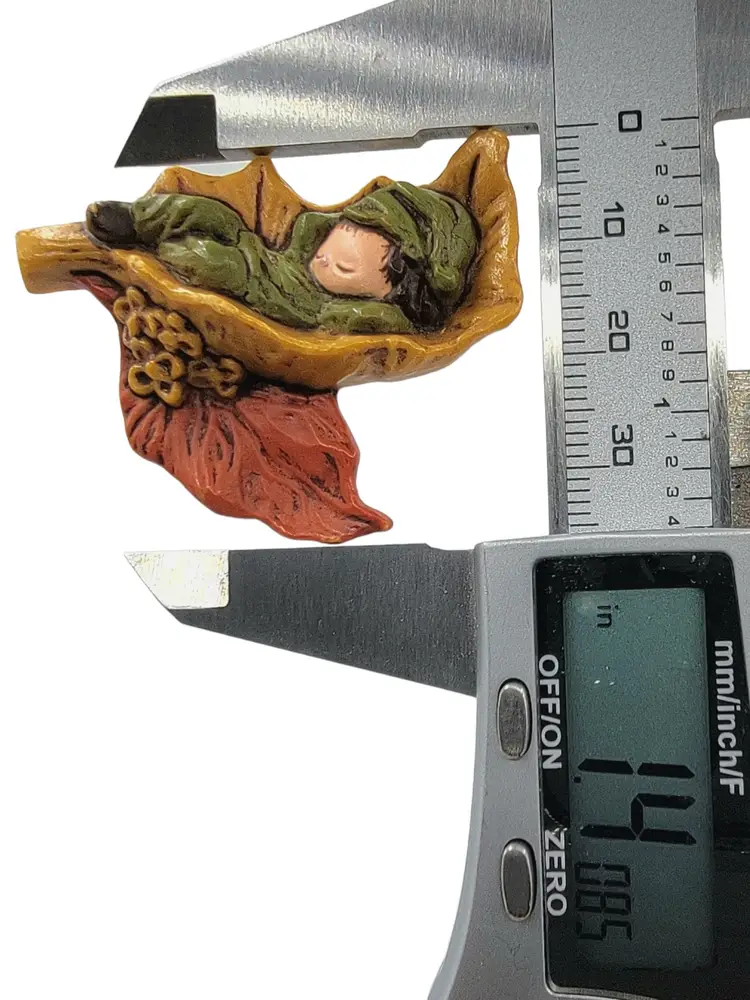 This sweet sleeping Pixie baby in Leaf Hallmark pin is carefully crafted and is made with artistically realistic details. It features a little elf pixie boy wearing a green hat and outfit, brown shoes, and peacefully sleeping on a yellow autumn leaf. Marked HALLMARK CARDS, INC. at the back. Measures approximately 1.4-inch tall. The pin functions properly and is in good vintage condition.