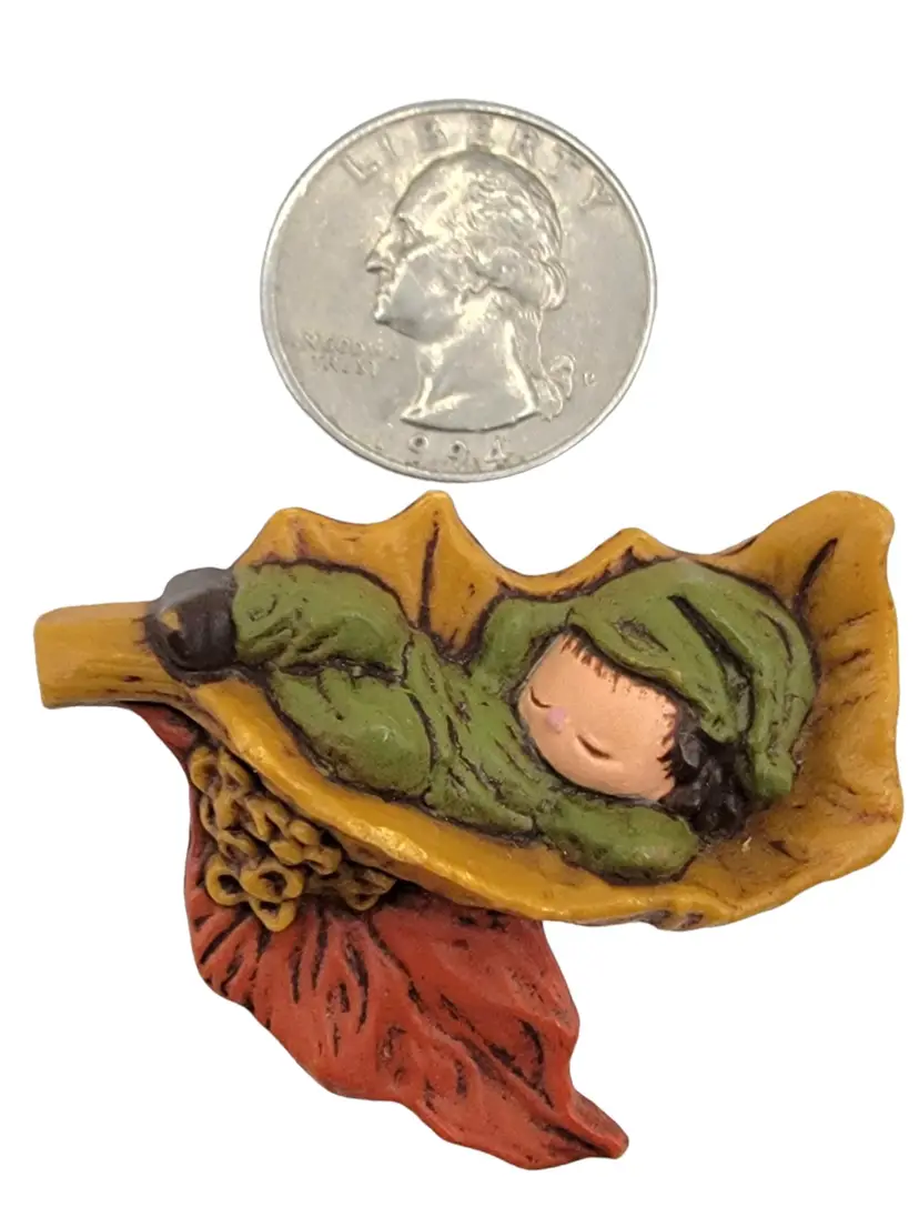 Hallmark Sleeping Gnome Pixie Baby in Leaf Christmas Elf Pin Brooch