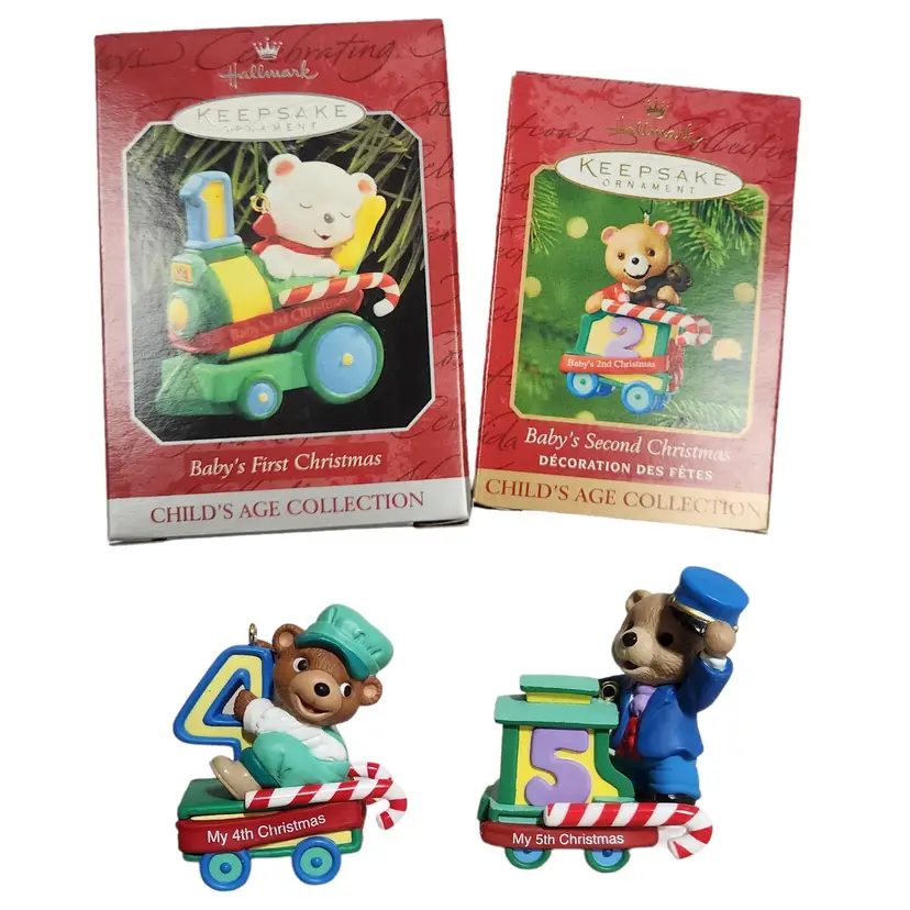 These delightful Hallmark Keepsake ornamente capture the magic of a child's first, second, fourth, and fifth Christmas. Charming bears ride colorful trains, creating a heartwarming memories. Sculpted by John "Collin" Francis, these pieces are part of the cherished Child's Age Collection, intended to commemorate a child's early holiday milestones. Includes: 2000 First Christmas QX6603 - New in Box 2001 Second Christmas QX8382 - New in Box 2003 Fourth Christmas QXG8709 - No box, writing on the bottom. 2004 Fifth Christmas QXG5774 - No box, writing on the bottom. • Each Approx 2.5"H • Four of Child's Age Collection • Sculpted by John "Collin" Francis • Features Bear on Train 1s & 2nd are new in box but 4th & 5th have no boxes and writing on bottom of ornaments.