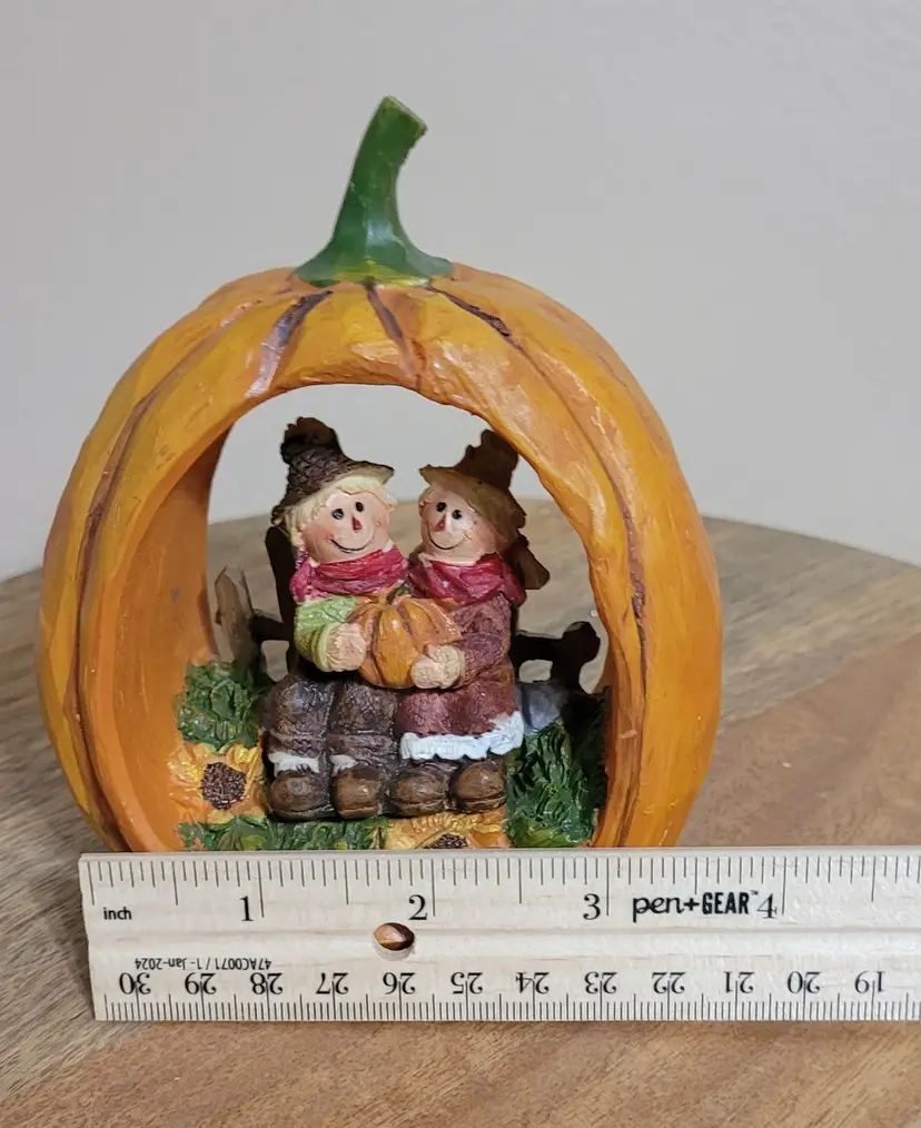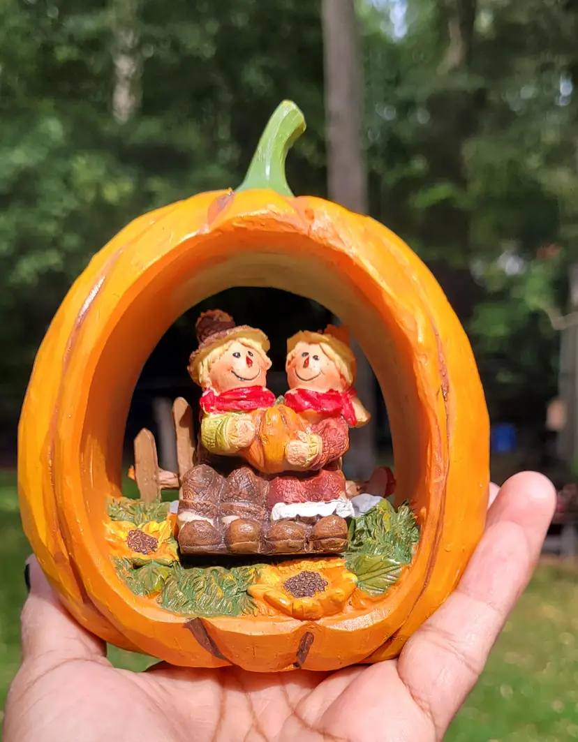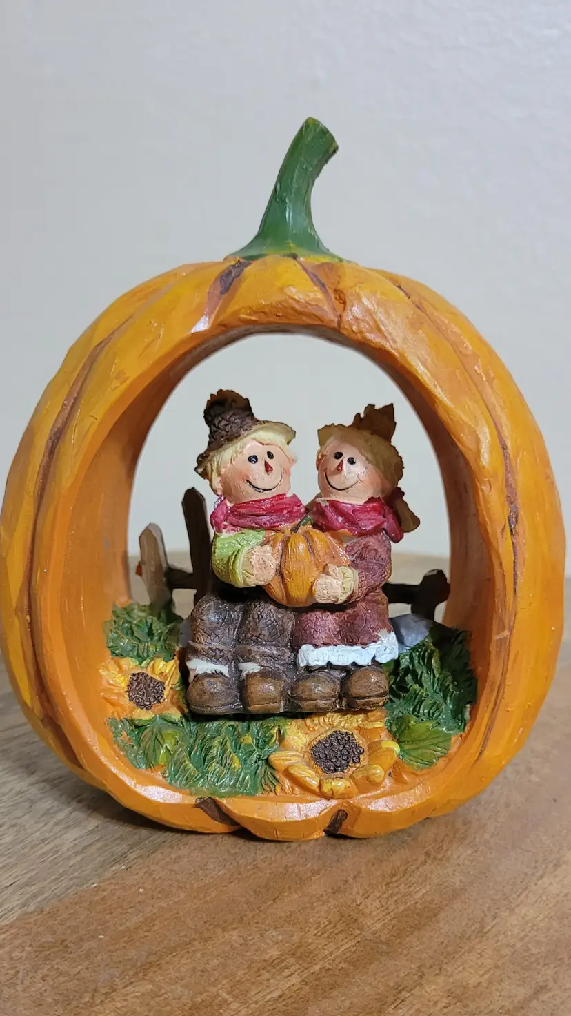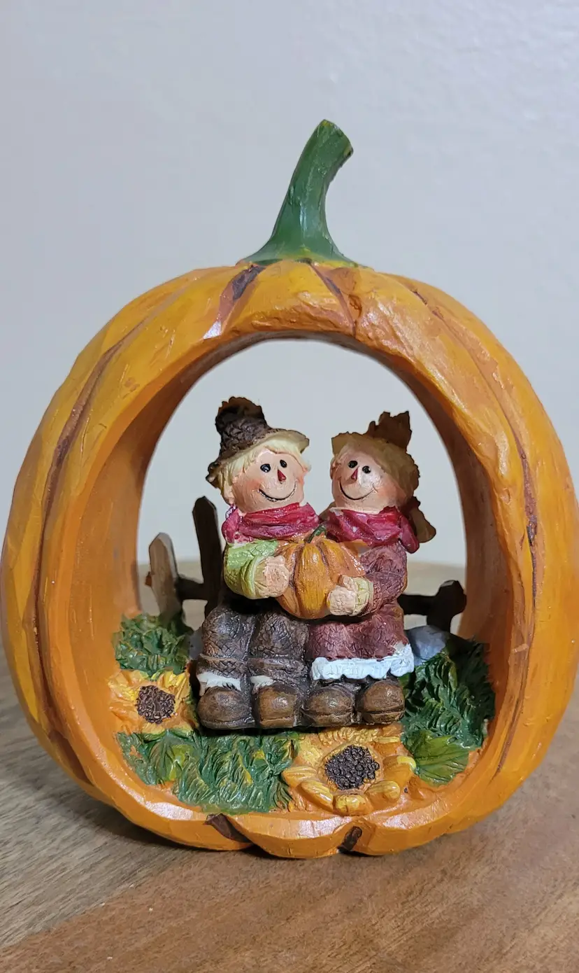 Just in tome for fall. This cute hallowed out pumpkin features two scarecrow buddies. A sweet addition to your home decor.
