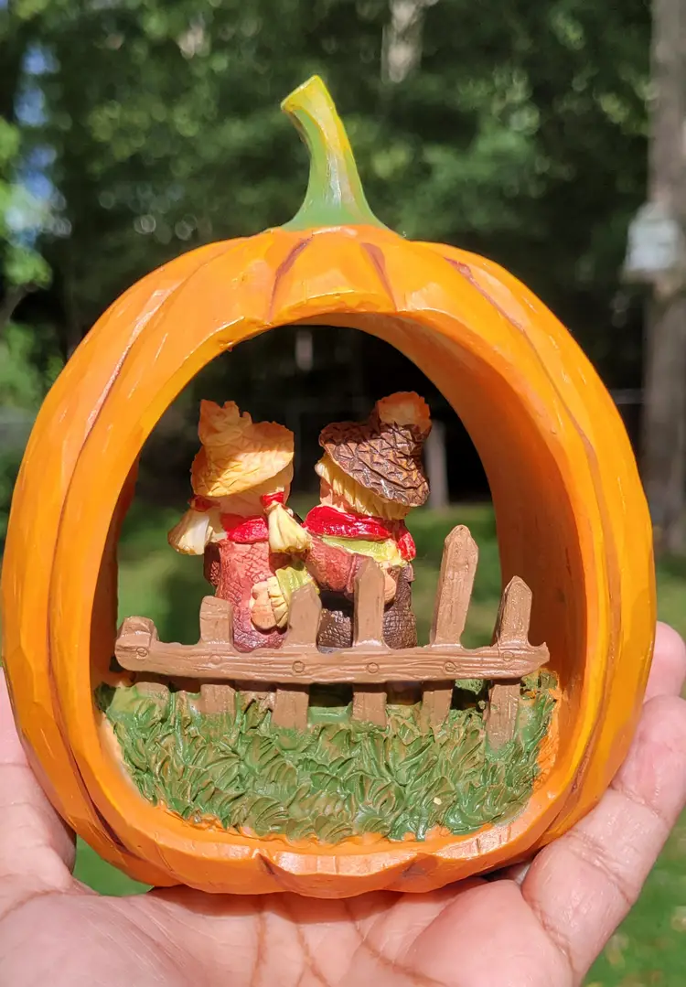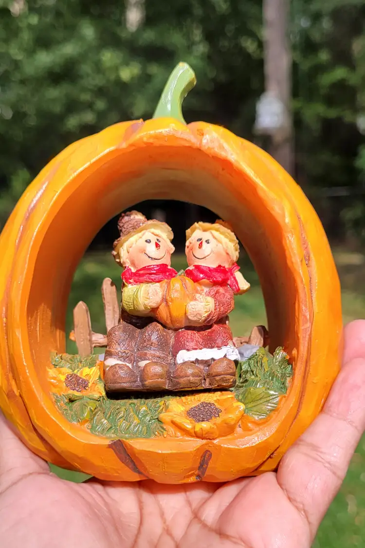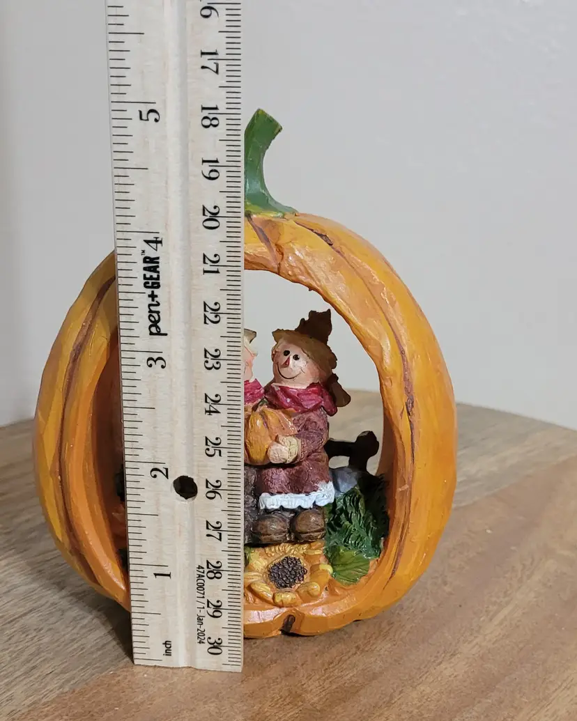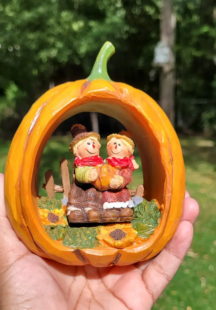Just in tome for fall. This cute hallowed out pumpkin features two scarecrow buddies. A sweet addition to your home decor.
