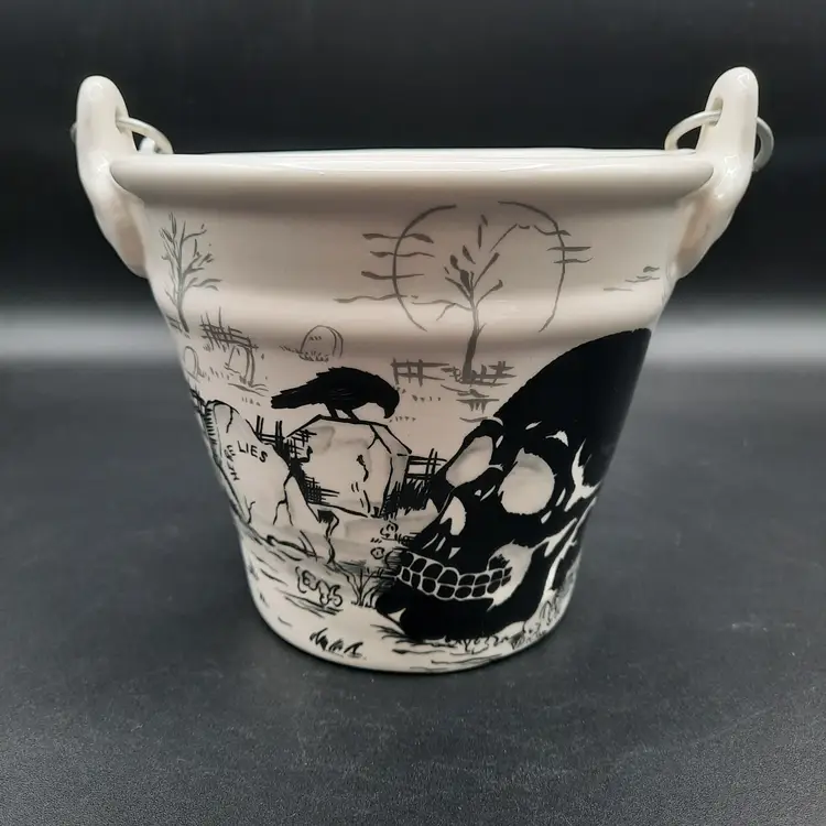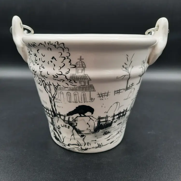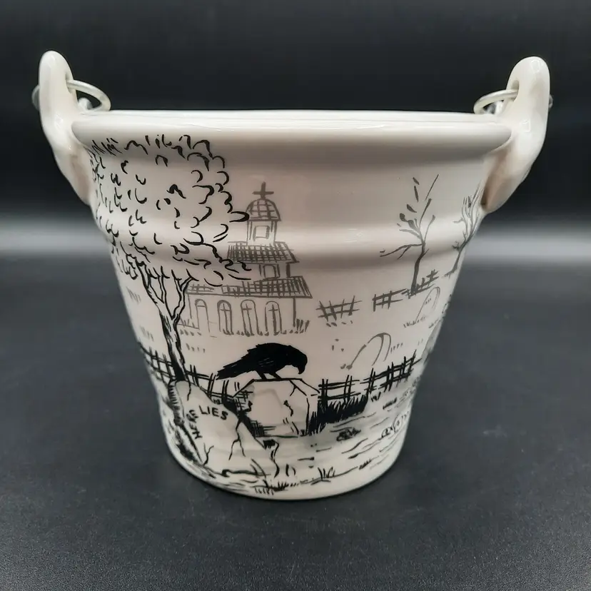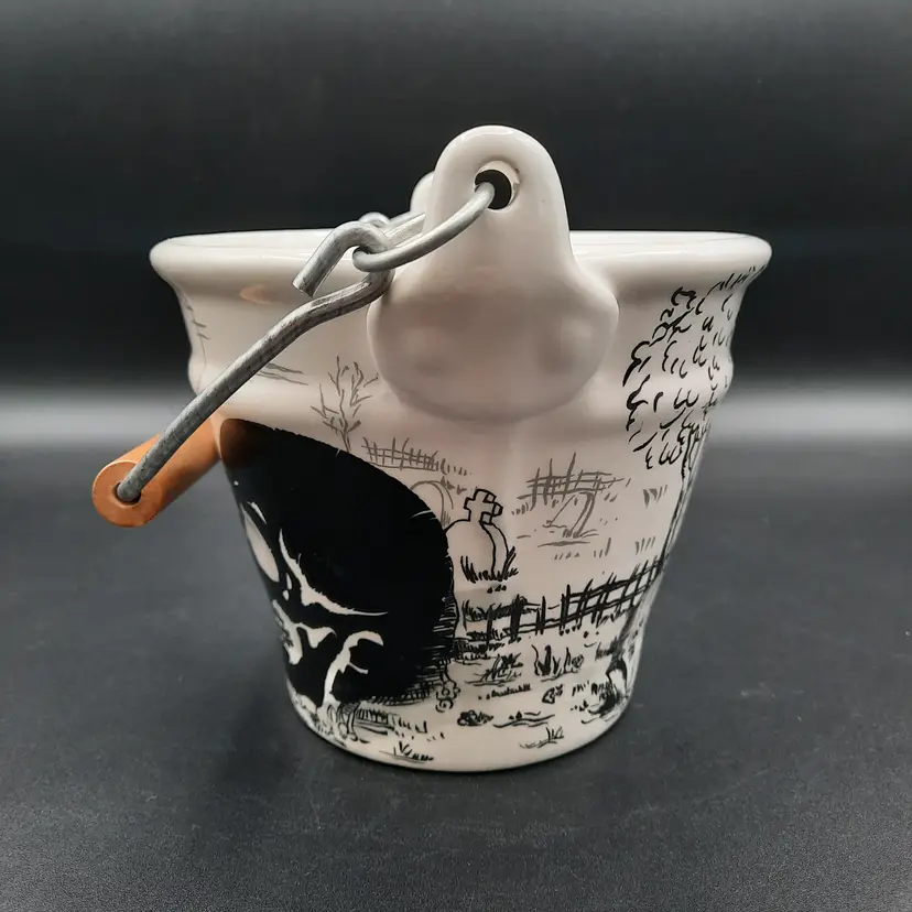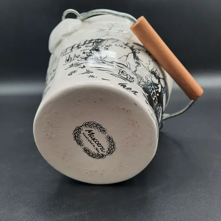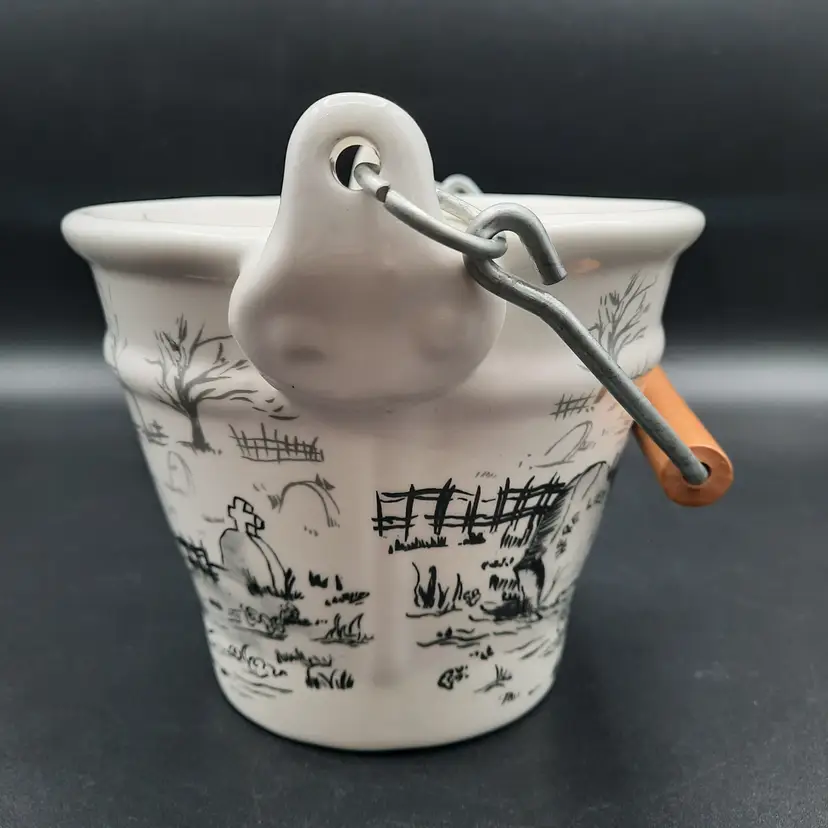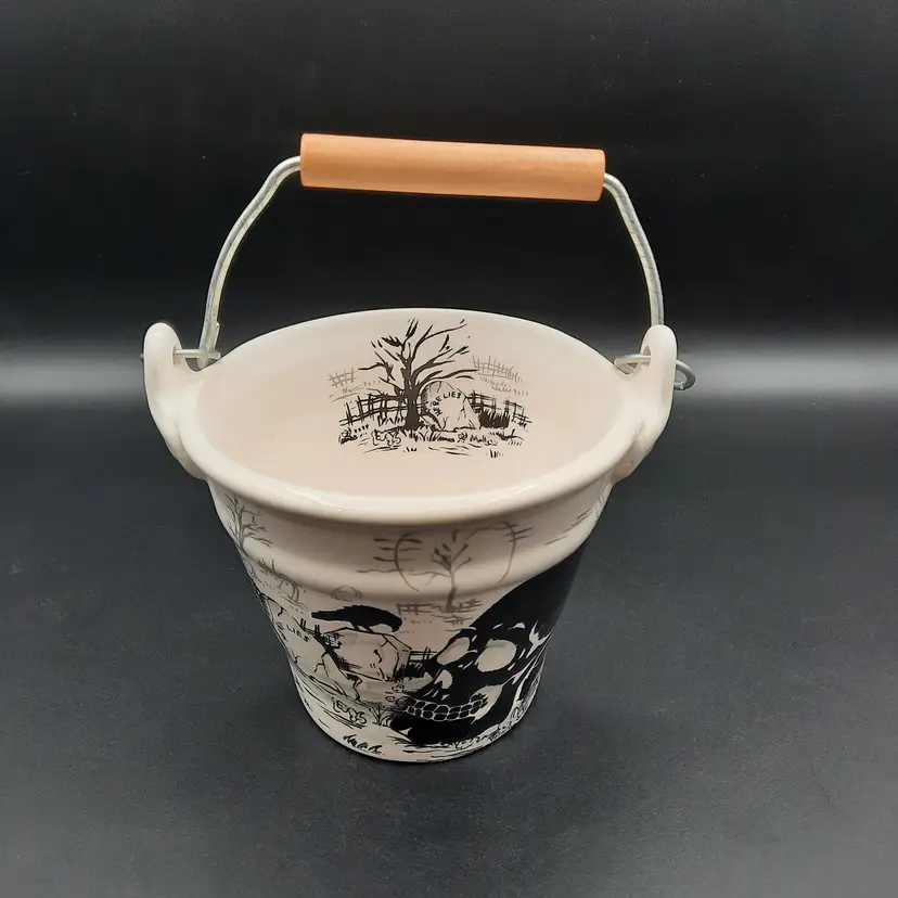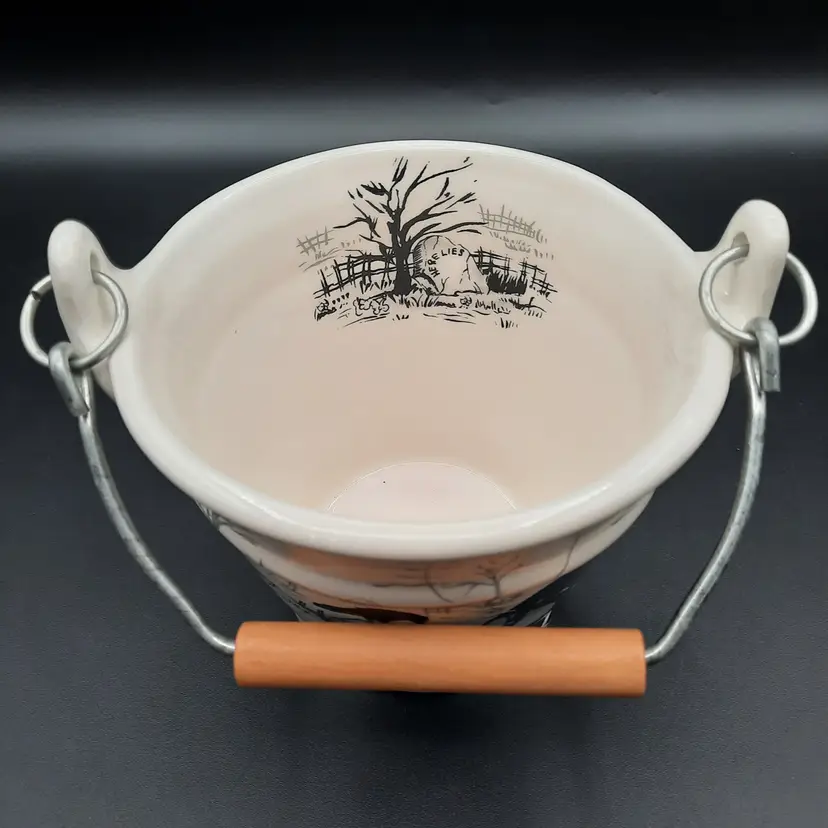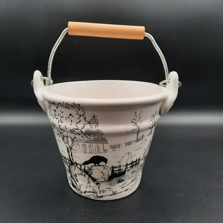 This fantastic bucket is ceramic with a wood and metal handle, 5"H x 6"W in great condition!