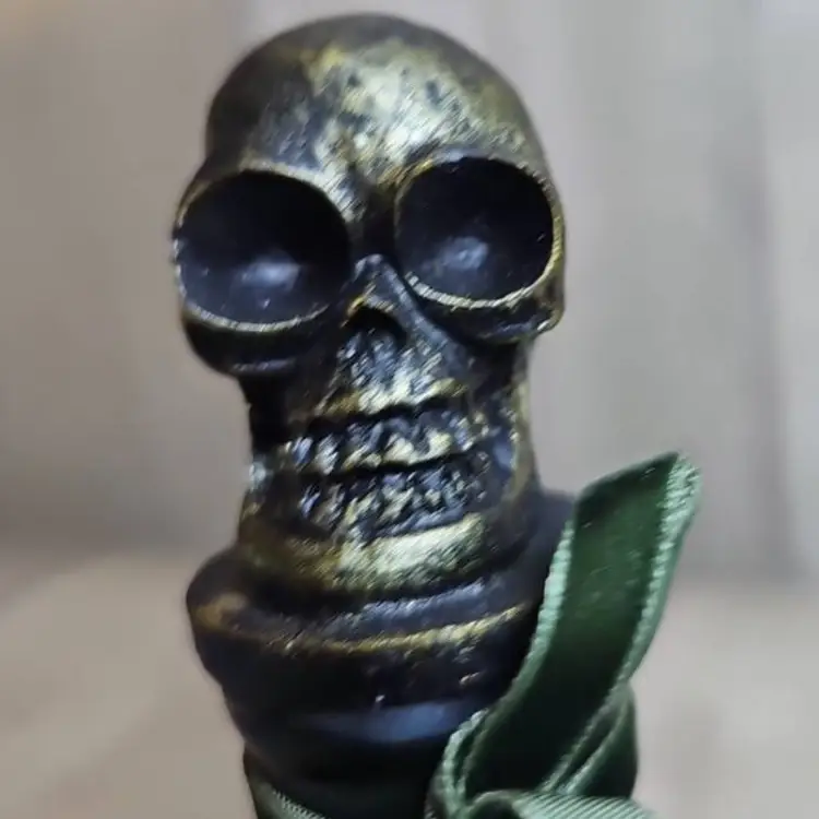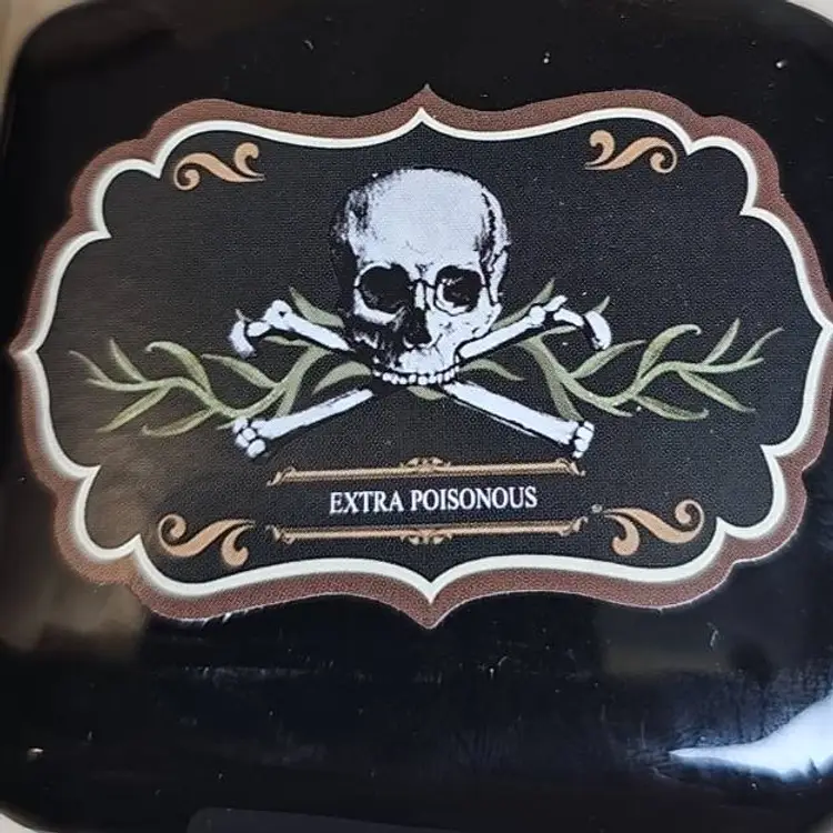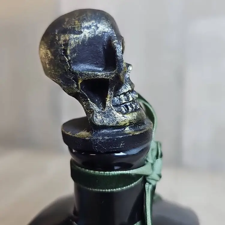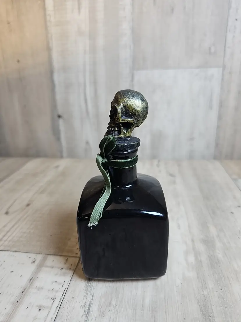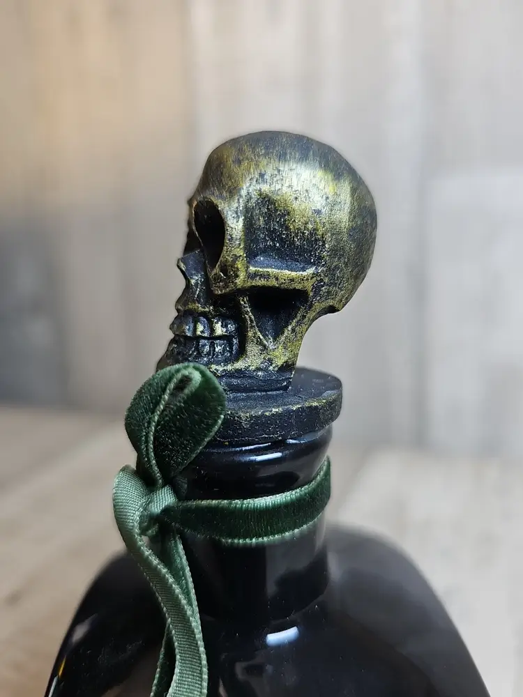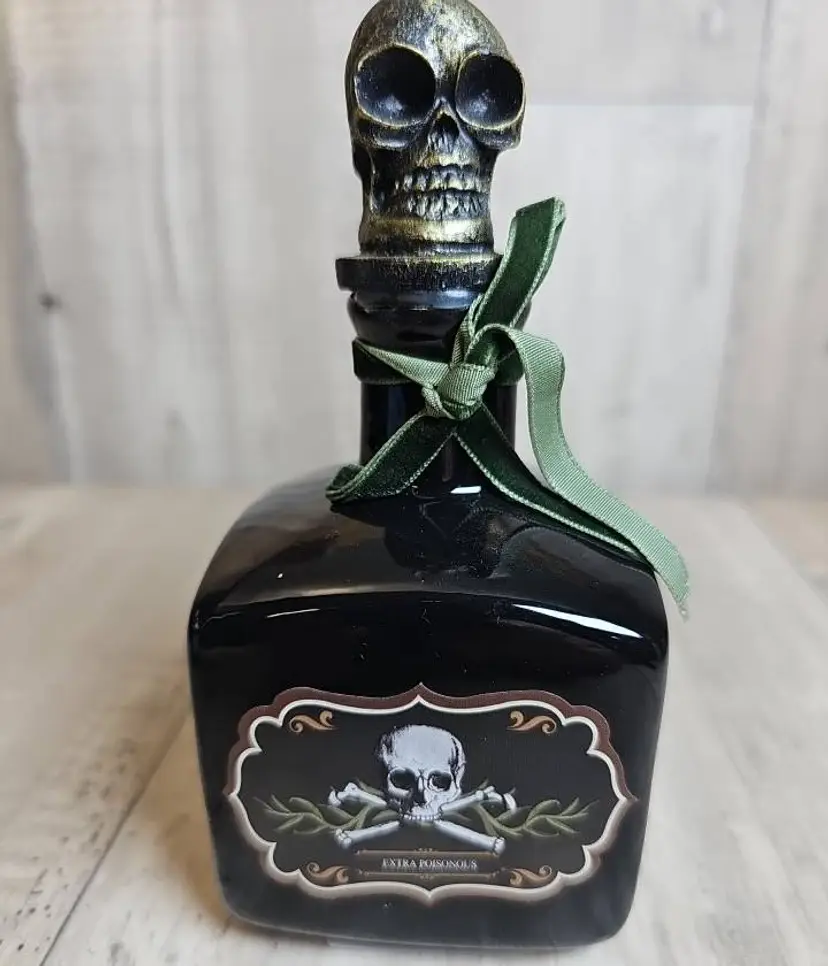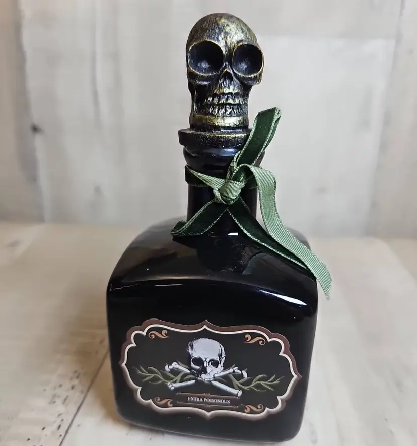 Spooky black glass bottle with an ornate skull stopper and green ribbon accent. Features a gothic “Extra Poisonous” poison label with skull & crossbones motif. Perfect as Halloween décor, haunted house display, or gothic apothecary prop.