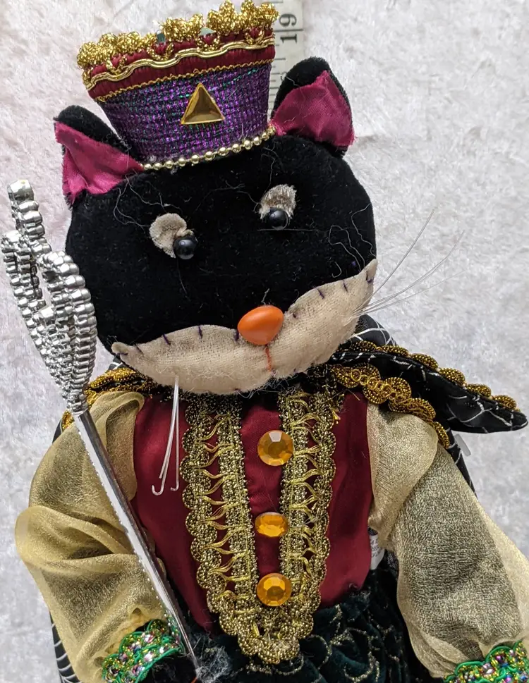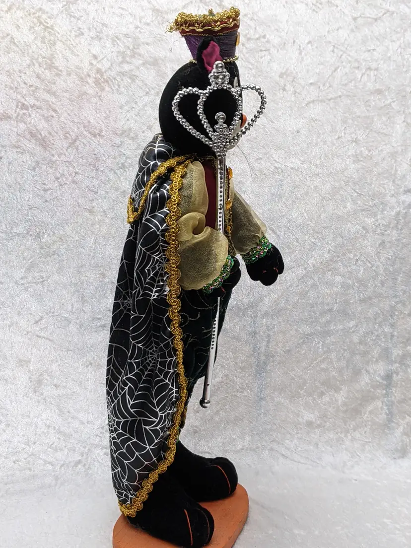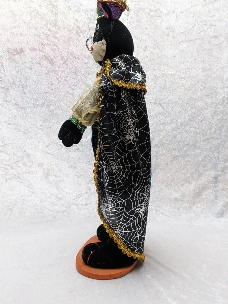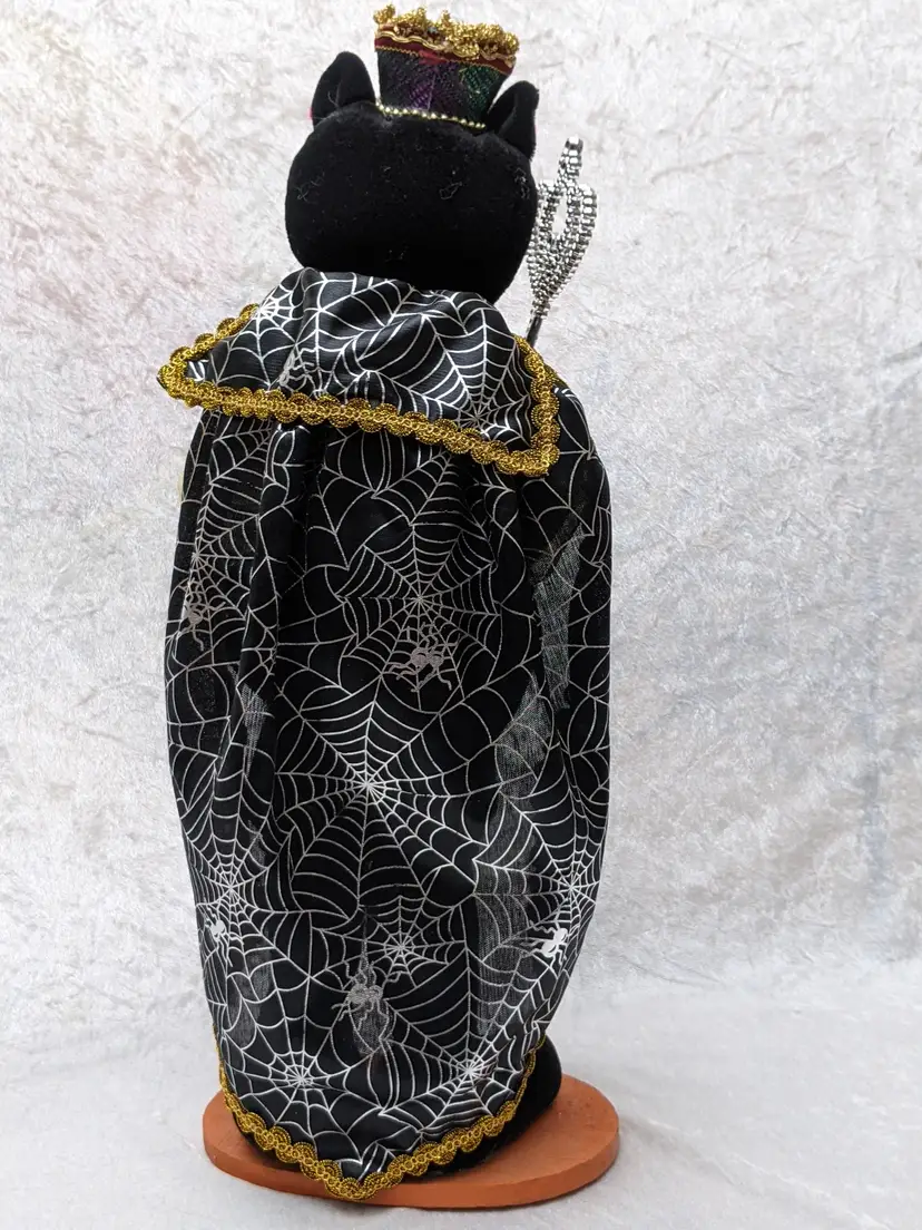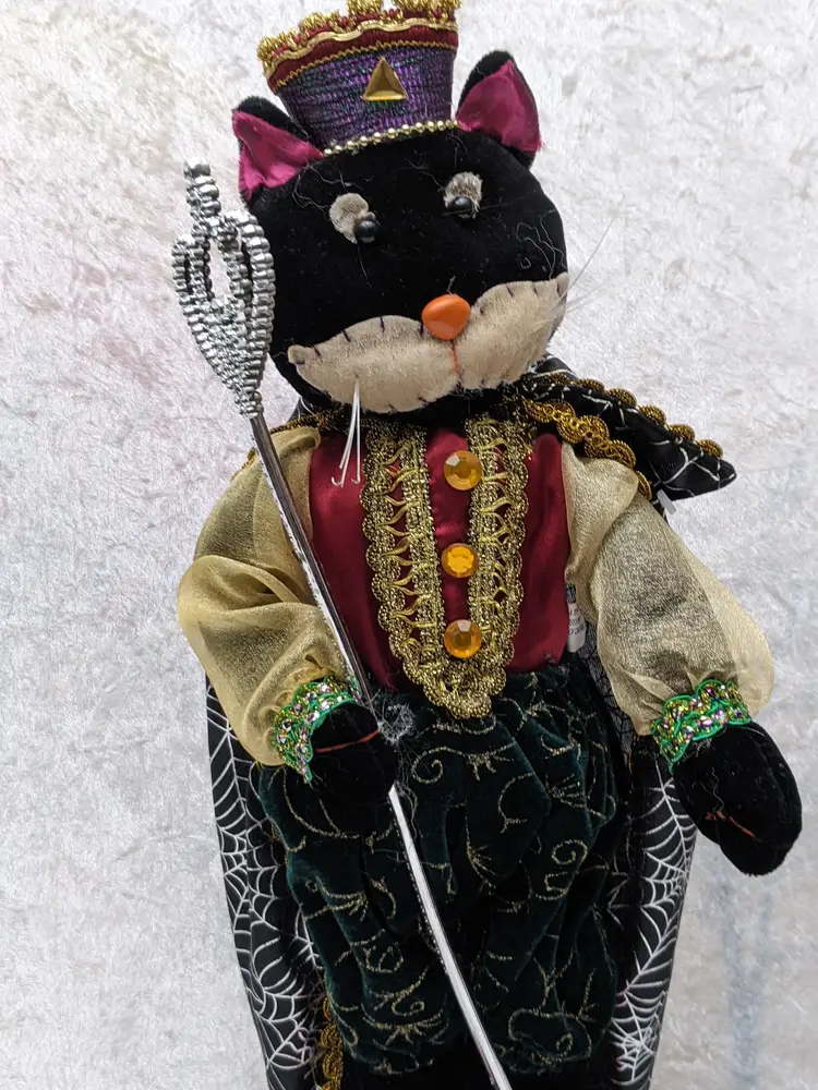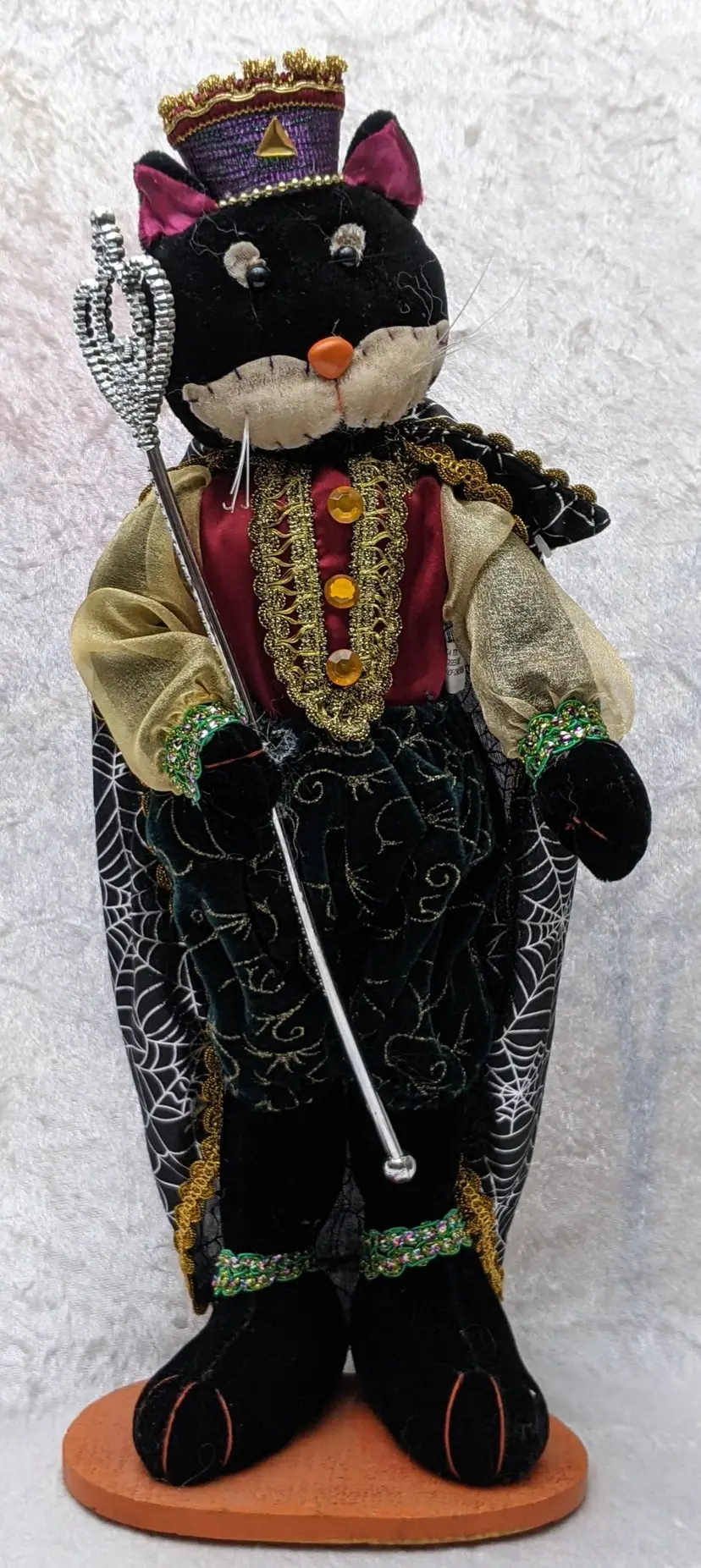 Halloween Black Cat Plush Royal Boy Doll Crown Sector He measures 19" tall and 8 in wide. King Kitty is dressed in rich velvet pants and fancy shirt ,Jewels and trim and a spider web cape. He has a crown and sector . He is on a orange wood stand. Witch Decor Great condition Clean with no damage. no weird smells. Please check the photos for details. Comes from a smoke free home. We do have pets. It is kept away from them