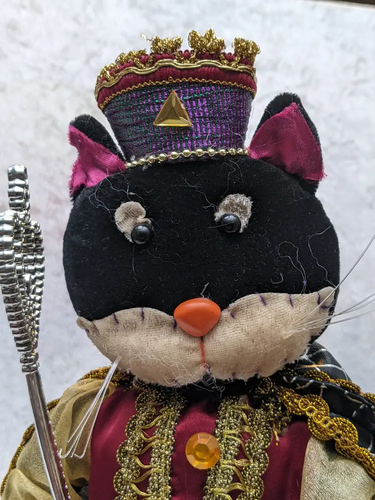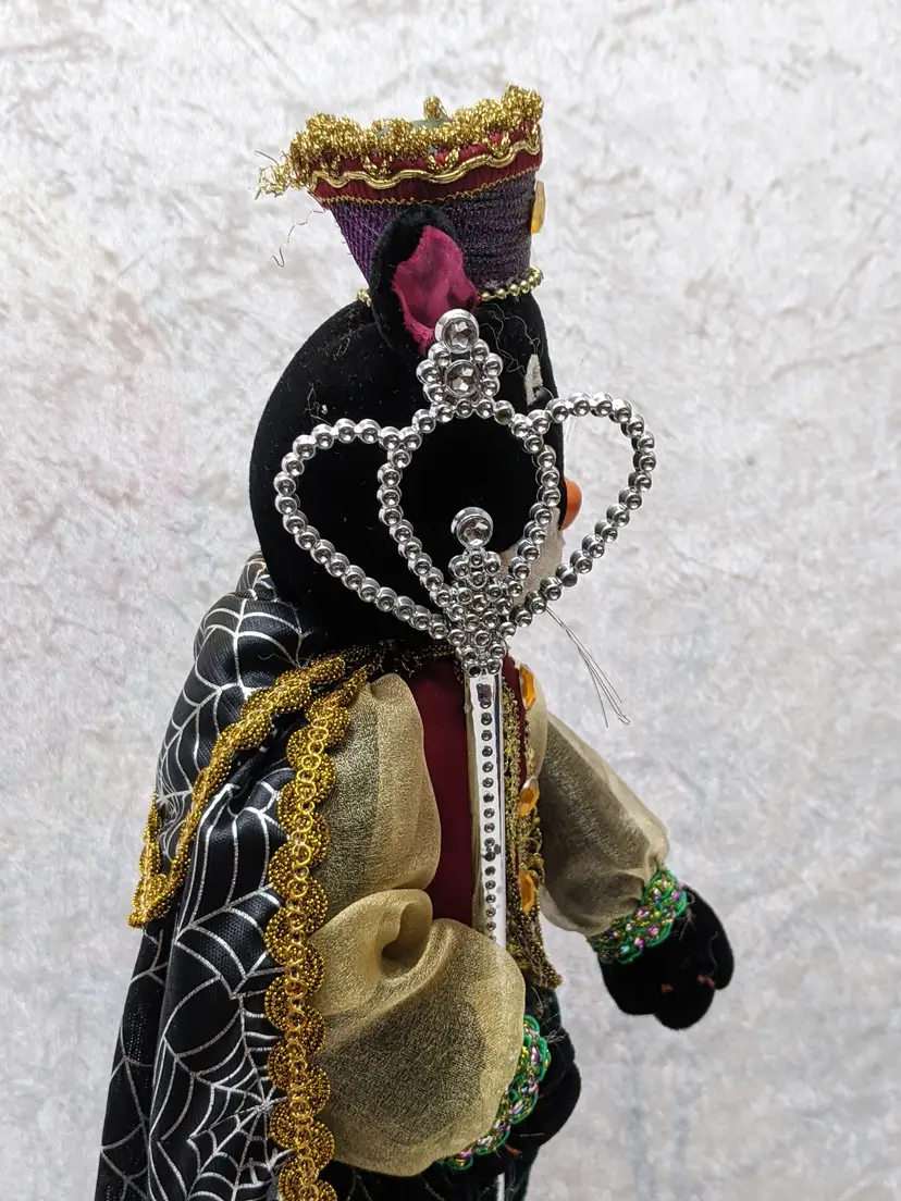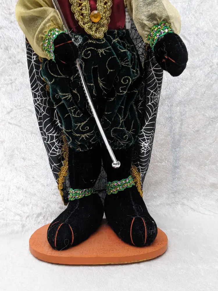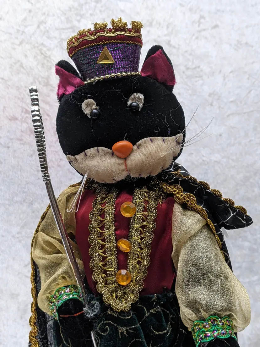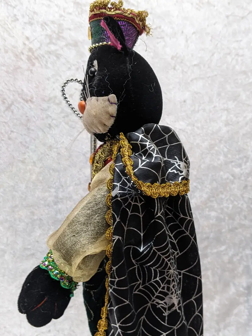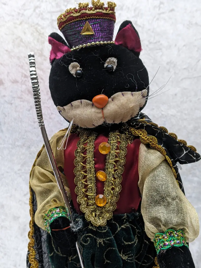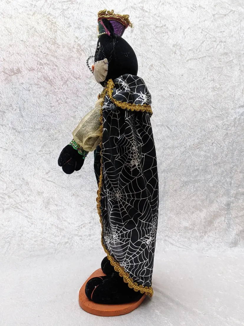 Halloween Black Cat Plush Royal Boy Doll Crown Sector He measures 19" tall and 8 in wide. King Kitty is dressed in rich velvet pants and fancy shirt ,Jewels and trim and a spider web cape. He has a crown and sector . He is on a orange wood stand. Witch Decor Great condition Clean with no damage. no weird smells. Please check the photos for details. Comes from a smoke free home. We do have pets. It is kept away from them