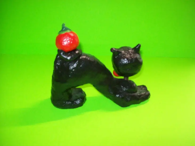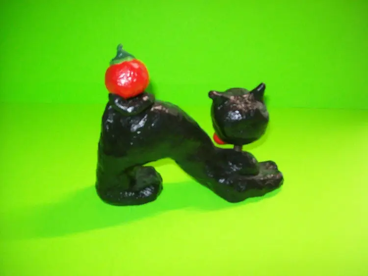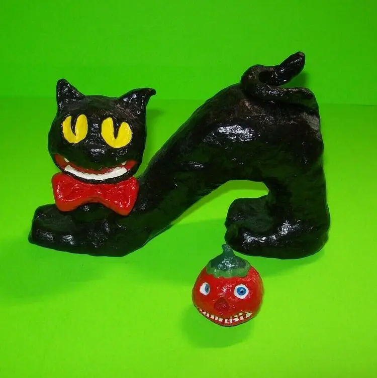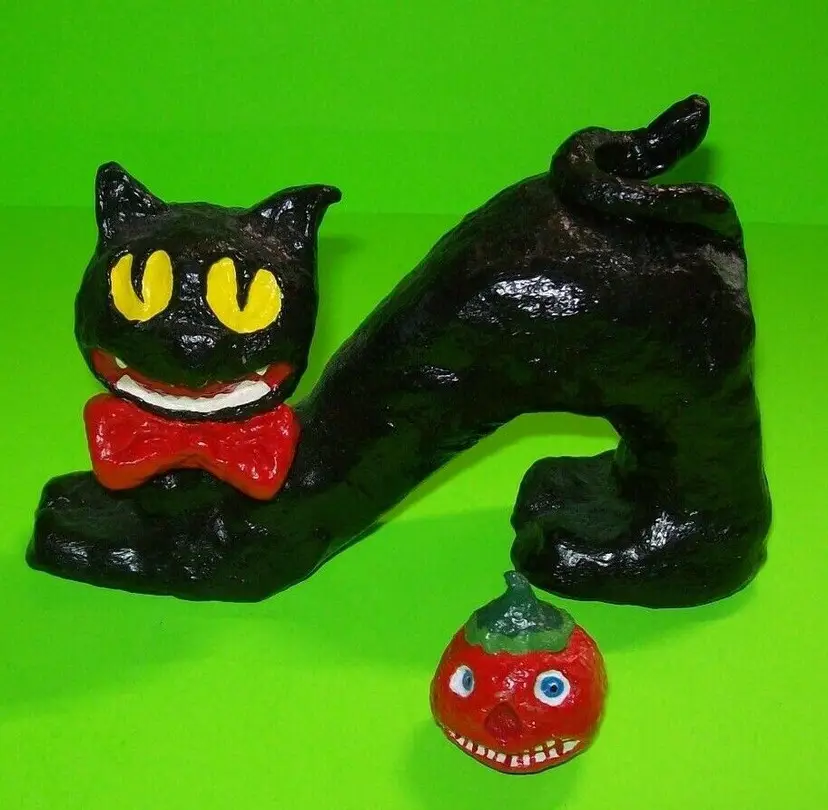 Very weird black cat composition hand painted by artist bobbin head nodder figure. The base is marked LJP and the date 01. A separate (not attached) JOL pumpkin is made to stand on the cats backside. Super clean condition. Size is 6.5" x 4" x 2".