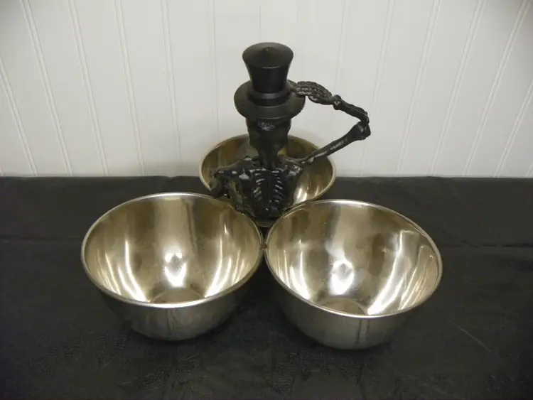 This piece is in great condition and would look great holding Halloween candy or other spooky treats. Approximately 9 inches tall and 12 inches with bowls.