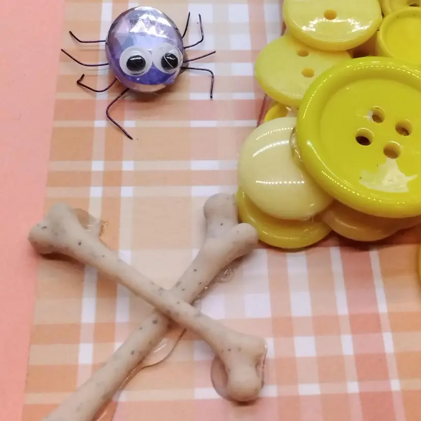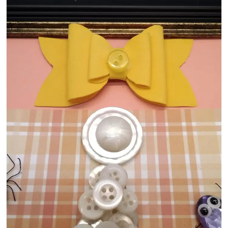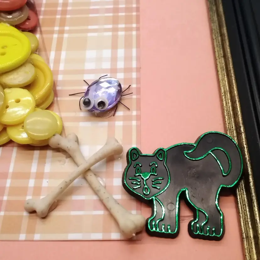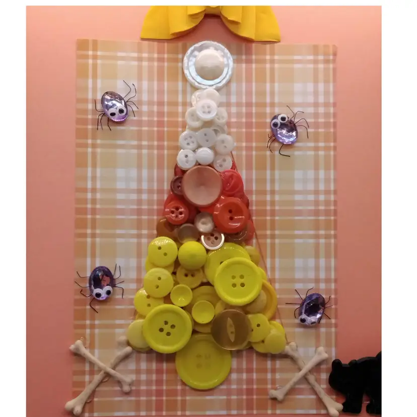 This Halloween-themed button art features a vibrant arrangement of buttons in the shape of candy corn, adorned with playful spider embellishments and bone accents., and a black cat. Perfect for adding a touch of festive charm to your home decor, this 8x10 frame piece is a fun and creative way to celebrate the season, ready to hang or flat surface display.