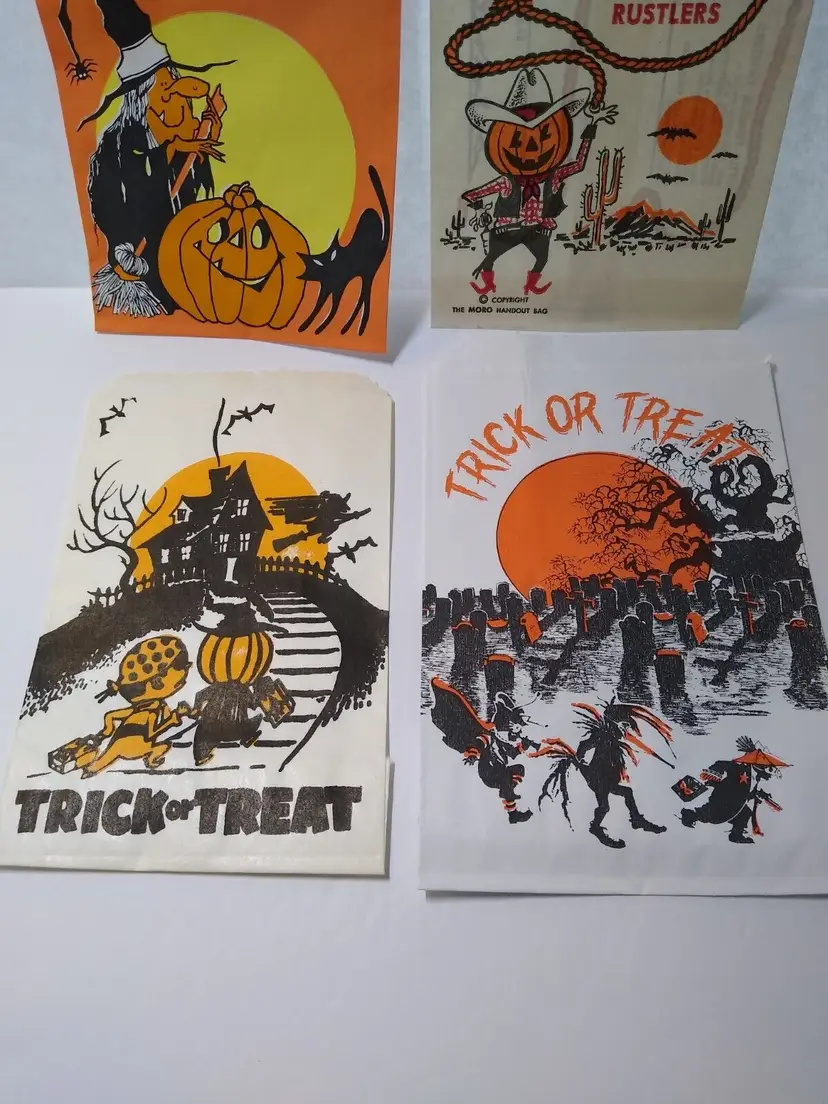 Nice set of (4) different new old stock vintage Halloween paper treat bags. Most look to date from the 1950's-1960's. Includes a hard to find anthropomorphic cowboy goblin in western attire made by Moro. They are 5.5"- 7.5" size. Unused condition with some wrinkles and light storage wear. Additional goodie bag sets for sale in our store. Stock #18