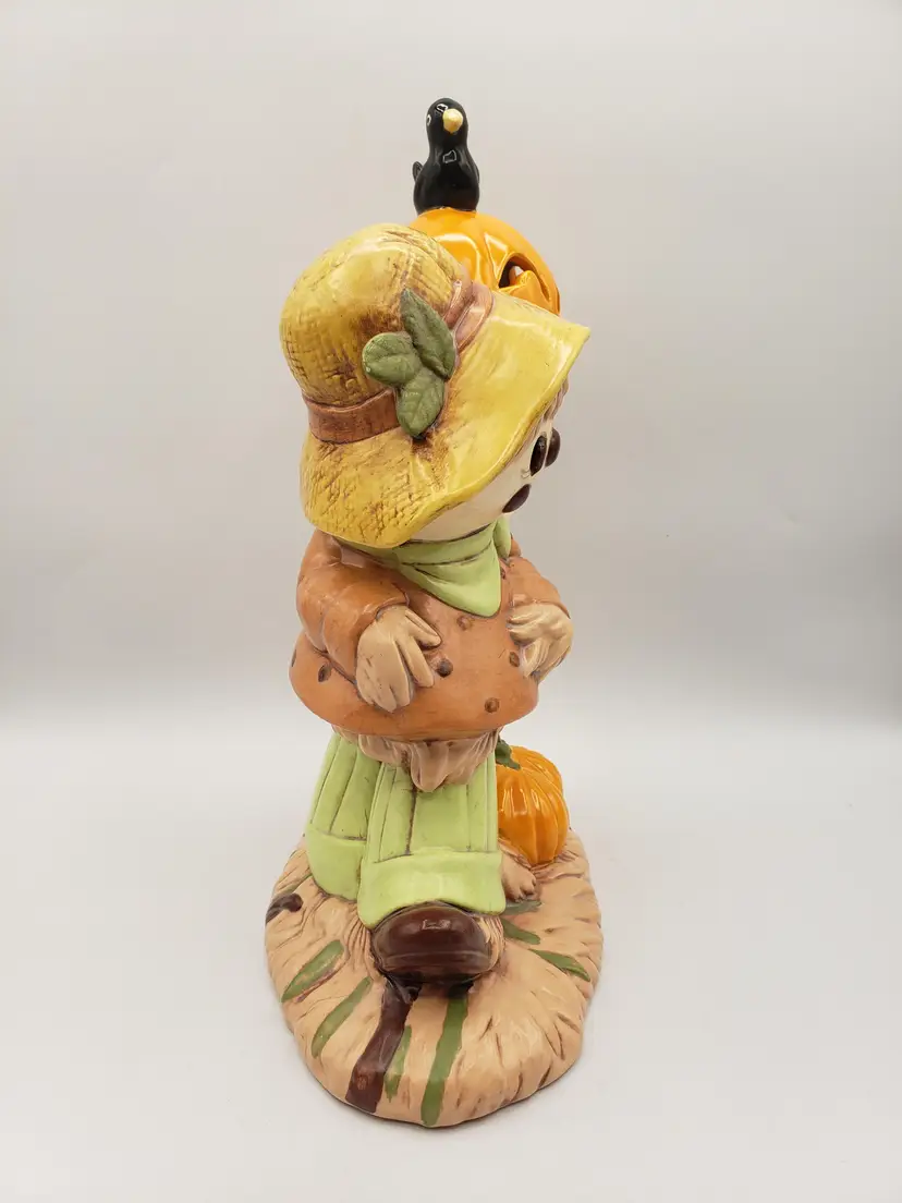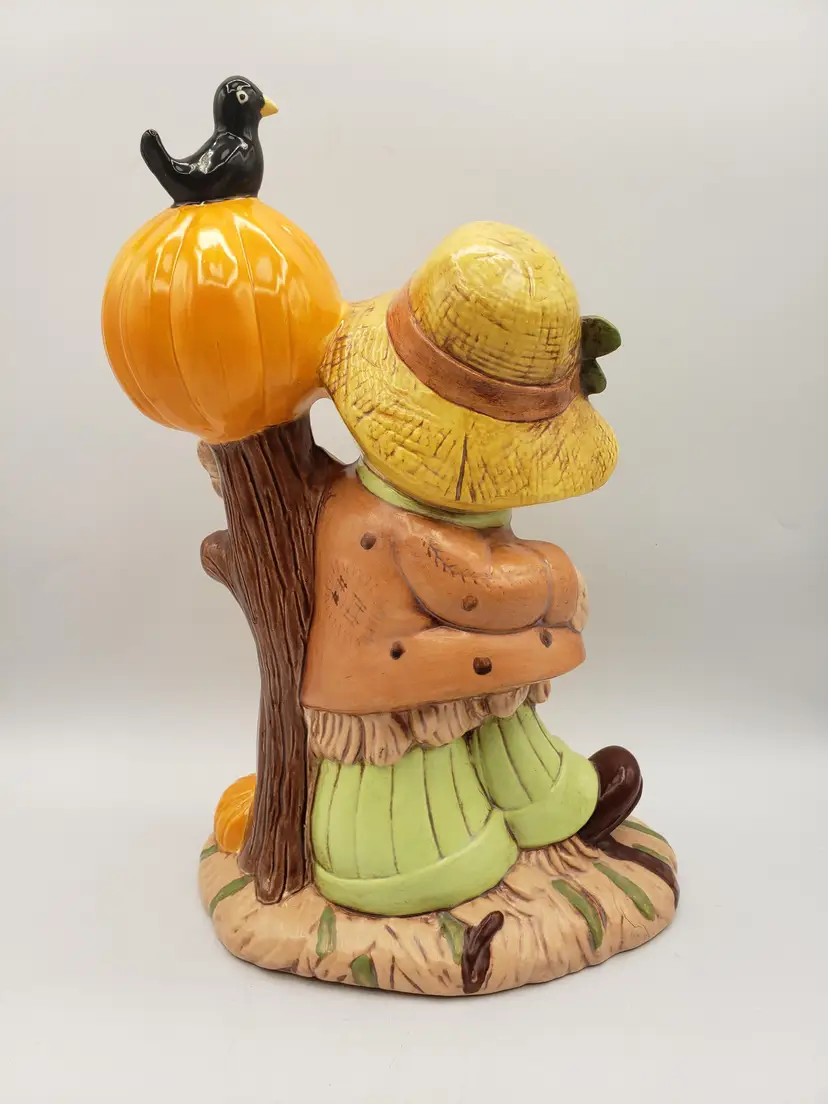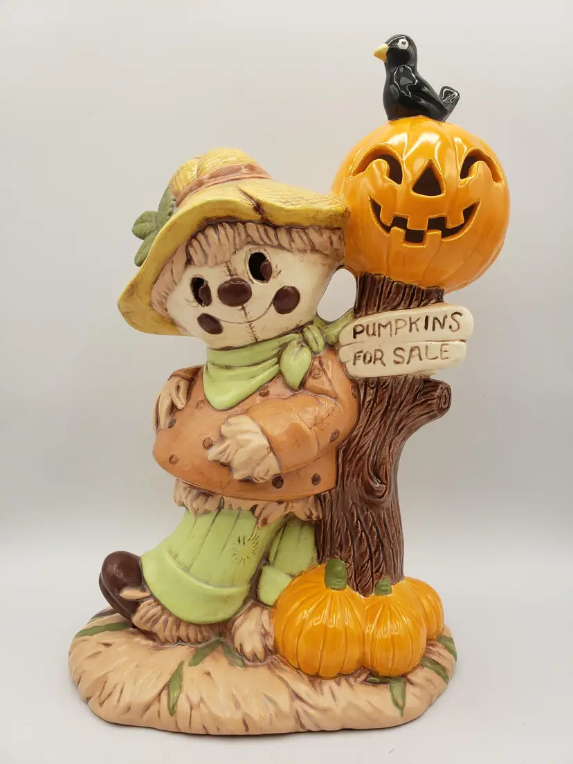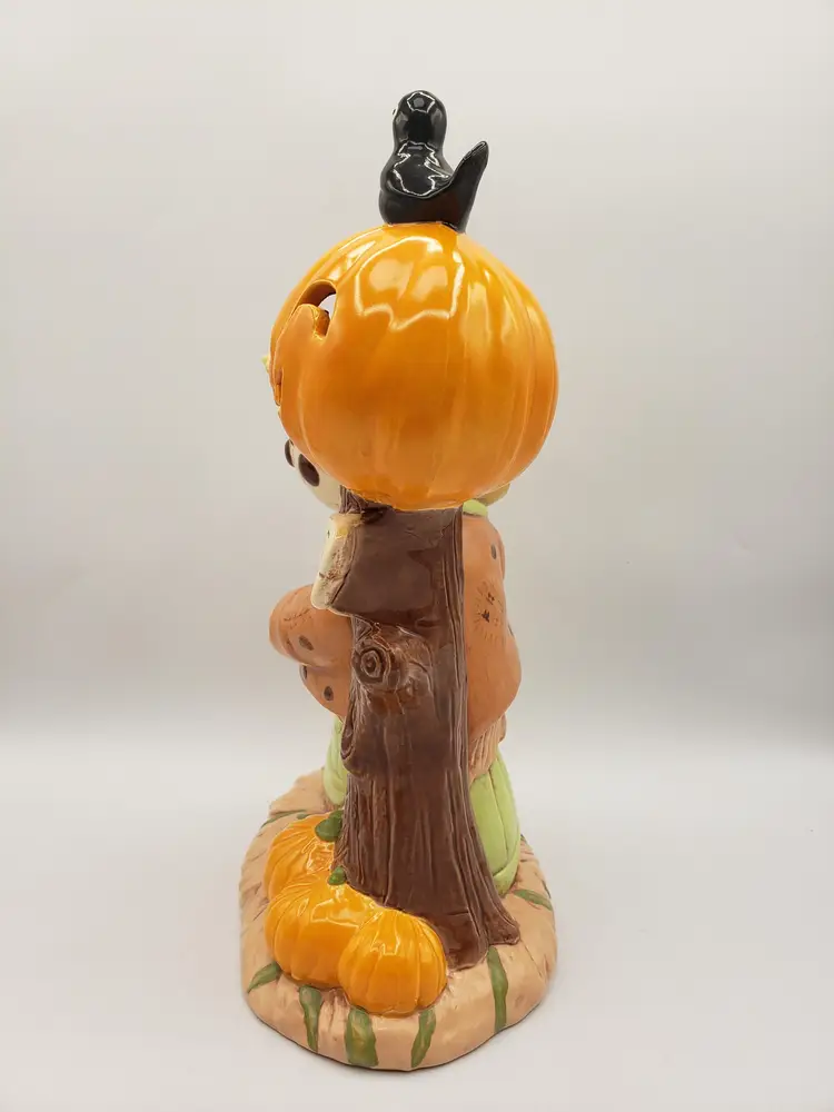 Halloween Ceramic Handpainted Scarecrow & Pumpkin Vintage 1980's Tealight Holder. Adorable fall decor! Features a scarecrow, a crow, a jack-o-lantern, and pumpkins. This is a mold that was handpainted in the 1980's and 1990's. Skillfully painted! Measures 12" high, 7.75" long and 5" deep. Perfect for putting tealights under and watching them flicker through the faces. FLAW: a few, small cracks in one corner.