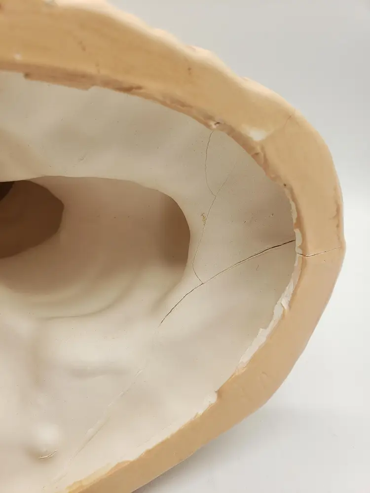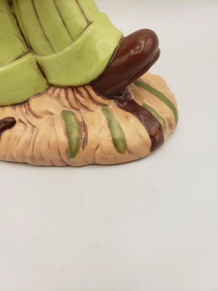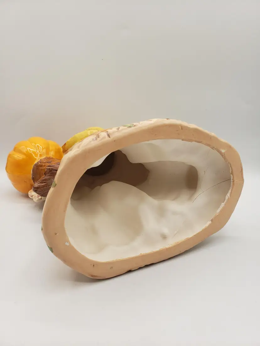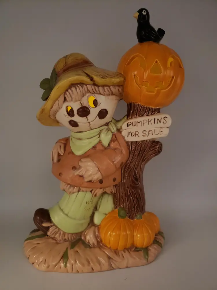 Halloween Ceramic Handpainted Scarecrow & Pumpkin Vintage 1980's Tealight Holder. Adorable fall decor! Features a scarecrow, a crow, a jack-o-lantern, and pumpkins. This is a mold that was handpainted in the 1980's and 1990's. Skillfully painted! Measures 12" high, 7.75" long and 5" deep. Perfect for putting tealights under and watching them flicker through the faces. FLAW: a few, small cracks in one corner.