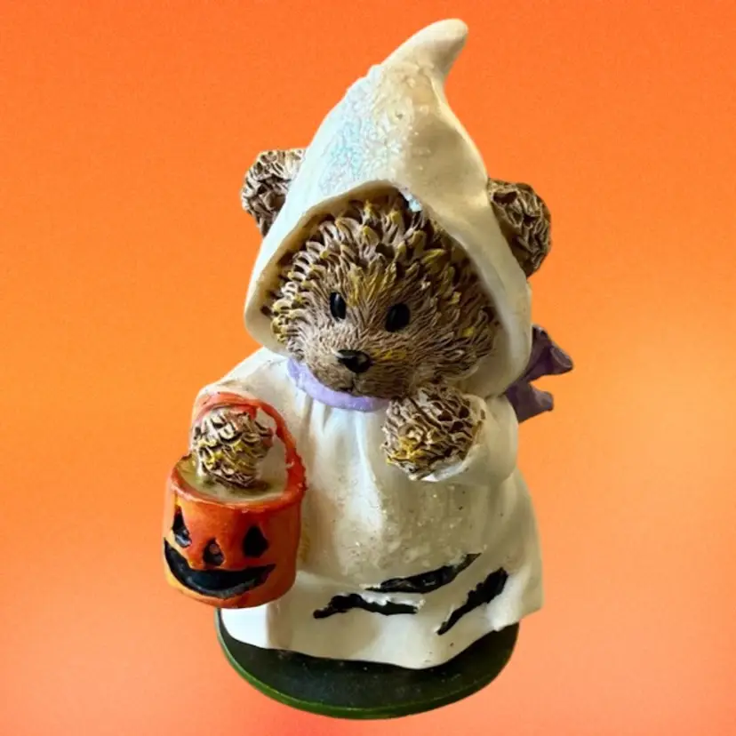 This is a Gallerie II Bear Ghost Costume Holding Jack-O-Lantern Figurine.